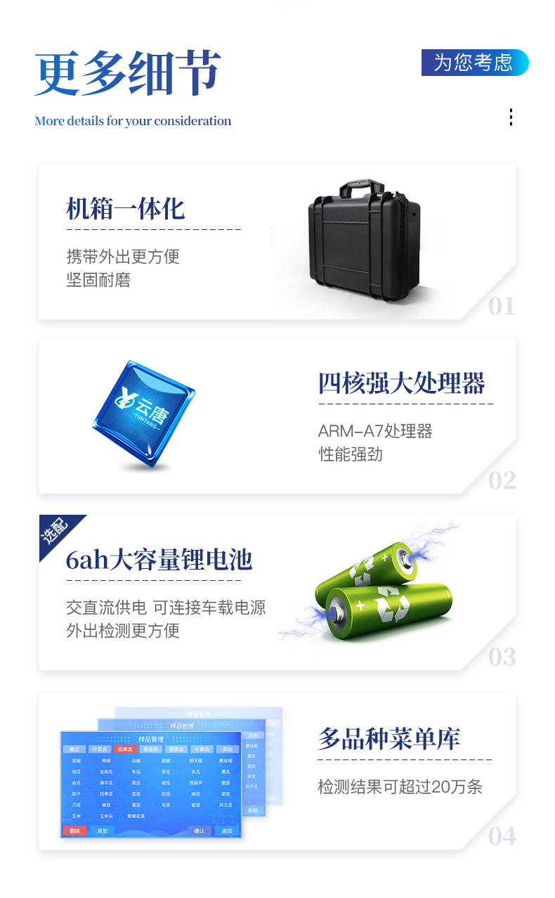 随着人民生活水平的不断提升,市场对茶叶的把控愈加严格。针对现状,我司专门研发生产--茶叶专用的农药残留速测仪;定位茶农、茶商、茶叶企业使用。 此外还可用于果蔬茶生产基地和农贸批发销售市场现场检测,餐馆、学校、食堂、家庭果蔬加工前的安全速测等。 | 检测通道: 12个检测通道,可以同时测试多个样品,每个样品由程序控制分别独立工作,不会互相干扰。 | 显示方式:≥5英寸液晶触摸屏显示,人性化中文操作界面,读数直观、简单。 | 配备嵌入式高速热敏打印机,可选择手动打印或者自动打印,三分钟出打印结果。 | 光源采用进口超高亮发光二极管,具有低功耗、稳定性强、高灵敏度,高检测精度,高重复性精度,光源可控、响应速度快等优点。 | 采用标准USB接口设计,免驱动安装,方便数据的存贮和移动,并可随时与计算机直接相连,并且可用计算机控制仪器。实现数据查询、浏览、分析、统计、打印等。 | 智能化程度高,仪器具有自检功能:具有开机自检和调零功能,具有自动检测重复性功能 | 内置强大的数据库,可在仪器上直接选择样品名称、检测指标、送检单位等信息,也可在仪器上直接编辑录入样品名称、检测指标、送检单位等信息并保存进样品数据库。 | 支持Wifi网络,数据可局域网和互联网数据上传,检测结果直接传至食品安全监管平台。进行区域食品安全监管及大数据分析处理,检测区域食品安全长短期动态,达到食品安全问题预估、预警 |