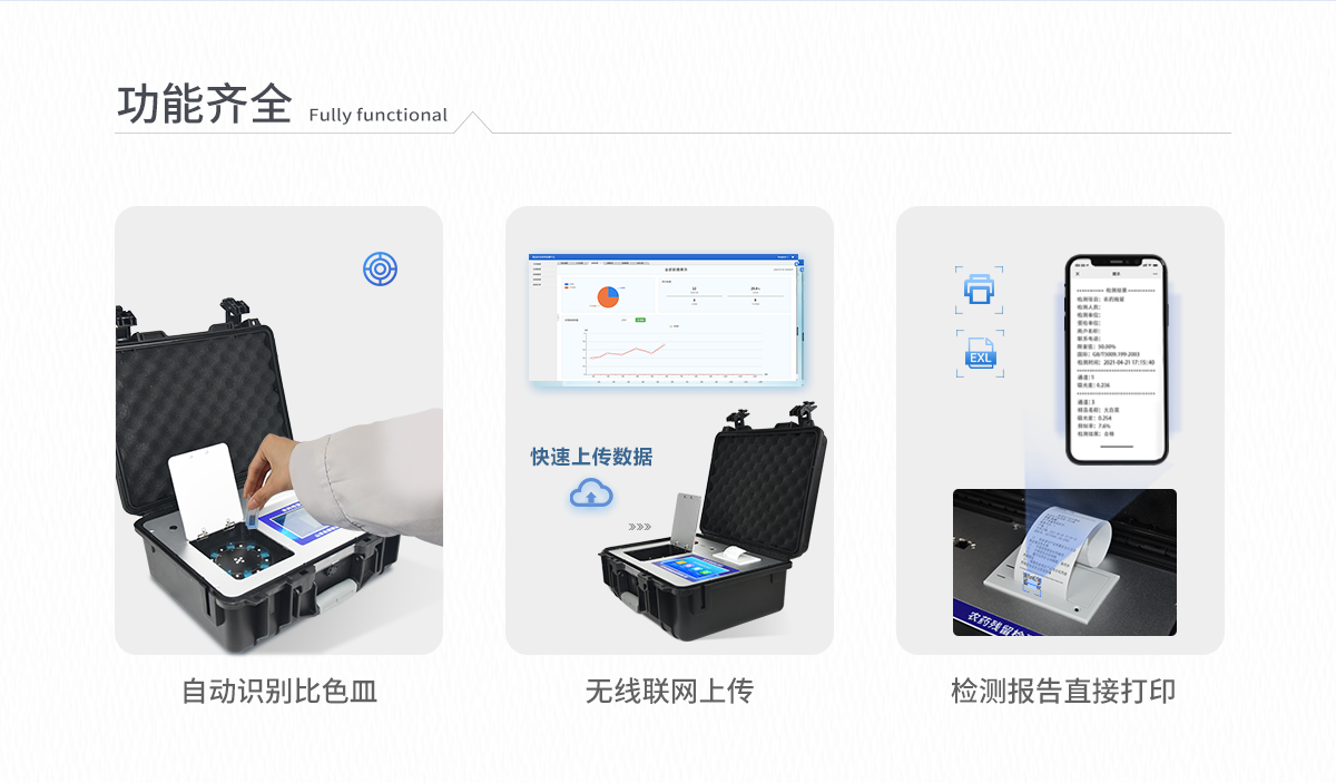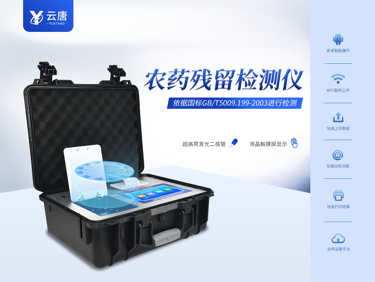 安卓智能操作系统,采用更加**和人性化操作,仪器具有无线联网上传功能,快速上传数据,进行数据统计和分析。 | 智能化程度高,仪器具有自检功能:具有开机自检和调零功能,具有自动检测重复性功能;同时,检测完成可自动打印检测报告和二维码。手机扫码可显示出详细检测信息。 | 仪器带有监管平台,数据可局域网和互联网数据上传,检测结果直接传至食品安全监管平台。进行区域食品安全监管及大数据分析处理与数据统计,检测区域食品安全长短期动态,达到食品安全问题预估、预警 。 | 样品处理简单省力,整体操作快速、安全、便捷。 | 仪器具有自身保护功能,可设置用户名及密码,防止非工作人员操作等。 | 内置强大的数据库,可在仪器上直接选择样品名称、检测指标、送检单位等信息,也可在仪器上直接编辑录入样品名称、检测指标、送检单位等信息并保存进样品数据库,方便后期操作调取使用。 | 仪器具有重新校准、锁定、恢复出厂设置功能。 |