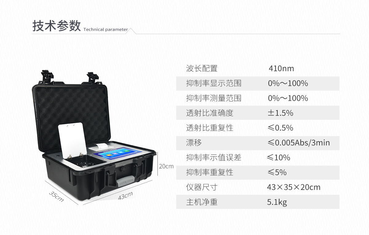 410nm | 0%~100% | 0%~100% | ±1.5% | ≤0.5% | ≤0.005Abs/3min | ≤10% | ≤5% | 43×35×20cm | 5.1kg |
