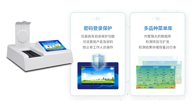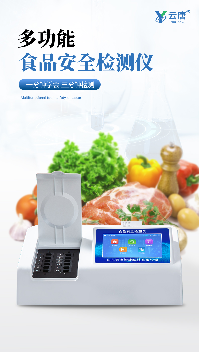 安卓智能操作系统,采用更加**和人性化操作,仪器具有网线连接、wifi联网上传、GPRS无线远传功能,快速上传数据。 | 智能化程度高,仪器具有自检功能:具有开机自检和调零功能,具有自动检测重复性功能。 | 检测通道:≥12个检测通道,可以同时测试多个样品,每个样品由程序控制分别独立工作,不会互相干扰。 | 显示方式:≥8英寸液晶触摸屏显示,人性化中文操作界面,读数直观、简单。 | 配备新一代嵌入式热敏打印机,可选择手动打印或者自动打印,检测完成可自动打印检测报告和二维码。 | 光源采用进口超高亮发光二极管,高精度、稳定性强、光源可控、可以关掉不使用的光源,功耗更低。 | 采用USB2.0接口设计,方便数据的存贮和移动,并可随时与计算机直接相连,并且可用计算机控制仪器。实现数据查询、浏览、分析、统计、打印等。 | 仪器带有监管平台。数据可局域网和互联网数据上传,检测结果直接传至食品安全监管平台。进行区域食品安全监管及大数据分析处理,检测区域食品安全长短期动态,达到食品安全问题预估、预警 | 一体化便携式快检设备,满足现场及流动检测使用需求,能够在同一软件下实现所有检测项目的检测,并可通过同一窗口直观显示检测结果。 | 仪器具有多品类多种类样品菜单库,可灵活选择检测样品,不同的检测通道可同时检测不同的样品项目。也可在仪器上直接编辑录入样品名称、检测指标、送检单位等信息并保存进样品数据库。 | 样品处理简单省力,整体操作快速、安全、便捷。 | 仪器具有自身保护功能,可设置用户名及密码,防止非工作人员操作等。 | 高灵敏度,高检测精度,高重复性精度,扫描式高精度光学传感器。 | 内置强大的数据库,可在仪器上直接选择样品名称、检测指标、送检单位等信息,也可在仪器上直接编辑录入样品名称、检测指标、送检单位等信息并保存进样品数据库。 | 仪器具有重新校准、锁定、恢复出厂设置功能。 | 支持U盘存储。 结果判定线可修改,对照值标定值可保存,断电不丢失数据。 |