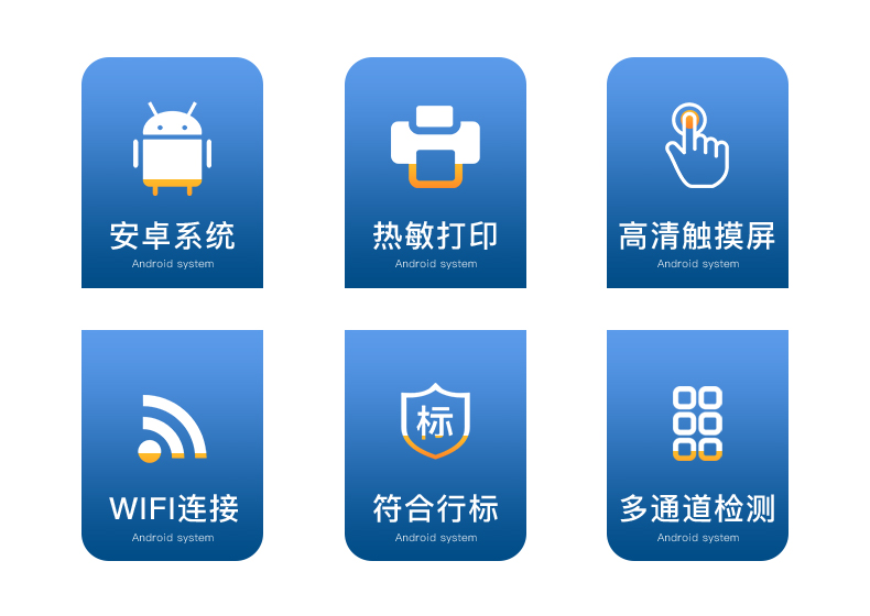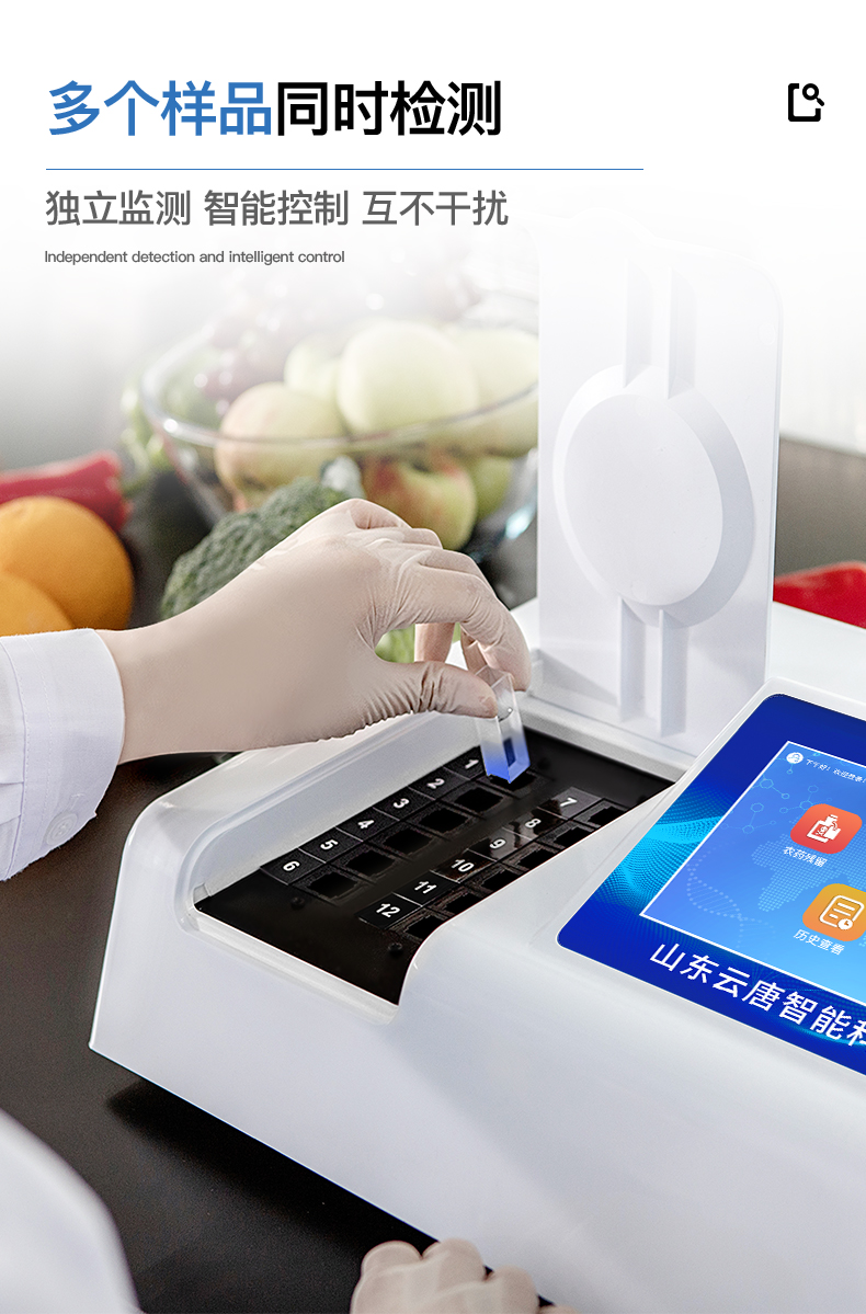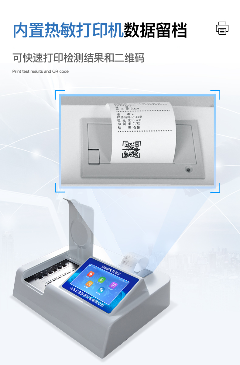 安卓智能操作系统,采用更加**和人性化操作,仪器具有网线连接、wifi联网上传、GPRS无线远传功能,快速上传数据。 | 智能化程度高,仪器具有自检功能:具有开机自检和调零功能,具有自动检测重复性功能。 | 检测通道:≥12个检测通道,可以同时测试多个样品,每个样品由程序控制分别独立工作,不会互相干扰。 | 显示方式:≥8英寸液晶触摸屏显示,人性化中文操作界面,读数直观、简单。 | 配备新一代嵌入式热敏打印机,可选择手动打印或者自动打印,检测完成可自动打印检测报告和二维码。 | 光源采用进口超高亮发光二极管,高精度、稳定性强、光源可控、可以关掉不使用的光源,功耗更低。 | 采用USB2.0接口设计,方便数据的存贮和移动,并可随时与计算机直接相连,并且可用计算机控制仪器。实现数据查询、浏览、分析、统计、打印等。 | 仪器带有监管平台。数据可局域网和互联网数据上传,检测结果直接传至食品安全监管平台。进行区域食品安全监管及大数据分析处理,检测区域食品安全长短期动态,达到食品安全问题预估、预警 | 一体化便携式快检设备,满足现场及流动检测使用需求,能够在同一软件下实现所有检测项目的检测,并可通过同一窗口直观显示检测结果。 | 仪器具有多品类多种类样品菜单库,可灵活选择检测样品,不同的检测通道可同时检测不同的样品项目。也可在仪器上直接编辑录入样品名称、检测指标、送检单位等信息并保存进样品数据库。 | 样品处理简单省力,整体操作快速、安全、便捷。 | 仪器具有自身保护功能,可设置用户名及密码,防止非工作人员操作等。 | 高灵敏度,高检测精度,高重复性精度,扫描式高精度光学传感器。 | 仪器具有重新校准、锁定、恢复出厂设置功能。 | 支持U盘存储。 结果判定线可修改,对照值标定值可保存,断电不丢失数据。 |
