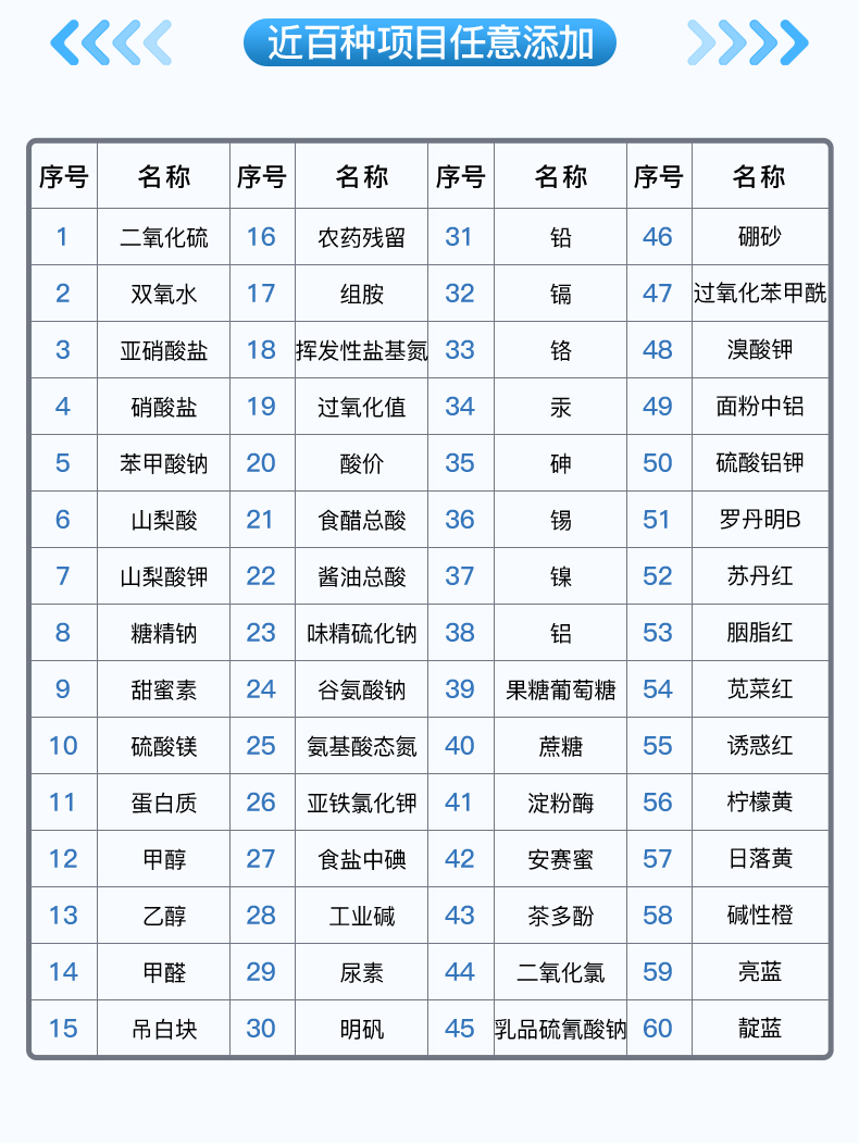 可快速检测各类食品中的甲醛、吊白块、二氧化硫、亚硝酸盐、双氧水、硼砂、农药残留、乳及乳制品中蛋白质、硝酸盐、重金属铅的含量,仪器预留其他项目检测程序和端口,根据日后需求可方便的自主增加检测项目。