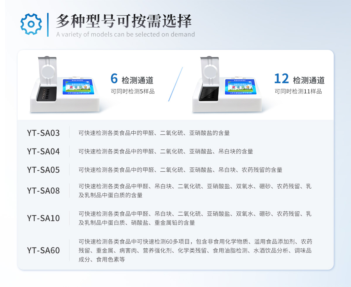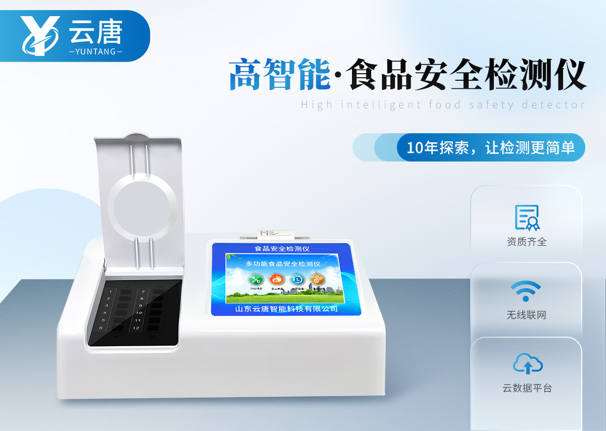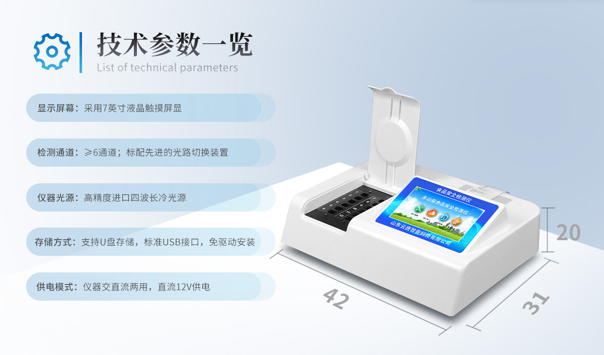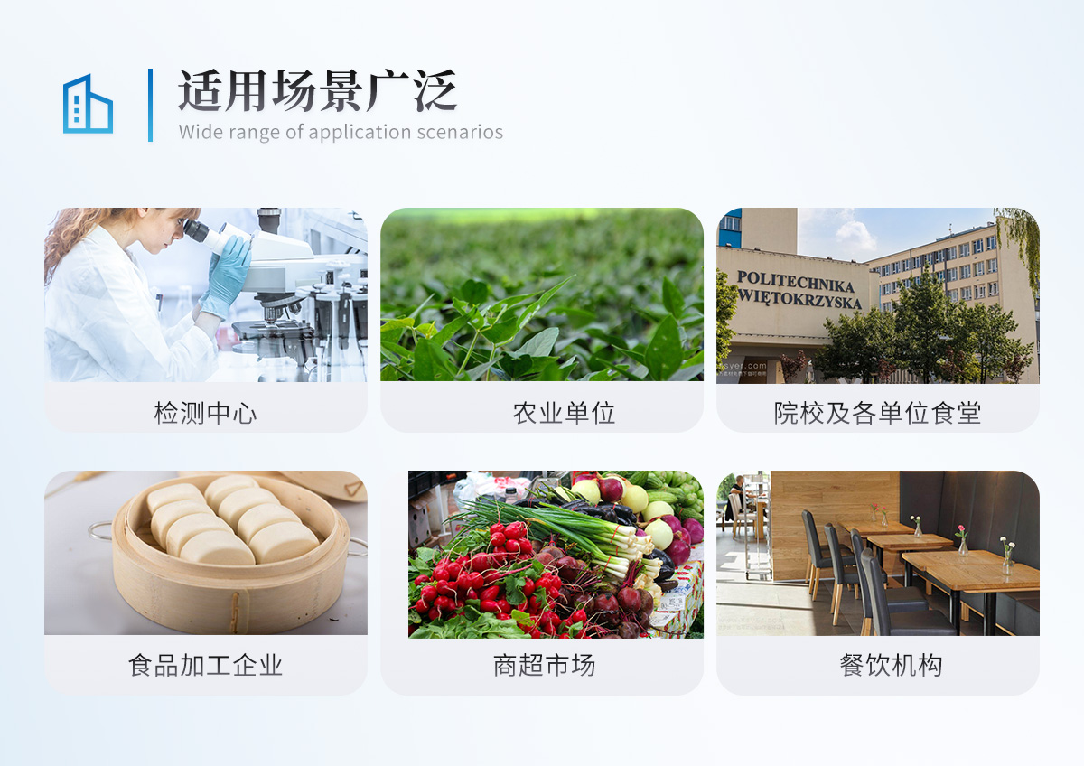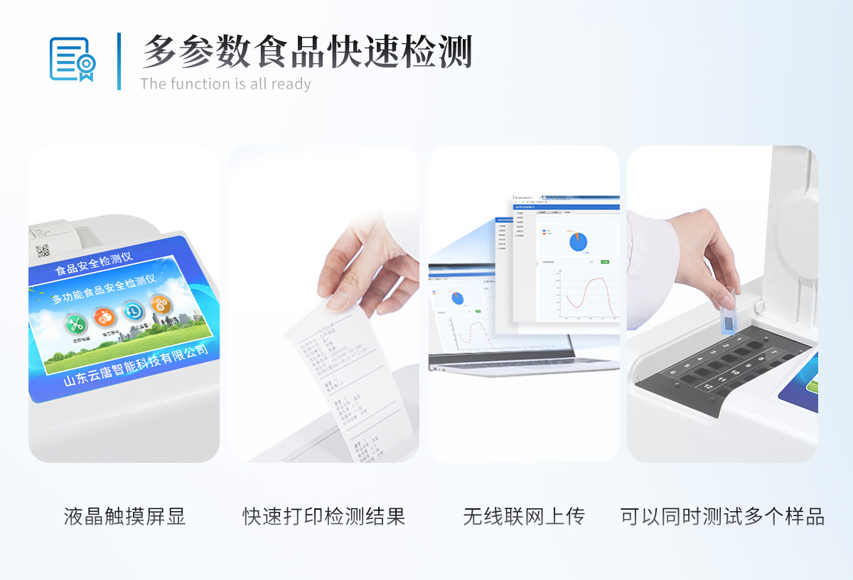 可快速检测各类食品中的甲醛、吊白块、二氧化硫、亚硝酸盐、双氧水、硼砂、农药残留、乳及乳制品中蛋白质、硝酸盐、重金属铅的含量,仪器预留其他项目检测程序和端口,根据日后需求可方便的自主增加检测项目。