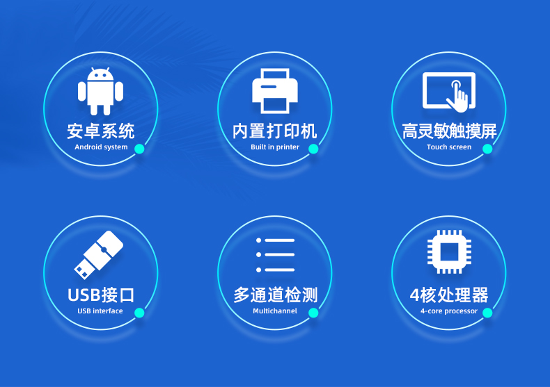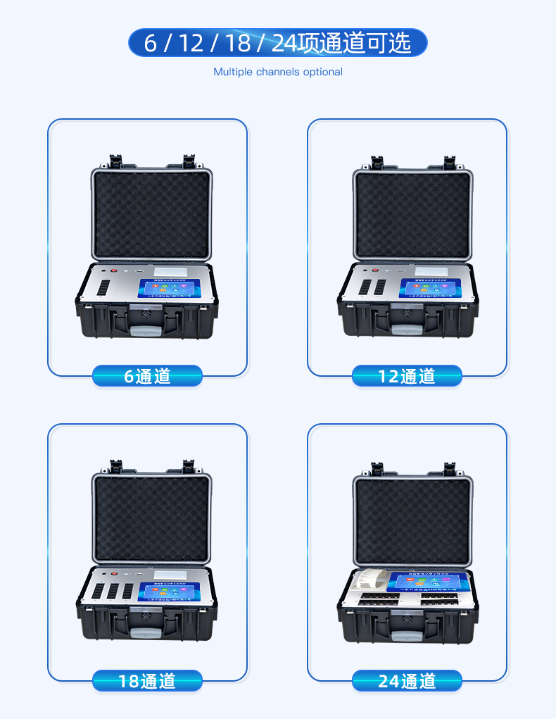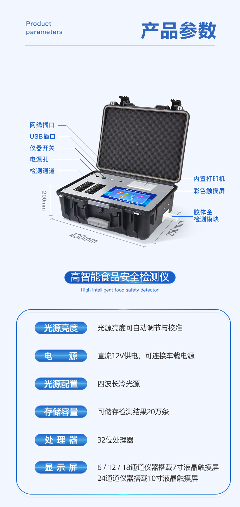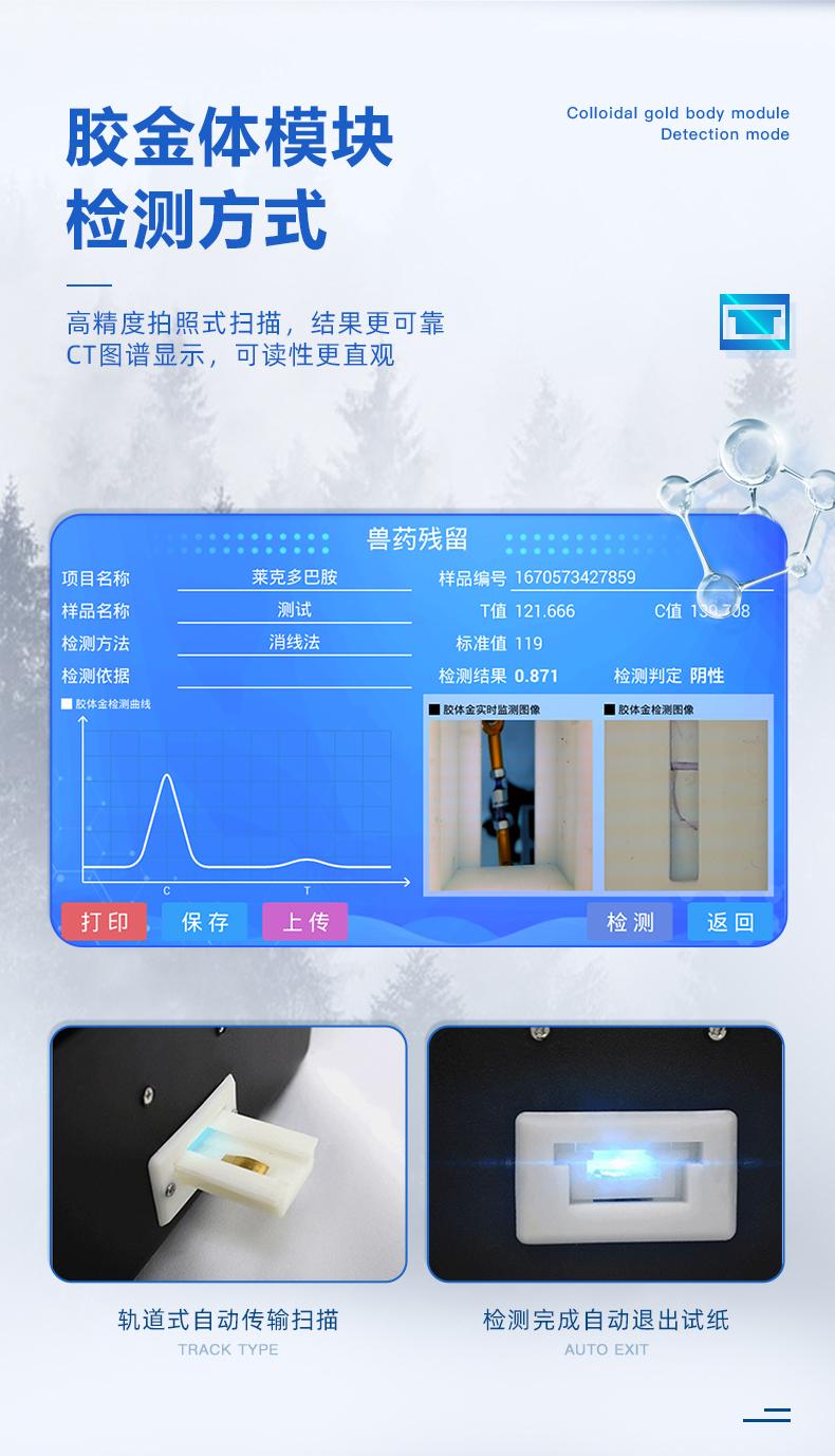 安卓智能操作系统,采用更加**的UI交互界面,仪器具有wifi联网上传、4G联网传输、GPRS无线远传、网线连接功能,快速批量上传数据。 | 智能化程度高,仪器具有自检功能:具有开机自检和调零功能,具有自动检测重复性功能。 | 新一代高速热敏打印机,检测完成可自动打印或批量打印检测报告和二维码。 | 仪器带有监管平台,数据可局域网和互联网数据上传,检测结果直接传至食品安全监管平台。进行区域食品安全监管及大数据分析处理与数据统计,检测区域食品安全长短期动态,达到食品安全问题预估、预警 | 一体化主机,包含食品安全检测模块、多通道农药残留检测模块、胶体金免疫层析检测模块。 | 一体化便携式快检设备,满足现场及流动检测使用需求,能够在同一软件下实现所有检测项目的检测,并可通过同一窗口直观显示检测结果。 | 胶体金模块检测方式:轨道式自动传输扫描,检测完成后自动退出检测卡。 | CT线自动识别,无需手动调整。 | 内置强大的数据库,具有多品类多种类样品菜单功能,可灵活选择检测样品,不同的检测通道可同时检测不同的样品项目。也可在仪器上直接编辑录入样品名称、检测指标、送检单位等信息并保存进样品数据库。 | 产品内置操作演示视频,是您身边的化验指导专家。 | 样品处理简单省力,整体操作快速、安全、便捷。 | 仪器具有自身保护功能,可设置用户名及密码,防止非工作人员操作等。 | 高灵敏度,高检测精度,高重复性精度,扫描式高精度光学传感器。 | 结果判定线可修改,对照值标定值可保存,断电不丢失数据。 | 兼容市场上所有的胶体金卡,使用耗材不受限制,极大增强用户使用体验。 | 仪器具有重新校准、锁定、恢复出厂设置功能。 |