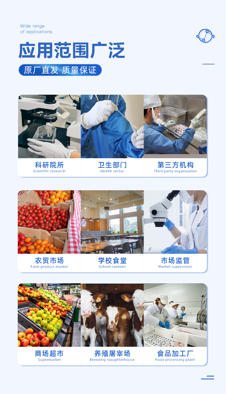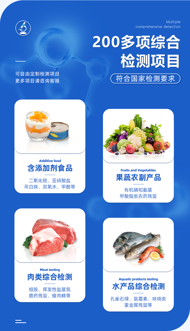 食品添加剂:二氧化硫、双氧水、亚硝酸盐、硝酸盐、苯甲酸钠、山梨酸、糖精钠、甜蜜素、安赛蜜、硫酸镁等 | 有毒有害物质:甲醛、吊白块、硼砂、过氧化苯甲酰、溴酸钾、罗丹明B、三聚氰胺、苏丹红等 | 果蔬中:有机磷和氨基甲酸酯类农药残留; | 病害肉诊断:组胺、挥发性盐基氮、肉制品酸价、水发产品中组胺 | 重金属含量:铅、镉、铬、汞、砷、锡、镍、铝等;食用油脂检测:过氧化值、酸价、油脂丙二醛等。 | 瘦肉精激素类(兽药):盐酸克伦特罗、沙丁胺醇、莱克多巴胺、己烯雌酚、喹乙醇等 | 抗生素残留类(兽药):四环素类、硝基呋喃类、磺胺类、沙星类、喹诺酮类、庆大霉素、链霉素、阿莫西林、红霉素等 | 水产品安全类:孔雀石绿、氯霉素、呋喃妥因代谢、呋喃西林代谢、呋喃它酮代谢、呋喃唑酮代谢等 | 真菌毒素类:食用油、粮食及饲料中黄曲霉毒素B1、奶中黄曲霉毒素M1、呕吐毒素、玉米赤霉烯酮、赭曲霉毒素A等 | 水酒饮品分析:乳品及牛奶中蛋白质;酒中甲醇、乙醇、杂醇油;蜂蜜中果糖和葡萄糖、蔗糖、淀粉酶、酸度;水中氰化物、余氯,饮料中维C等 | 调味品成分:食醋的总酸、酱油的总酸、芝麻油纯度、谷氨酸钠、酱油氨基酸态氮、食盐中亚铁氰化钾、食盐中碘等 | 食用色素类:红色色素(胭脂红、苋菜红、赤藓红、诱惑红)、黄色色素(柠檬黄、日落黄)、蓝色色素(亮蓝)等 | 动物疫病类:猪蓝耳病毒、猪瘟病毒、猪伪狂犬病毒、猪伪狂犬病毒gE蛋白、猪口蹄疫3ABC蛋白、猪口蹄疫病毒IgG、猪细小病毒、鸡禽流感等 |