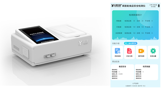 仪器采用台式一体化系统检测技术,将分光光度模块、胶体金检测模块、新型农残检测模块、数字化管理模块、无线通讯模块高度集成于一体,支持检测200种食品安全检测项目,同时预留升级检测方法。 | 仪器检测模块标准化、智能化,可随意自由组合。检测箱体内置多个标准检测单元,检测模块可以调整配置。 | 仪器采用全新安卓智能系统,主控芯片采用 ARM Cortex-A7,RK3288/4核处理器,10.1寸高清液晶触摸竖屏,更加**的UI交互界面,运转快捷;仪器配备无线通信模块: 4G(APN)通讯模块、Wifi模块,蓝牙传输,同时具有双USB接口以及RJ45接口能以多种方式实现数据保存和数据传输功能。 | 创新检测模式: ★检测通道:≥12通道;采用精密旋转比色池设计,使用同芯片同光源校准精度,解决不同光源之间的误差值。1-12通道间误差0.1%。(***:ZL202022821055.2) | ★仪器具有自动识别比色皿检测功能,即:将样品比色皿放入仪器后,点击样品检测,仪器自动识别比色皿进行通道检测。 | 进口高精光源: 高精度进口四波长冷光源,通道配置 410、520、590、630nm 波长光源,一个光源芯片驱动一个光源,误差极小,每台设备单独**校准光源,**比对,同时参照四种不同波段光源全方位覆盖市面上99%的农残食品项目检测。 | 胶体金模块检测方式: 采用COMS实时成像技术,可采集多个画面,支持3个金标同时读卡,通过不同颜色的灰度变化,一秒精准得出结果。 | 智能操作分析系统: ★便捷操作系统:设备检测时可在同一检测界面自动对应相关检测通道一次性选择1-12个样品名称,无须退出界面,节省操作时间。(需提供对应证明) | ★数据集成系统:设备首页自动统计检测数据包含:周检测数据、月检测数据,全部检测总数量,均包含检测总数,合格数,不合格数,以及相关柱形分析图,对各项检测数据清晰掌握,无需电脑查询,更加快捷直观。(需提供对应证明文件) | ★项目预设系统:支持添加单个及多个相同或不相同的任务预设,一键快速调取,每一个任务分别可以设置不同的样品、批次、编号、来源、备注、抽样信息、检测信息、受检信息、复核信息等更多信息。无缝链接平台和APP实时查看下发任务。(需提供对应证明文件) | ★数据监管系统:同步对接监管平台,数据可局域网和互联网数据上传,检测结果可选择直接传至食品安全监管平台。集成OSS输出存储服务、区分设备定向管理应用,进行区域食品安全监管及大数据分析处理与数据统计,检测区域食品安全长短期动态,达到食品安全问题预估、预警。(需提供对应食品理化分析系统计算机软件著作权)。 | ★自定义打印系统:内置全新打印系统,新创自定义打印方式,可按需灵活设置开启或关闭:产品合格证(国家农业部标准要求),二维码,抽样信息、检测信息,受检信息、复核信息、抽样日期、检测日期等信息的打印。(需提供对应证明) | ★系统远程更新功能:可定向分客户分仪器更新系统,按照不同客户后期实际需求添加项目,无需机器返厂,即可远程实时升级全新系统,节省时间成本及避免运输造成设备损坏。 | 仪器主机采用一体化防水、抗压、防撞击、防腐蚀箱体设计,同时配备交直流供电,可连接车载电源,可选配大容量充电锂电池,满足现场野外检测需求。 | 安全证书,放心保障:仪器具有中国计量科学研究院校准证书,权威认证。 |