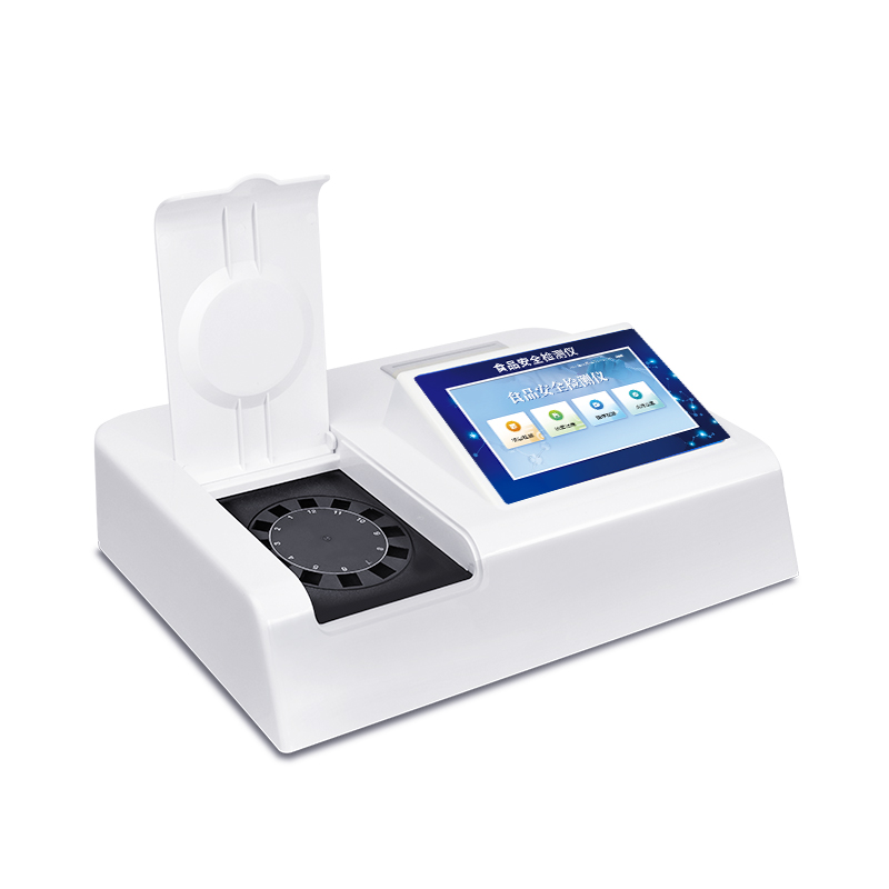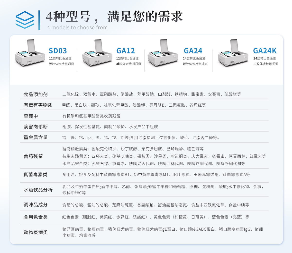食品添加剂:二氧化硫、双氧水、亚硝酸盐、硝酸盐、苯甲酸钠、山梨酸钾、糖精钠、甜蜜素、木耳硫酸镁等 | 有毒有害物质:甲醛、吊白块、硼砂、过氧化苯甲酰、溴酸钾、罗丹明B、三聚氰胺、苏丹红、工业碱、尿素、明矾等 | 果蔬:农药残留(酶抑制率法) | 病害肉:组胺、挥发性盐基氮 | 重金属含量:铅、镉、铬、汞、砷、锡、镍、铝等 | 水产品安全类:孔雀石绿、氯霉素、呋喃妥因、呋喃西林、呋喃它酮、呋喃唑酮等 | 瘦肉精激素类(兽药):盐酸克伦特罗、沙丁胺醇、莱克多巴胺、己烯雌酚等 | 抗生素残留:四环素类、硝基呋喃类、磺胺类、β-兴奋剂类、沙星类、磺胺类、喹诺酮类,甲砜霉素,氟苯尼考,金刚烷胺、替米考星、庆大霉素、林可霉素、链霉素、恩诺沙星、环丙沙星、头孢啦啶、青霉素、阿莫西林等 | 真菌毒素类:食用油、粮食及饲料中黄曲霉毒素B1、奶中黄曲霉毒素M1、呕吐毒素、玉米赤霉烯酮、赭曲霉毒素A等 | 水酒饮品分析:乳品及牛奶中蛋白质;酒中甲醇、乙醇、杂醇油;蜂蜜中果糖和葡萄糖、蔗糖、淀粉酶、酸度;水中氰化物、余氯,饮料中维C等 | 调味品成分:食醋的总酸、酱油的总酸、芝麻油纯度、谷氨酸钠、酱油氨基酸态氮、食盐中亚铁氰化钾、食盐中碘等 | 食用色素类:红色色素(胭脂红、苋菜红、赤藓红、诱惑红)、黄色色素(柠檬黄、日落黄)、蓝色色素(亮蓝)等 | 动物疫病类:猪蓝耳病毒、猪瘟病毒、猪伪狂犬病毒、猪伪狂犬病毒gE蛋白、猪口蹄疫3ABC蛋白、猪口蹄疫病毒IgG、猪细小病毒、鸡禽流感等 | 蜂蜜成分:果糖和葡萄糖、蔗糖、淀粉酶、酸度等 | 水产品安全类:孔雀石绿、氯霉素、呋喃妥因、呋喃西林、呋喃它酮、呋喃唑酮等 | 食用油脂:过氧化值、酸价等 | 蛋类药物残留:氯霉素,四环素,磺胺类,喹诺酮类,呋喃西林,呋喃它酮,呋喃妥因,呋喃唑酮,氟苯尼考,阿莫西林、头孢氨苄、红霉素、链霉素等 |