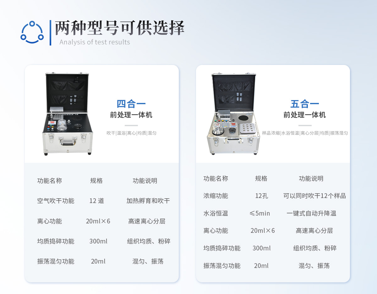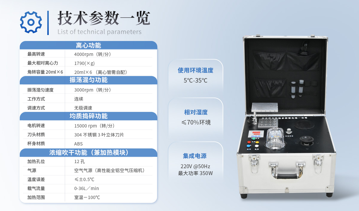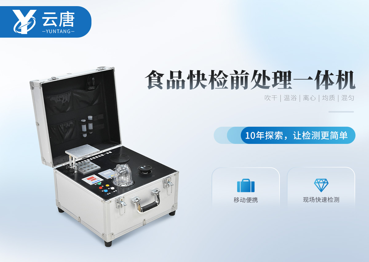 本公司应国内用户的实际需求,自行研制开发的新型仪器——YT-HQC05型样品前处理一体机。样品前处理一体机将样本前处理过程中样品浓缩、离心分层、均质、振荡混匀、水浴等步骤所需设备进行集成,仅需一台设备即可完成所有样本前处理过程,并且方便携带,不仅适用于现场检测使用,还可用于色谱、质谱等分析样品的纯化和制备。