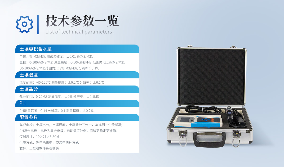 测量参数:土壤容积含水量; 单位:%(m3/m3); 测试灵敏度:±0.01 %(m3/m3); | 量程:0-100%(m3/m3) 测量精度:0-50%(m3/m3)范围内)±2%(m3/m3); | 50-100%(m3/m3)范围内)±3%(m3/m3); 分辨率:0.1% | 土壤温度范围:-40-120℃ 测量精度:±0.2℃ 分辨率:±0.1℃ | 土壤盐分范围:0-20ms 测量精度:±2% 分辨率:±0.1ms | PH测量范围:0-14 分辨率:0.1 测量精度:±0.2% | 集成电极:土壤水分,土壤温度,土壤盐分三合一,集成到一个传感器; | ph复合电极:电极为复合电极,自动温度补偿,测试更稳定更准确。 | 仪器尺寸:10×21×3.5cm | 供电方式:锂电池供电、交流电两种方式 | 软件:上位机软件免费赠送 |