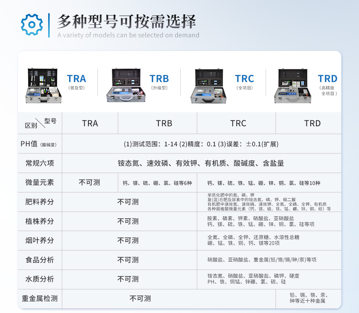 肥料养分:● 单质化肥中的氮、磷、钾; ● 复(混)合肥及尿素中的铵态氮、磷、钾; ● 有机肥中速效氮、速效磷、速效钾、全氮、全磷、全钾、pH、有机质等。 |