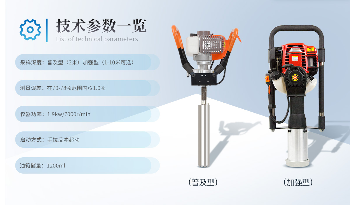 采样深度:1-10米(可选) | 振动频率:1300次/分钟 | 动力:1.6马力 (7000rpm) | 发动机类型:单缸二冲程发动机 | 油耗:不大于0.6L/h | 重量:20.2kg(主机) | 样品管规格:内外径不低于35mm/40mm;长度不低于1.00米/根 | 采样深度,可以连接钻杆一次性采样,中途不提钻 | 起拔装置:快速起拔,速度不低于3.00米/分钟 |
