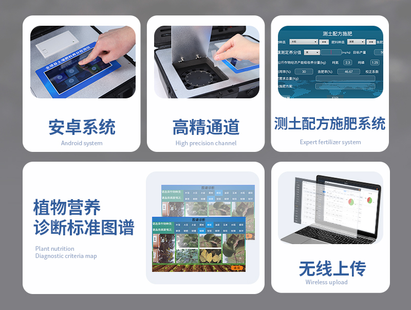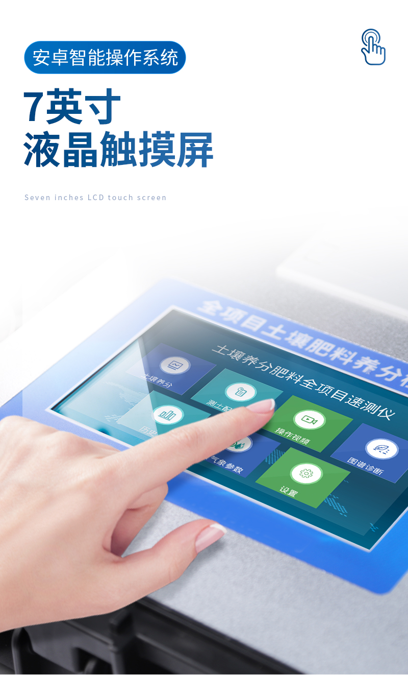 ★1、Android安卓智能操作系统,主控芯片采用ARM Cortex-A7,RK3288/4核处理器,主频1.88Ghz,运转速度更快速,稳定性更强。 | ★2、12个检测通道,一次性可快速检测12个样品,极大提升检测效率,降低检测成本。 | ★3、采用高精度滤光片技术自主专利分析方法(***:ZL 2020 2 1763837.9),权威认证。 | ★4、检测过程中内置校准功能,智能恒流稳压,光强自动校准,确保检测准确度,取得中国计量科学研究院的《校准证书》。 | ★5、仪器标配wifi无线上传、4G联网传输、GPRS无线远传,快速上传数据。 | ★6、配有智慧云农业平台,仪器连入无线网络后,可将检测数据可选择性或批量无线上传,方便用户进行长期数据管理和可视化分析。 | 7、仪器配同时具有USB接口、以太网接口,内置大容量内存,并可随时用U盘拷贝数据。 | ★8、可用手机随时登录云平台在线移动查看历史数据 | ★9、内置作物专家施肥系统,可对百余种全国农业经济作物、果树等的目标产量计算推荐施肥量,依据施肥配方科学指导农业生产。测土配方施肥结果可打印,打印内容包含:作物种类、肥料种类、目标产量、需求总量、建议施肥方案。 | 10、内置植物营养诊断标准图谱,根据各农作物营养缺失的图片,进行叶面对比,诊断丰缺。 | ★11、4波长专业测试冷光源(红、蓝、绿、橙),光源波长稳定,长时间连续工作光源无温漂现象,寿命长达10万小时级别,重现性好,准确度高。 | 12、比色池部分采用标准1cm比色皿,无机械位移及磨损,光路测试定位**,有效屏蔽外光干扰,保证检测结果优于国标要求。 | ★13、仪器系统内带有样品前处理操作视频,各种样品检测方法点击视频模块即可观看,检测人员无需自学说明书,指导教学方便快速,方便新手快速操作。 | 14、内置新一代高速热敏打印机(无需色带),打印内容包含:检测单位、检测人员、检测项目、通道号、吸光度、养分含量(mg/kg)、检测时间、以及二维码等信息 | ★15、高灵敏7寸真彩触摸屏,采用更加**和人性化操作,高清晰高交互显示,大程度降低传统仪器的繁琐操作和失误,并取得多项《软件著作权》。 | 16、内置时钟功能,方便操作时间记录,长期历史追溯。 | 17、可设置多账户账号密码登录,**UI交互界面,不同的用户可自由添加编辑检测信息,保存后可长期使用。 | 18、GPS功能:可在野外作业时记录经纬度地点,满足特殊用户需求。 | 19、内置低电压提示功能,可在检测时明确电量,避免测试数据偏移,同时具有断电保护功能,断电自动保存数据,防止数据丢失。 | 20、交直流两用供电方式,内置大容量充电锂电池,满电状态下可连续工作10余小时,同时可外接车载电源蓄电。 | ★21、仪器具有中英文切换功能,可满足出口要求。 | 22、高强度PVC工程塑料手提箱设计,坚固耐用,便于携带。 |