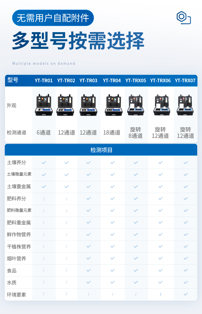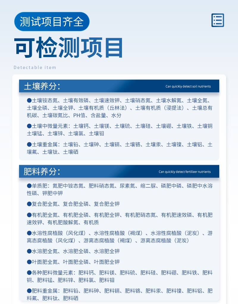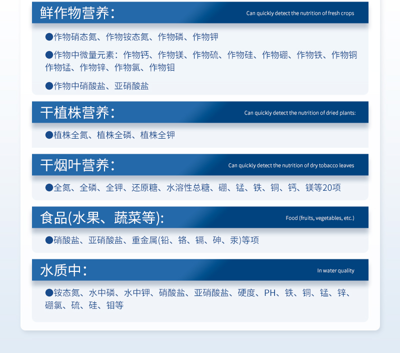 1、土壤养分: ●土壤铵态氮、土壤有效磷、土壤速效钾、土壤硝态氮、土壤水解氮、土壤全氮、土壤全磷、土壤全钾、土壤有机质(丘林法)、土壤有机质(浸提法)、土壤总有机碳、土壤碳氮比、PH值、含盐量、水分。 ●土壤中微量元素:土壤钙、土壤镁、土壤硫、土壤硅、土壤硼、土壤铁、土壤铜、土壤锰、土壤锌、土壤氯、土壤钼; ●土壤重金属:土壤铅、土壤砷、土壤镉、土壤铬、土壤汞、土壤镍、土壤铝、土壤氟、土壤钛、土壤硒。 | 2、肥料养分: ●单质肥:氮肥中铵态氮、肥料硝态氮、尿素氮、缩二脲、磷肥中磷、磷肥中水溶性磷、钾肥中钾; ●复合肥全氮、复合肥全磷、复合肥全钾; ●有机肥全氮、有机肥全磷、有机肥全钾、有机肥硝态氮、有机肥速效磷、有机肥速效钾、有机肥酸解氮、有机质; ●水溶性腐植酸(风化煤)、水溶性腐植酸(褐煤)、水溶性腐植酸(泥炭)、游离态腐植酸(风化煤)、游离态腐植酸(褐煤)、游离态腐植酸(泥炭); ●水溶肥全氮、水溶肥全磷、水溶肥全钾; ●叶面肥全氮、叶面肥全磷、叶面肥全钾; ●各种肥料微量元素:肥料钙、肥料镁、肥料硫、肥料硅、肥料硼、肥料铁、肥料铜、肥料锰、肥料锌、肥料氯、肥料钼; ●肥料重金属:肥料铅、肥料砷、肥料镉、肥料铬、肥料汞、肥料镍、肥料铝、肥料氟、肥料钛、肥料硒。 | 3、鲜作物营养: ●作物硝态氮、作物铵态氮、作物磷、作物钾; ●作物中微量元素:作物钙、作物镁、作物硫、作物硅、作物硼、作物铁、作物铜、作物锰、作物锌、作物氯、作物钼; ●作物中硝酸盐、亚硝酸盐。 | 4、干植株营养: ●植株全氮、植株全磷、植株全钾 | 5、烟叶营养: ●全氮、全磷、全钾、还原糖、水溶性总糖、硼、锰、铁、铜、钙、镁等20项。 | 6、食品(水果、蔬菜等): ●硝酸盐、亚硝酸盐、重金属(铅、铬、镉、砷、汞)等项。 | 7、水质中: ●铵态氮、水中磷、水中钾、硝酸盐、亚硝酸盐、硬度、PH、铁、铜、锰、锌、硼、氯、硫、硅、钼等 |