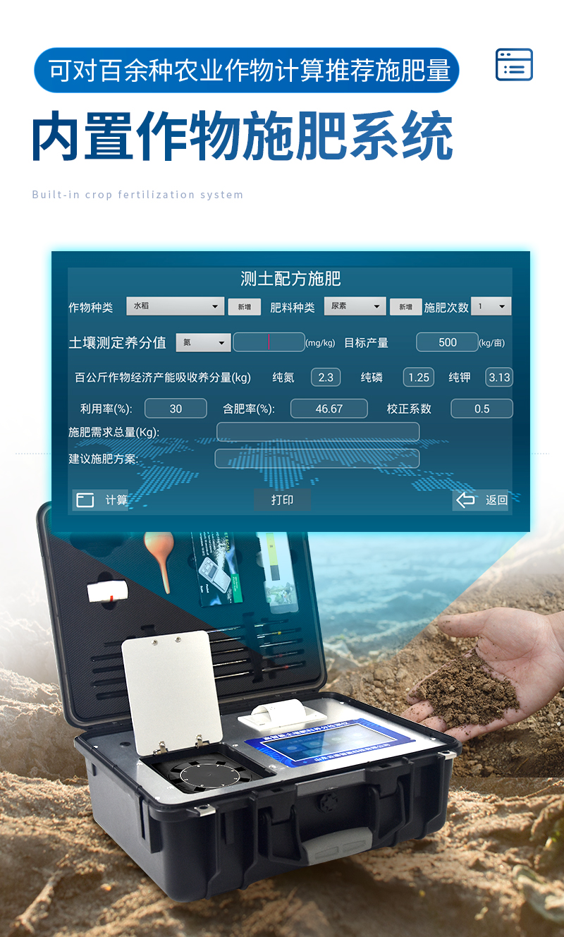 产品简介: 配套齐全:该仪器集药、器、仪为一体,携带方便,相当于一个小型移动实验室,无需用户自配附件,亦可灵活野外流动测试。适于农业服务部门或农资经销商、合作社、肥料厂商、大种植户测···     更新时间:2025-10-08