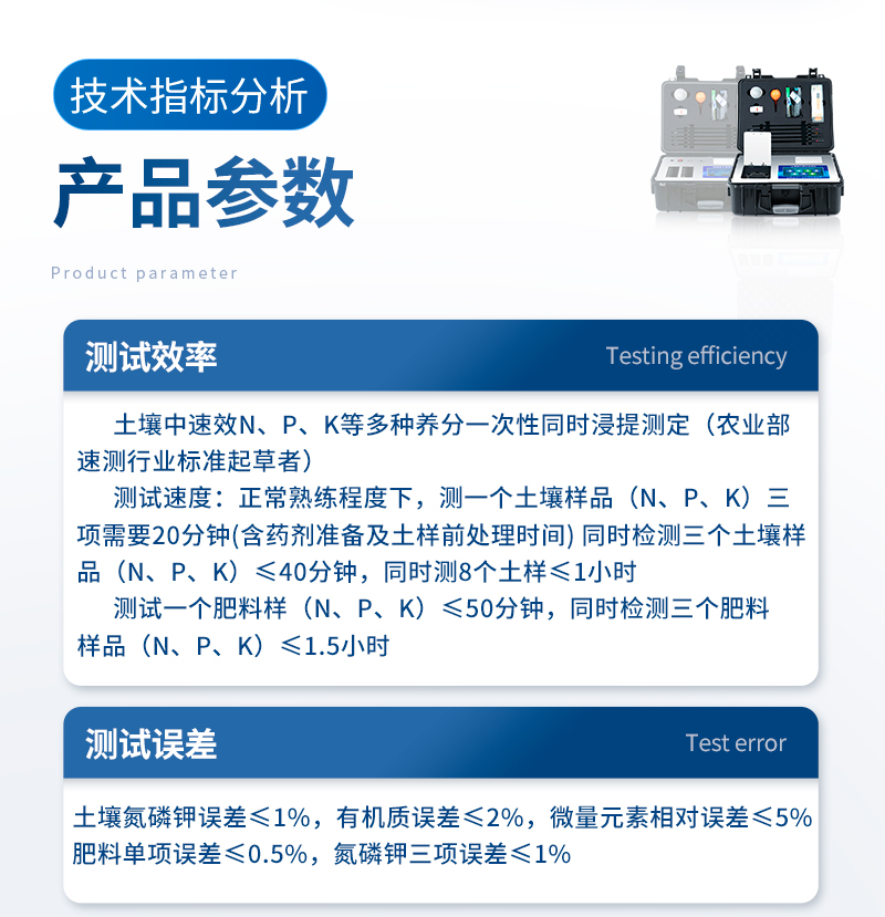 土壤中速效N、P、K等多种养分一次性同时浸提测定(农业部速测行业标准起草者)。 | 肥料中氮(N)、磷(P)、钾(K)等养分同时、快速、准确检测。 | 测试速度:正常熟练程度下: | 测一个土壤样品(N、P、K)三项需要20分钟(含药剂准备及土样前处理时间),同时检测三个土壤样品(N、P、K)≤40分钟,同时测8个土样≤1小时。 | 测试一个肥料样(N、P、K)≤50分钟,同时检测三个肥料样品(N、P、K)≤1.5小时。 |