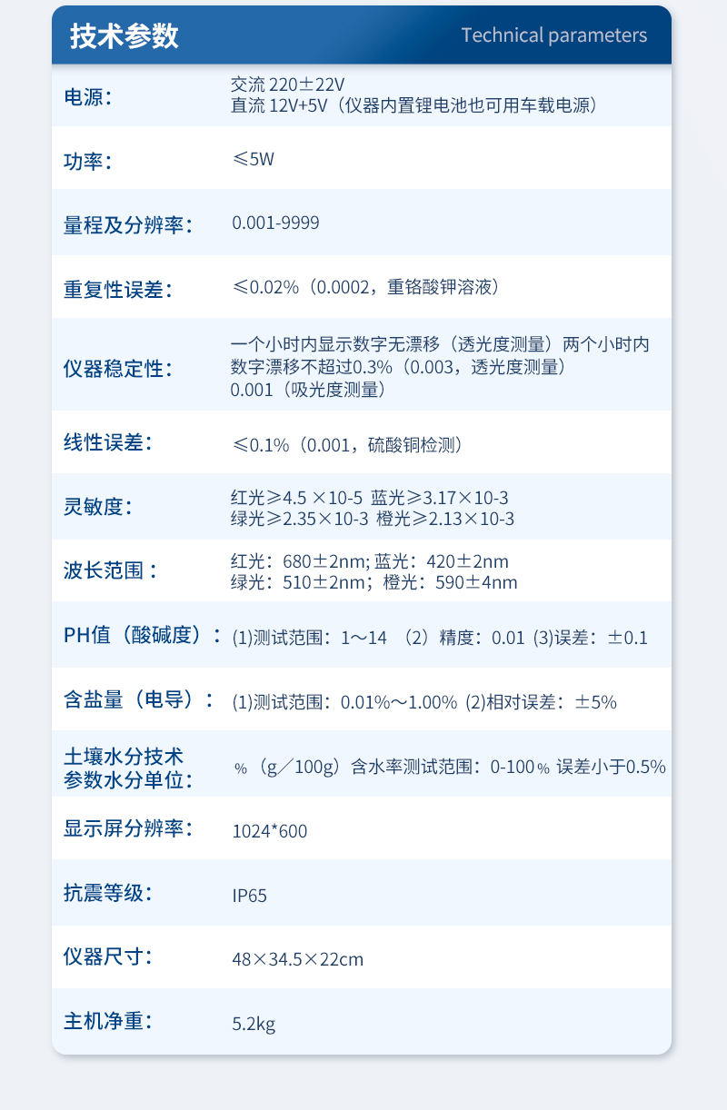 1.电源:交流 220±22V 直流 12V+5V(仪器内置锂电池也可用车载电源) | 2.功率: ≤5W | 3.量程及分辨率:0.001-9999 | 4.重复性误差: ≤0.02%(0.0002,重铬酸钾溶液) | 5.仪器稳定性:一个小时内显示数字无漂移(透光度测量);两个小时内数字漂移不超过0.3%(0.003,透光度测量)、0.001(吸光度测量)。 | 6.线性误差: ≤0.1%(0.001,硫酸铜检测) | 7.灵敏度:红光≥4.5 ×10-5 蓝光≥3.17×10-3 绿光≥2.35×10-3 橙光≥2.13×10-3 | 8.波长范围 :红光:680±2nm; 蓝光:420±2nm; 绿光:510±2nm;橙光:590±4nm | 9.PH值(酸碱度): (1)测试范围:1~14 (2)精度:0.01 (3)误差:±0.1 | 10.含盐量(电导):(1)测试范围:0.01%~1.00% (2)相对误差:±5% | 11.土壤水分技术参数水分单位:﹪(g/100g);含水率测试范围:0-100﹪;误差小于0.5% | 12.显示屏分辨率:1024*600 | 13.抗震等级:IP65 | 14、仪器尺寸:48×34.5×22cm | 15、主机净重:5.2kg |