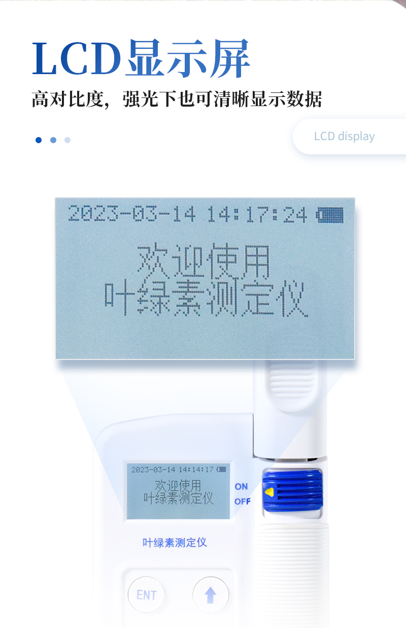 叶绿素测定仪的工作原理 两个LED光源发射两种光,一种是红光(650nm),一种是红外光(940nm),两种光穿透叶片,打到接收器上,光信号转换成模拟信号,模拟信号被放大器放大,由模拟/数字转换器转换成数字信号,数字信号被微处理器处理,计算出SPAD值并显示在液晶屏上。 | 叶绿素测定仪测量值的校准与计算 (1)叶绿素仪测量值的校准与计算 两个LED次序发光,被接收的光转换成电信号,光强度的比率被用来计算。 (2)在压头夹住样品后,两个LED再次发光,通过叶片传输的光打到接收器上,被转换成电信号,传输光的强度比率被计算。 (3)步骤1和2的值用于计算SPAD测量值,即表示夹住的样品叶片当前叶绿素相对含量。 |