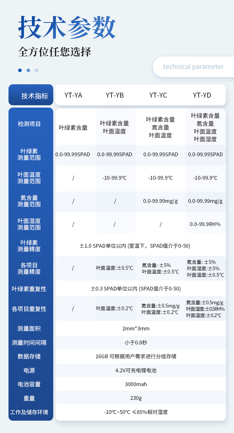 测量范围 0.0-99.9 SPAD | 测量面积 2mm*2mm | 测量精度 ±1.0 SPAD单位以内 (室温下,SPAD值介乎0-50) | 重复性 ±0.3 SPAD单位以内 (SPAD值介乎0-50) | 测量时间间隔 小于3秒 | 数据存储容量 2GB | 电源 4.2V可充电锂电池 | 电池容量 800mah | 重量 250g | 外形尺寸 140×85×45mm(长×宽×高) | 工作及存储环境 0℃-50℃;85%相对湿度 |