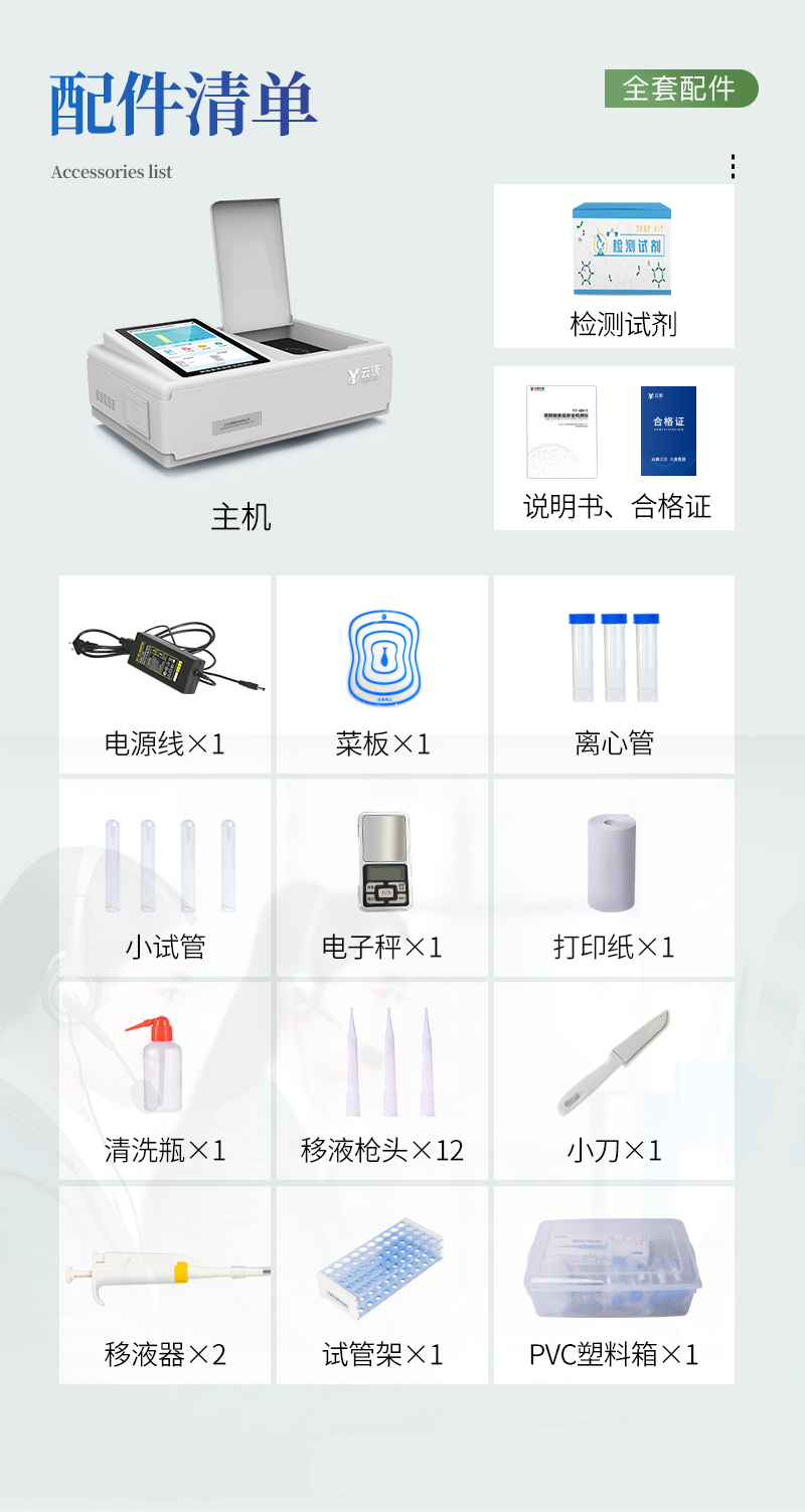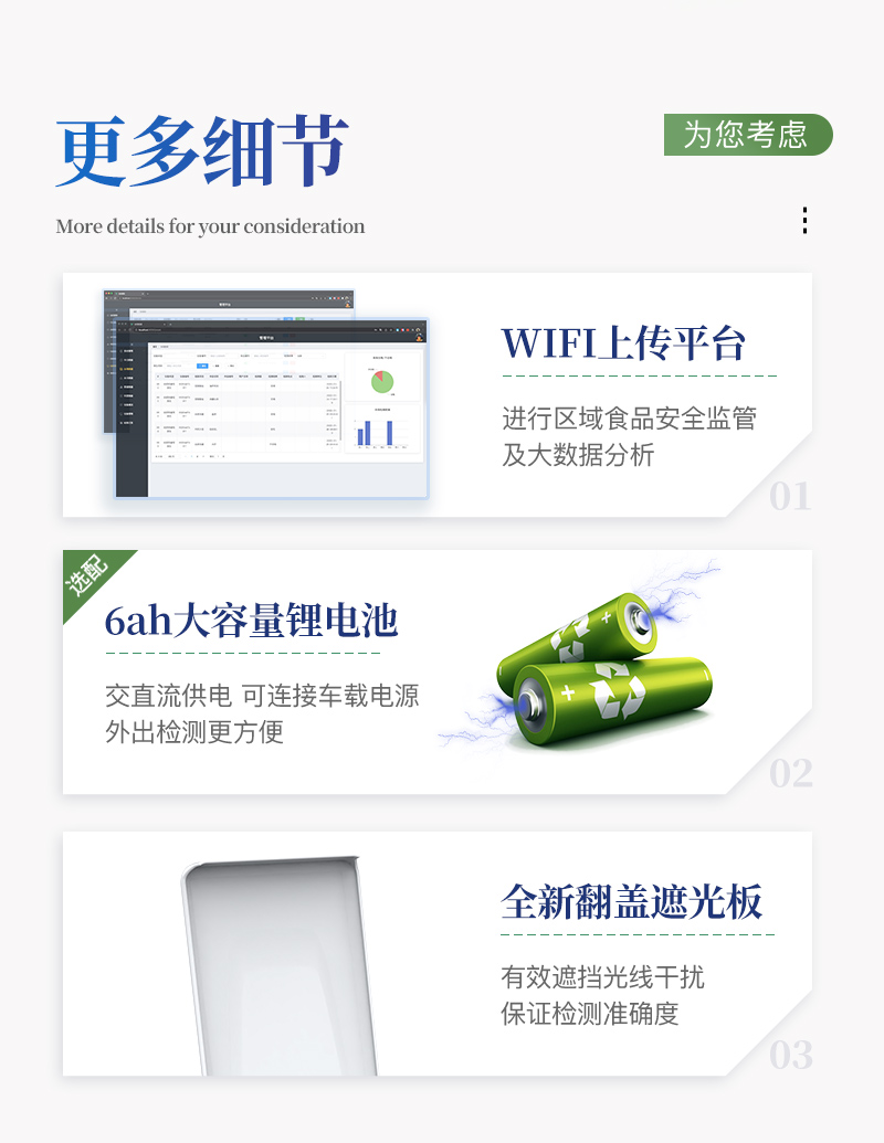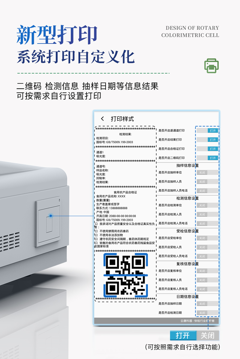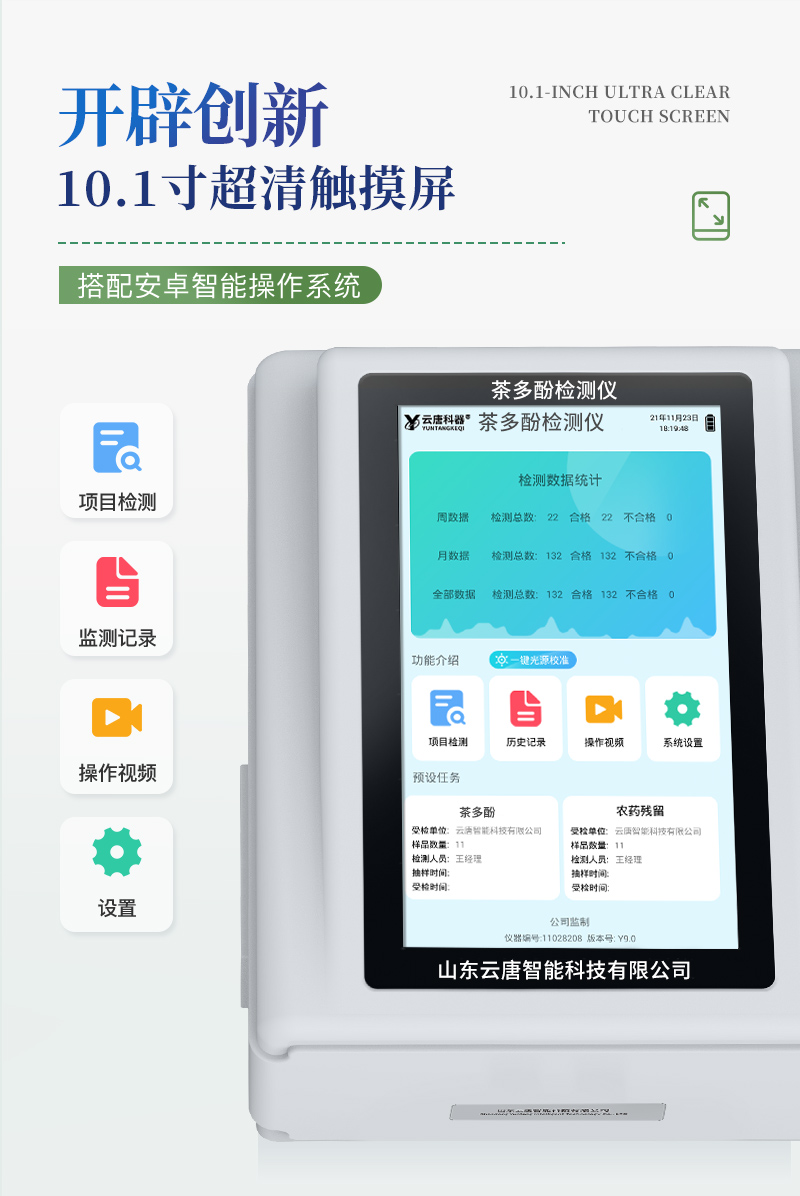 仪器采用台式一体化系统检测技术,将分光光度模块、新型农残检测模块、数字化管理模块、无线通讯模块高度集成于一体,支持检测200种食品安全检测项目,同时预留升级检测方法。 | 仪器检测模块标准化、智能化,可随意自由组合。检测箱体内置多个标准检测单元,检测模块可以调整配置。 | 仪器采用全新安卓智能系统,主控芯片采用 ARM Cortex-A7,RK3288/4核处理器,10.1寸高清液晶触摸竖屏,更加**的UI交互界面,运转快捷;仪器配备无线通信模块: 4G(APN)通讯模块、Wifi模块,蓝牙传输,同时具有双USB接口以及RJ45接口能以多种方式实现数据保存和数据传输功能。 | 创新检测模式: | ★检测通道:≥12通道;采用精密旋转比色池设计,使用同芯片同光源校准精度,解决不同光源之间的误差值。1-12通道间误差0.1%。(***:ZL202022821055.2) | ★仪器具有自动识别比色皿检测功能,即:将样品比色皿放入仪器后,点击样品检测,仪器自动识别比色皿进行通道检测。 | 进口高精光源: | 高精度进口四波长冷光源,通道配置 410、520、590、630nm 波长光源,一个光源芯片驱动一个光源,误差极小,每台设备单独**校准光源,**比对,同时参照四种不同波段光源全方位覆盖市面上99%的农残食品项目检测。 | 智能化操作系统: | 便捷操作系统:设备检测时可在同一检测界面自动对应相关检测通道一次性选择1-12个样品名称,无须退出界面,节省操作时间。 | 数据集成系统:设备首页自动统计检测数据包含:周检测数据、月检测数据,全部检测总数量,均包含检测总数,合格数,不合格数,以及相关柱形分析图,对各项检测数据清晰掌握,无需电脑查询,更加快捷直观。 | 项目预设系统:支持添加单个及多个相同或不相同的任务预设,一键快速调取,每一个任务分别可以设置不同的样品、批次、编号、来源、备注、抽样信息、检测信息、受检信息、复核信息等更多信息。无缝链接平台和APP实时查看下发任务。 | 数据监管系统:同步对接监管平台,数据可局域网和互联网数据上传,检测结果可选择直接传至食品安全监管平台。集成OSS输出存储服务、区分设备定向管理应用,进行区域食品安全监管及大数据分析处理与数据统计,检测区域食品安全长短期动态,达到食品安全问题预估、预警。 | 自定义打印系统:内置全新打印系统,新创自定义打印方式,可按需灵活设置开启或关闭:产品合格证(国家农业部标准要求),二维码,抽样信息、检测信息,受检信息、复核信息、抽样日期、检测日期等信息的打印。 | 系统远程更新功能:可定向分客户分仪器更新系统,按照不同客户后期实际需求添加项目,无需机器返厂,即可远程实时升级全新系统,节省时间成本及避免运输造成设备损坏。 | 仪器主机采用一体化防水、抗压、防撞击、防腐蚀箱体设计,同时配备交直流供电,可连接车载电源,可选配大容量充电锂电池,满足现场野外检测需求。 | 安全证书,放心保障:仪器具有中国计量科学研究院校准证书,权威认证。 |