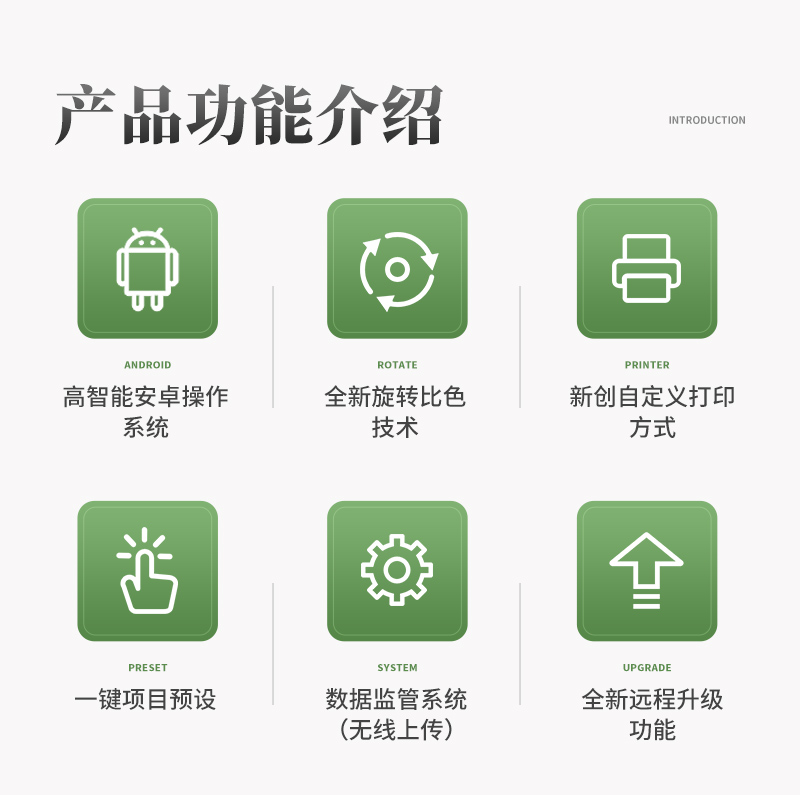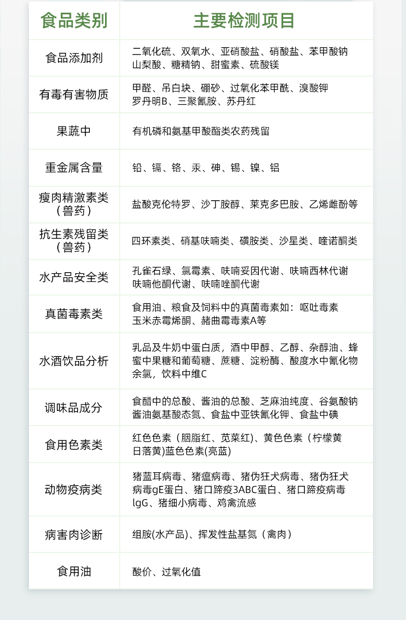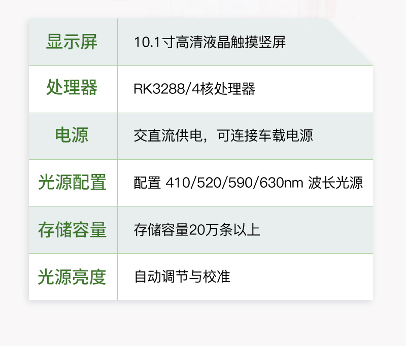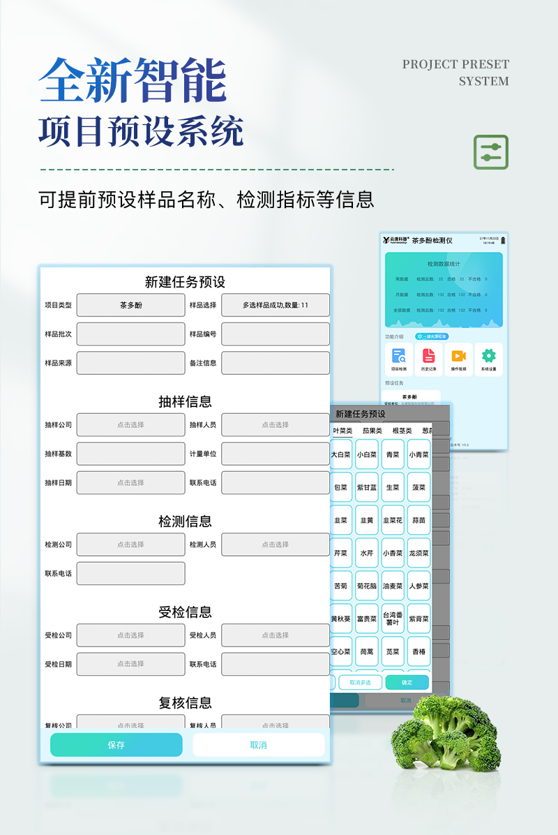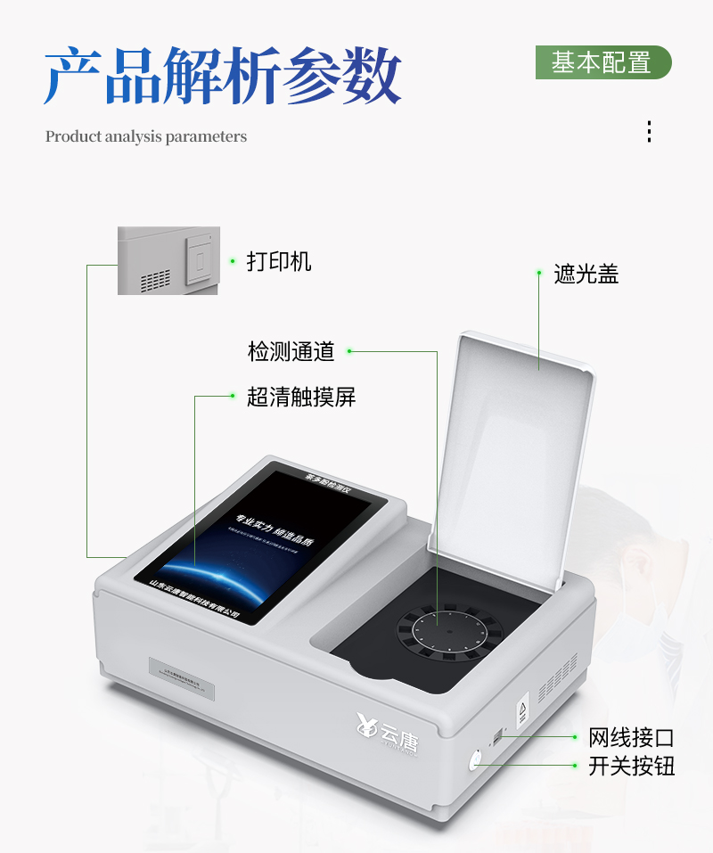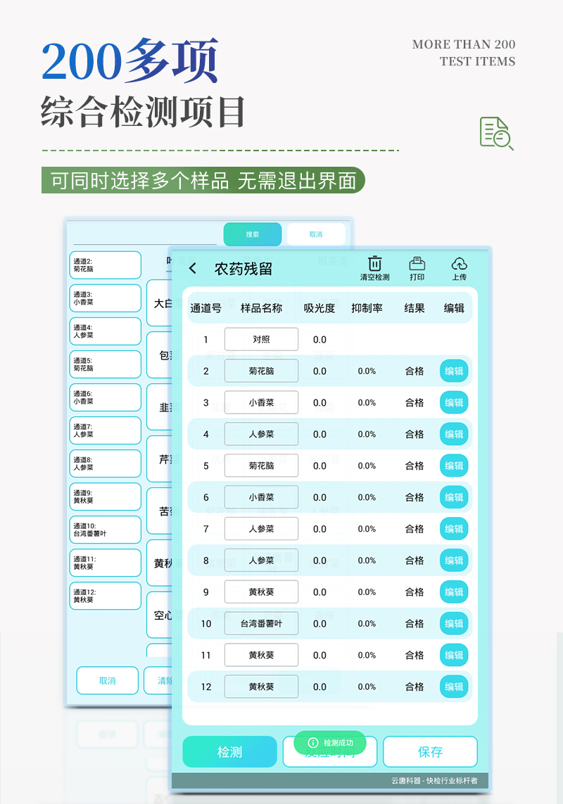 仪器采用台式一体化系统检测技术,将分光光度模块、新型农残检测模块、数字化管理模块、无线通讯模块高度集成于一体,支持检测200种食品安全检测项目,同时预留升级检测方法。 | 仪器检测模块标准化、智能化,可随意自由组合。检测箱体内置多个标准检测单元,检测模块可以调整配置。 | 仪器采用全新安卓智能系统,主控芯片采用 ARM Cortex-A7,RK3288/4核处理器,10.1寸高清液晶触摸竖屏,更加**的UI交互界面,运转快捷;仪器配备无线通信模块: 4G(APN)通讯模块、Wifi模块,蓝牙传输,同时具有双USB接口以及RJ45接口能以多种方式实现数据保存和数据传输功能。 | 创新检测模式: | ★检测通道:≥12通道;采用精密旋转比色池设计,使用同芯片同光源校准精度,解决不同光源之间的误差值。1-12通道间误差0.1%。(***:ZL202022821055.2) | ★仪器具有自动识别比色皿检测功能,即:将样品比色皿放入仪器后,点击样品检测,仪器自动识别比色皿进行通道检测。 | 进口高精光源: | 高精度进口四波长冷光源,通道配置 410、520、590、630nm 波长光源,一个光源芯片驱动一个光源,误差极小,每台设备单独**校准光源,**比对,同时参照四种不同波段光源全方位覆盖市面上99%的农残食品项目检测。 | 智能化操作系统: | 便捷操作系统:设备检测时可在同一检测界面自动对应相关检测通道一次性选择1-12个样品名称,无须退出界面,节省操作时间。 | 数据集成系统:设备首页自动统计检测数据包含:周检测数据、月检测数据,全部检测总数量,均包含检测总数,合格数,不合格数,以及相关柱形分析图,对各项检测数据清晰掌握,无需电脑查询,更加快捷直观。 | 项目预设系统:支持添加单个及多个相同或不相同的任务预设,一键快速调取,每一个任务分别可以设置不同的样品、批次、编号、来源、备注、抽样信息、检测信息、受检信息、复核信息等更多信息。无缝链接平台和APP实时查看下发任务。 | 数据监管系统:同步对接监管平台,数据可局域网和互联网数据上传,检测结果可选择直接传至食品安全监管平台。集成OSS输出存储服务、区分设备定向管理应用,进行区域食品安全监管及大数据分析处理与数据统计,检测区域食品安全长短期动态,达到食品安全问题预估、预警。 | 自定义打印系统:内置全新打印系统,新创自定义打印方式,可按需灵活设置开启或关闭:产品合格证(国家农业部标准要求),二维码,抽样信息、检测信息,受检信息、复核信息、抽样日期、检测日期等信息的打印。 | 系统远程更新功能:可定向分客户分仪器更新系统,按照不同客户后期实际需求添加项目,无需机器返厂,即可远程实时升级全新系统,节省时间成本及避免运输造成设备损坏。 | 仪器主机采用一体化防水、抗压、防撞击、防腐蚀箱体设计,同时配备交直流供电,可连接车载电源,可选配大容量充电锂电池,满足现场野外检测需求。 | 安全证书,放心保障:仪器具有中国计量科学研究院校准证书,权威认证。 |