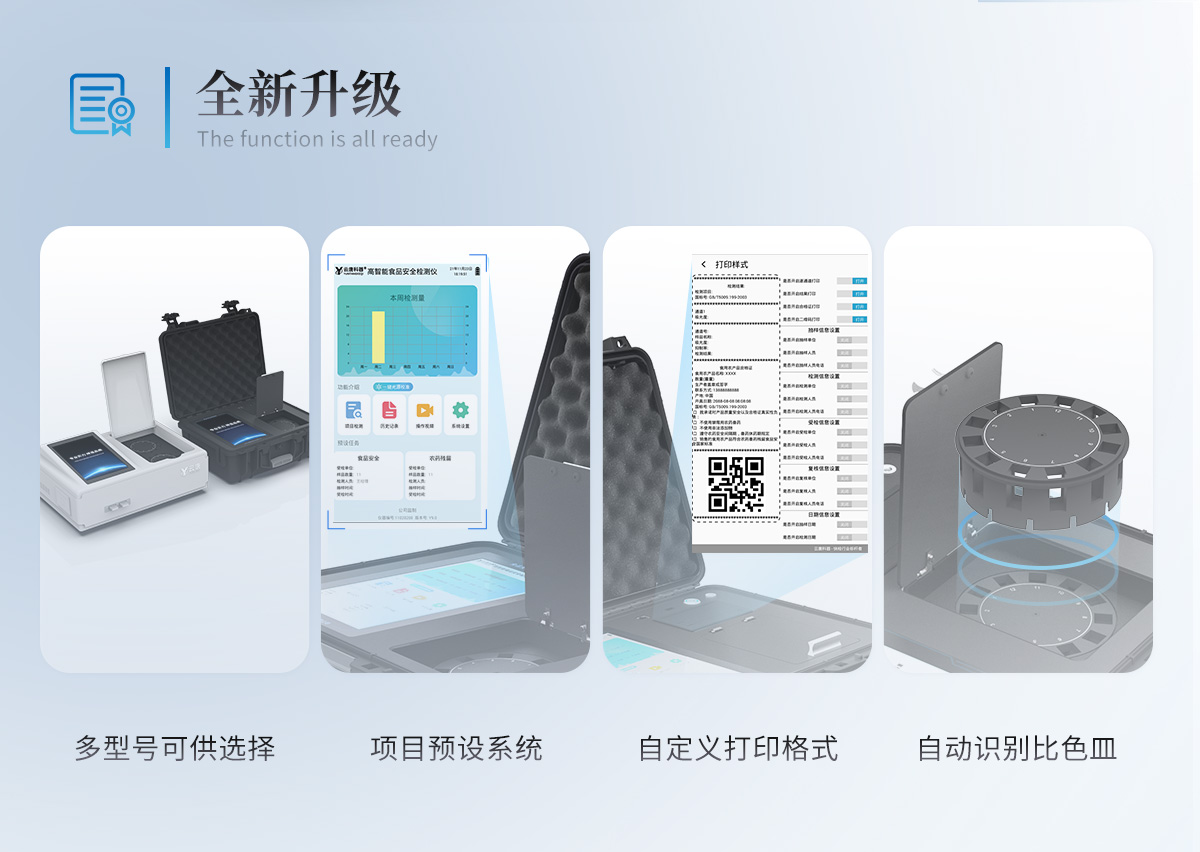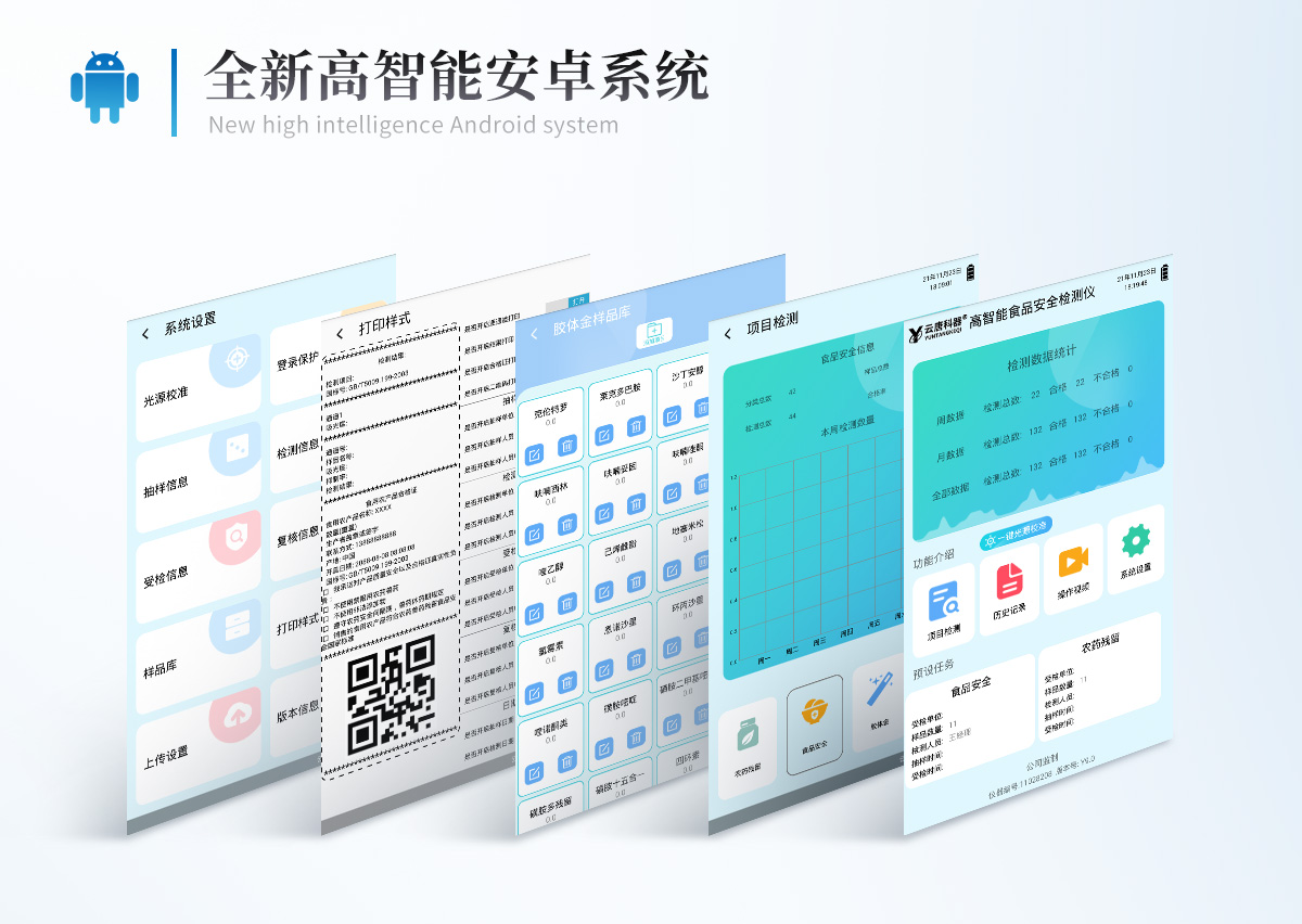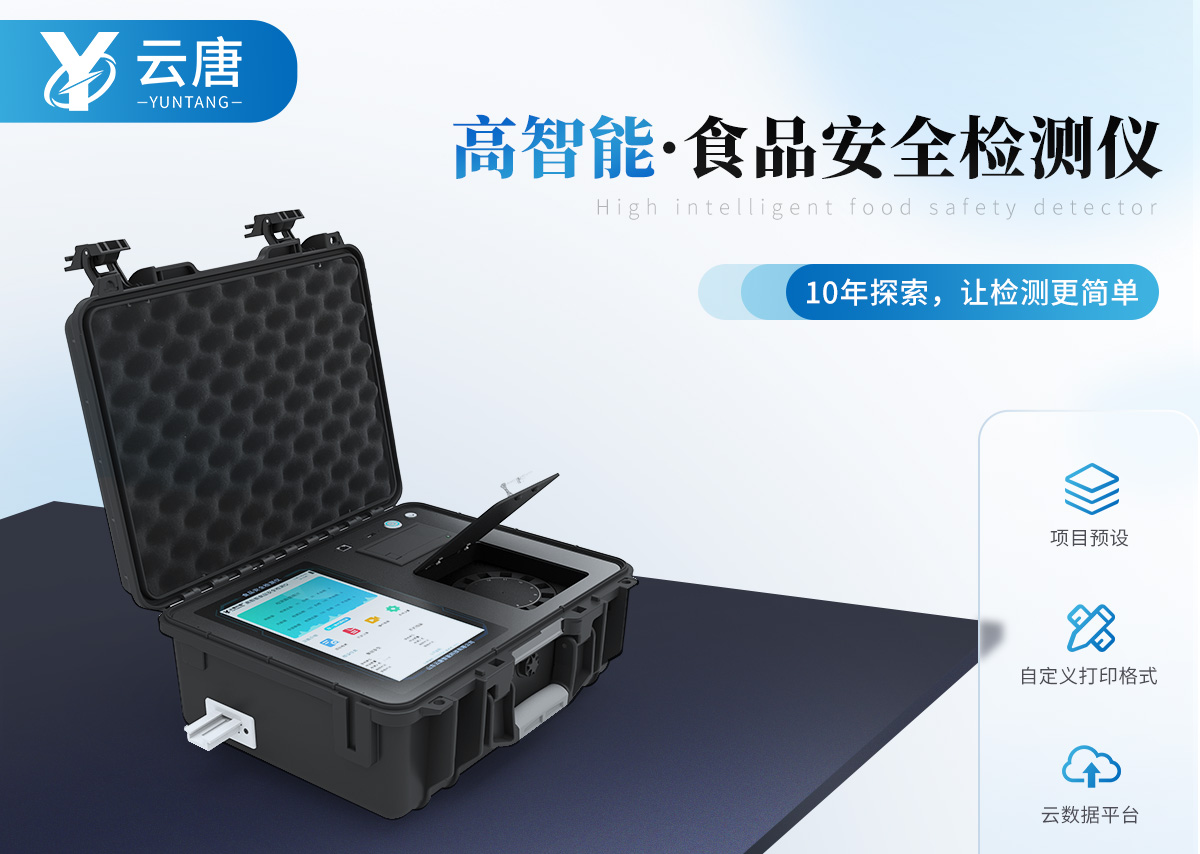 | 仪器采用手提式一体化系统检测技术,将分光光度模块、胶体金检测模块、新型农残检测模块、数字化管理模块、无线通讯模块高度集成于一体,支持检测200种食品安全检测项目,同时预留升级检测方法。 | 仪器检测模块标准化、智能化,可随意自由组合。检测箱体内置多个标准检测单元,检测模块可以调整配置。 | 仪器采用全新安卓智能系统,主控芯片采用 ARM Cortex-A7,RK3288/4核处理器,10.1寸高清液晶触摸竖屏,更加**的UI交互界面,运转快捷;仪器配备无线通信模块: 4G(APN)通讯模块、Wifi模块,蓝牙传输,同时具有双USB接口以及RJ45接口能以多种方式实现数据保存和数据传输功能。 | 创新检测模式:★检测通道:≥12通道;采用精密旋转比色池设计,使用同芯片同光源校准精度,解决不同光源之间的误差值。1-12通道间误差0.1%。(***:ZL202022821055.2) | ★仪器具有自动识别比色皿检测功能,即:将样品比色皿放入仪器后,点击样品检测,仪器自动识别比色皿进行通道检测。 | 进口高精光源: | 高精度进口四波长冷光源,通道配置 410、520、590、630nm 波长光源,一个光源芯片驱动一个光源,误差极小,每台设备单独**校准光源,**比对,同时参照四种不同波段光源全方位覆盖市面上99%的农残食品项目检测。 | 胶体金模块检测方式:★采用COMS实时成像技术,单金标实时读卡,通过不同颜色的灰度变化,一秒精准得出结果。 | 智能操作分析系统:★便捷操作系统:设备检测时可在同一检测界面自动对应相关检测通道一次性选择1-12个样品名称,无须退出界面,节省操作时间。 | ★数据集成系统:设备首页自动统计检测数据包含:周检测数据、月检测数据,全部检测总数量,均包含检测总数,合格数,不合格数,以及相关柱形分析图,对各项检测数据清晰掌握,无需电脑查询,更加快捷直观。 | ★项目预设系统:支持添加单个及多个相同或不相同的任务预设,一键快速调取,每一个任务分别可以设置不同的样品、批次、编号、来源、备注、抽样信息、检测信息、受检信息、复核信息等更多信息。无缝链接平台和APP实时查看下发任务。 | ★数据监管系统:同步对接监管平台,数据可局域网和互联网数据上传,检测结果可选择直接传至食品安全监管平台。集成OSS输出存储服务、区分设备定向管理应用,进行区域食品安全监管及大数据分析处理与数据统计,检测区域食品安全长短期动态,达到食品安全问题预估、预警。 | ★自定义打印系统:内置全新打印系统,新创自定义打印方式,可按需灵活设置开启或关闭:产品合格证(国家农业部标准要求),二维码,抽样信息、检测信息,受检信息、复核信息、抽样日期、检测日期等信息的打印。 | ★系统远程更新功能:可定向分客户分仪器更新系统,按照不同客户后期实际需求添加项目,无需机器返厂,即可远程实时升级全新系统,节省时间成本及避免运输造成设备损坏。 | 仪器主机采用一体化防水、抗压、防撞击、防腐蚀箱体设计,同时配备交直流供电,可连接车载电源,可选配大容量充电锂电池,满足现场野外检测需求。 | 安全证书,放心保障:仪器具有中国计量科学研究院校准证书,权威认证。 |