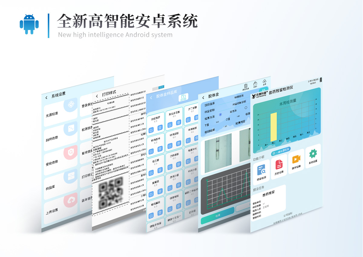 仪器采用10.1英寸液晶触摸屏显,搭配运行安卓智能操作系统,主控芯片采用ARM Cortex-A7,RK3288/4核处理器,主频1.88Ghz,运转速度更快速,性能更强。 | 仪器功能包括:胶体金检测模块、数字化管理模块、无线通讯模块等,可以满足同一软件下实现所有检测项目的检测,并在同一窗口展示检测结果。 | 一体化便携式快检设备,采用交直流两用供电方式,可连接车载电源,配备6ah大容量充电锂电池,可以满足现场及流动检测使用的需求。仪器尺寸:43×35×20cm, 主机净重:5.1kg | 系统自带数据集成模块,设备首页自动统计检测数据包含:周检测数据、月检测数据,全部检测总数量,均包含检测总数,合格数,不合格数,以及相关柱形分析图,对各项检测数据清晰掌握,无需电脑查询,更加快捷直观。 | 仪器具有任务预设模块,可在样品送检前提前预设样品名称、检测指标、送检单位等信息,样品送检时一键调取保存信息,检测更加方便快捷。 | 轨道式自动传输扫描方式,可实时显示金标卡实时图像,系统自动分析并呈现出CT曲线图,CT线自动识别,无需手动调整,完成检测后自动退出检测卡。 | 结果判定线可修改,对照值标定值可保存,断电不丢失数据。 | 兼容市场上其他胶体金卡,使用耗材不受限制,极大增强用户使用体验。 | 仪器检测系统拥有庞大数据库,并且构建了完善的检索、修订功能。食品库涵盖多种样品名称,可按需添加或删除、编辑样品名称;产品数据库以及历史检测记录支持一键检索功能。 | 系统打印自定义化,打印格式多样化,产品合格证(****要求),二维码,抽样信息、检测信息,受检信息、复核信息、抽样日期、检测日期等信息结果,可按需求自行设置打印内容。 | A4纸版本报告打印功能(可选配):设备拥有两种结果展示方式,可以自动生成A4打印模板和小票打印模板两种样式,可通过WiFi及网线等方式链接外置打印机可进行打印 | 仪器具有 wifi 联网上传、RJ45网线连接功能,可以快速上传数据。同步对接监管平台,数据可局域网和互联网数据上传,检测结果直接传至食品安全监管平台。进行区域食品安全监管及大数据分析处理与数据统计,检测区域食品安全长短期动态,达到食品安全问题预估、预警。 | 设备支持U盘存储,标准USB接口,免驱动安装。检测结果存储容量20万条以上,可生成Excel表格,进行一键拷贝,并具有登录保护功能,可设置用户名及密码,规范不同人员操作权限,防止非工作人员操作,并且可以进行重新校准、锁定、恢复出厂设置功能。仪器固件可升级,后期检测项目可扩充。 | 仪器具备远程升级功能,可定向分客户分仪器更新,开机后自动更新,并可持续性免费更新系统版本,无需像传统产品返厂更新,节省时间及人力成本并避免了物流运输返厂升级导致设备损坏的潜在风险。 |