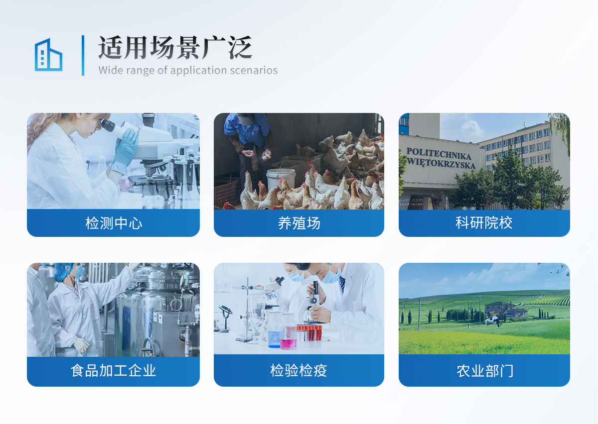 该高智能兽药残留检测仪为集成化食品安全快速检测分析设备,目前已于食药监局、卫生部门、高教院校、科研院所、农业部门、养殖场、屠宰场、食品肉产品深加工企业及检验检疫部门等单位广泛使用。