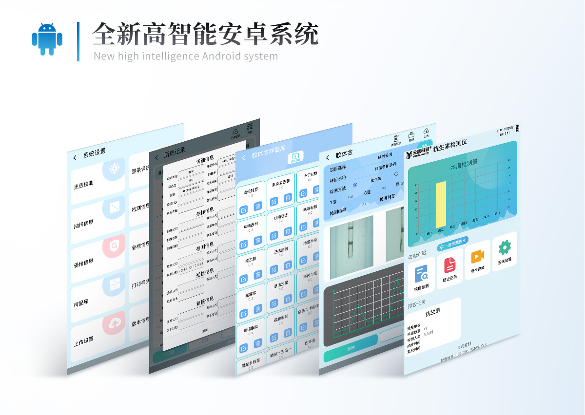 仪器采用10.1英寸液晶触摸屏显,搭配运行安卓智能操作系统,主控芯片采用ARM Cortex-A7,RK3288/4核处理器,主频1.88Ghz,运转速度更快速,性能更强。 | 仪器功能包括:胶体金检测模块、数字化管理模块、无线通讯模块等,可以满足同一软件下实现所有检测项目的检测,并在同一窗口展示检测结果。 | 一体化台式快检设备,采用交直流两用供电方式,可连接车载电源,配备6ah大容量充电锂电池,可以满足现场及流动检测使用的需求。仪器尺寸:43×35×20cm, 主机净重:5.1kg | 系统自带数据集成模块,设备首页自动统计检测数据包含:周检测数据、月检测数据,全部检测总数量,均包含检测总数,合格数,不合格数,以及相关柱形分析图,对各项检测数据清晰掌握,无需电脑查询,更加快捷直观。 | 仪器具有任务预设模块,可在样品送检前提前预设样品名称、检测指标、送检单位等信息,样品送检时一键调取保存信息,检测更加方便快捷。 | 直插式自动扫描方式,可实时显示金标卡实时图像,系统自动分析并呈现出CT曲线图,CT线自动识别,无需手动调整,完成检测后自动退出检测卡。 | 结果判定线可修改,对照值标定值可保存,断电不丢失数据。 | 兼容市场上其他胶体金卡,使用耗材不受限制,极大增强用户使用体验。 | 仪器检测系统拥有庞大数据库,并且构建了完善的检索、修订功能。食品库涵盖多种样品名称,可按需添加或删除、编辑样品名称;产品数据库以及历史检测记录支持一键检索功能。 | 系统打印自定义化,打印格式多样化,产品合格证(****要求),二维码,抽样信息、检测信息,受检信息、复核信息、抽样日期、检测日期等信息结果,可按需求自行设置打印内容。 | A4纸版本报告打印功能(可选配):设备拥有两种结果展示方式,可以自动生成A4打印模板和小票打印模板两种样式,可通过WiFi及网线等方式链接外置打印机可进行打印 | 仪器具有 wifi 联网上传、RJ45网线连接功能,可以快速上传数据。同步对接监管平台,数据可局域网和互联网数据上传,检测结果直接传至食品安全监管平台。进行区域食品安全监管及大数据分析处理与数据统计,检测区域食品安全长短期动态,达到食品安全问题预估、预警。 | 设备支持U盘存储,标准USB接口,免驱动安装。检测结果存储容量20万条以上,可生成Excel表格,进行一键拷贝,并具有登录保护功能,可设置用户名及密码,规范不同人员操作权限,防止非工作人员操作,并且可以进行重新校准、锁定、恢复出厂设置功能。仪器固件可升级,后期检测项目可扩充。 | 仪器具有重新校准、锁定、恢复出厂设置功能。 | 仪器具备远程升级功能,可定向分客户分仪器更新,开机后自动更新,并可持续性免费更新系统版本,无需像传统产品返厂更新,节省时间及人力成本并避免了物流运输返厂升级导致设备损坏的潜在风险。 |