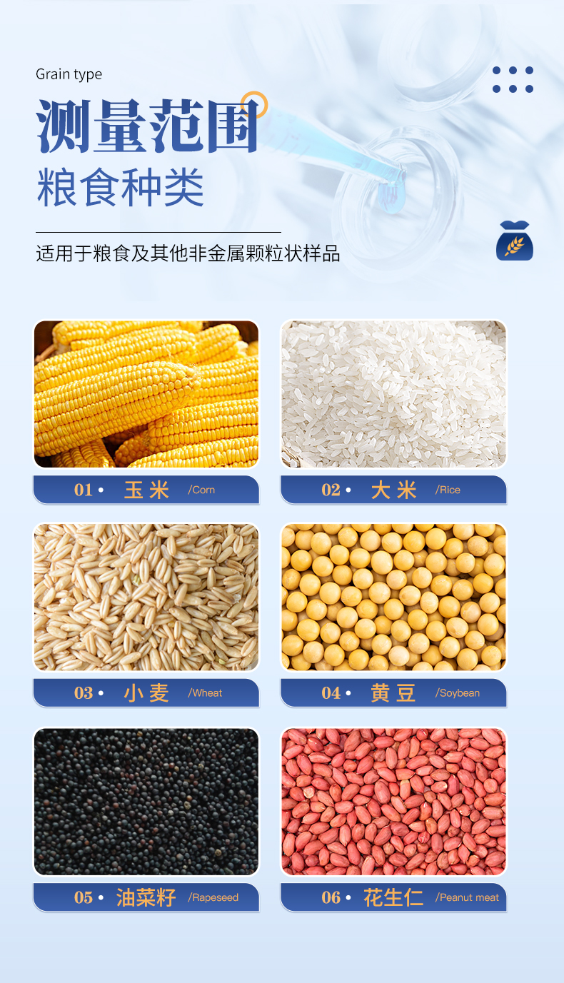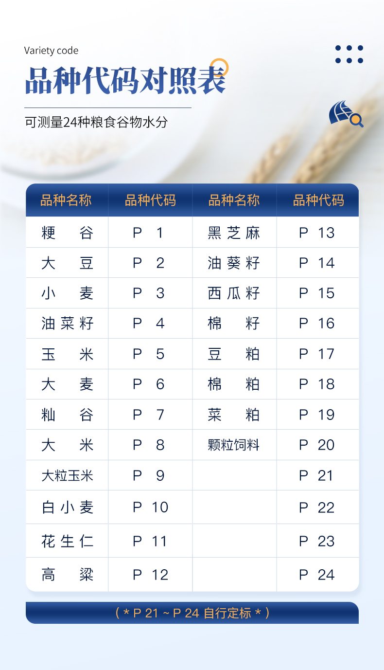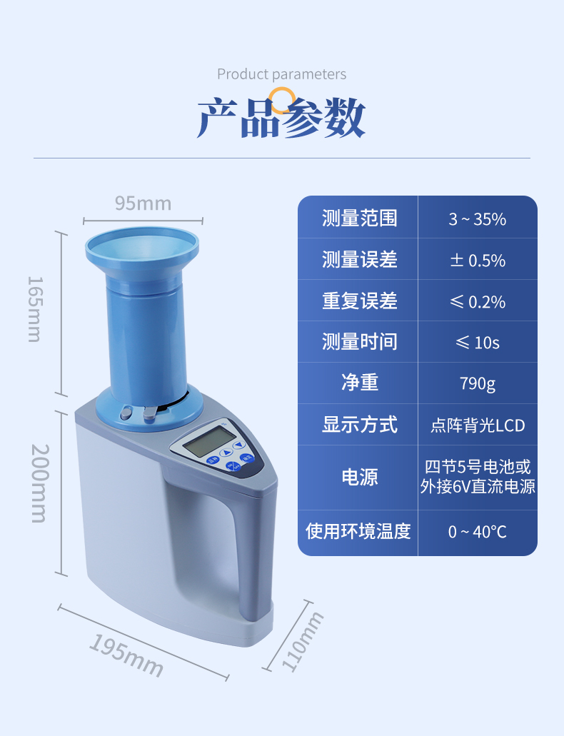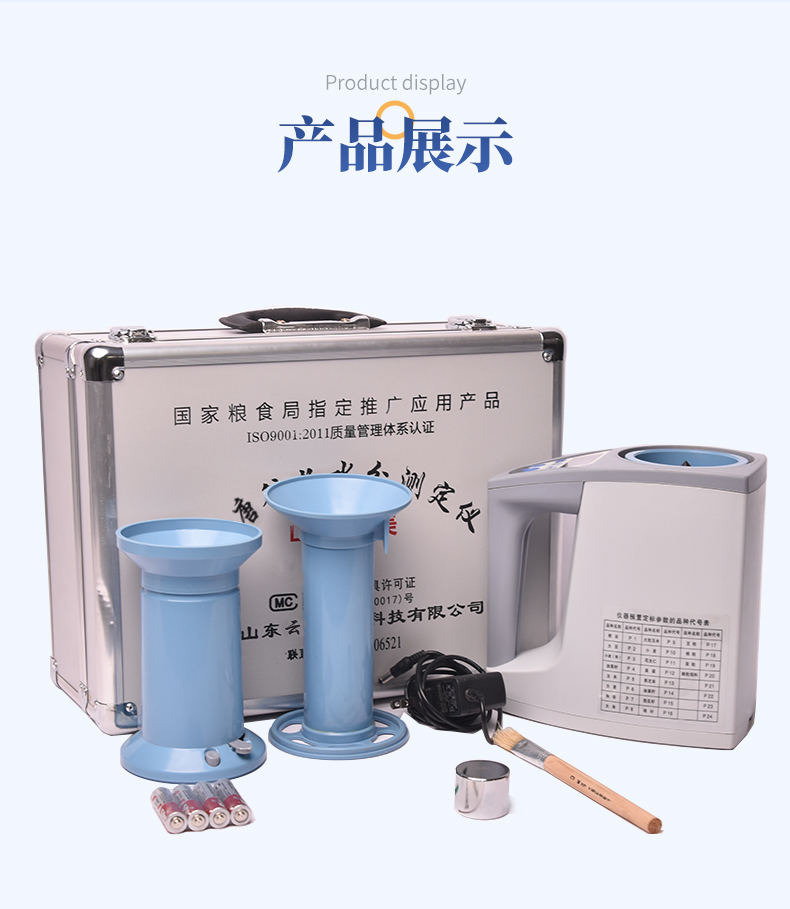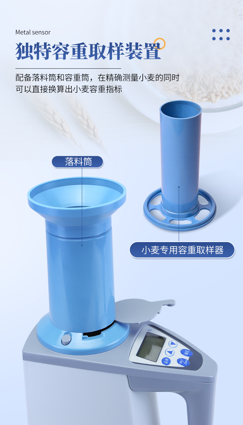 容重换算:独特的专利容重取样装置在**测量小麦的同时,可以直接换算出小麦容重指标。 | 测量范围:可测量谷类、玉米、东北玉米、大麦、小麦、白小麦、大米、豆粕、花生仁、菜粕、高粱、黑芝麻、棉籽、棉粕、籼谷、大豆、油菜籽、饲料、蔬菜种子等非金属颗粒状物质。 | 快速准确:数秒内即可显示结果,测量误差≤±0.5℅ | 操作简单:20个常见品种已预先定标,不需秤样、用料简取样后可立即测量水分 | 水分测量范围:3-35℅ | 使用环境温度:0~40℃ | 温度补偿:自动 | 定 标:浮动四点定标,品种不限(常见品种20个已预先定标,可直接测量) | 工作电源,直流6V(5号干电池四节) | 自动关机:超过三分钟无操作自动关机。 | 便携方便:重约1千克、外型小巧、电源交直流二用,适合各种工作场合 | 适合国情:用户可对本地特殊品种采用本机独创的四点定标法自行定标,自行修正水分值 | 高性价比:技术含量高,性能**而价格相比同类产品较低。 |