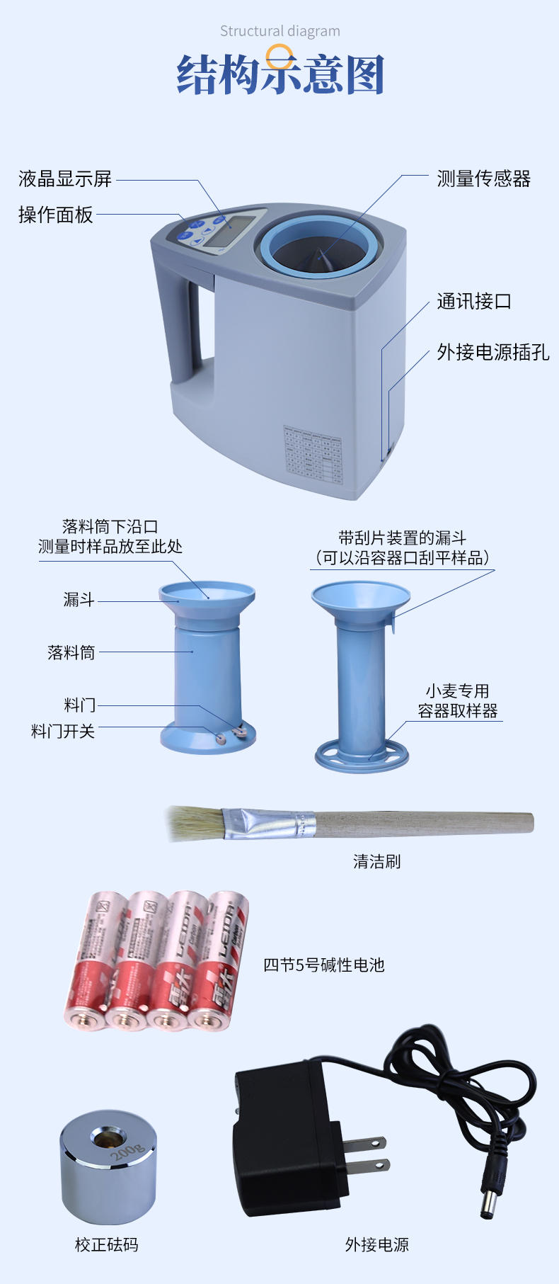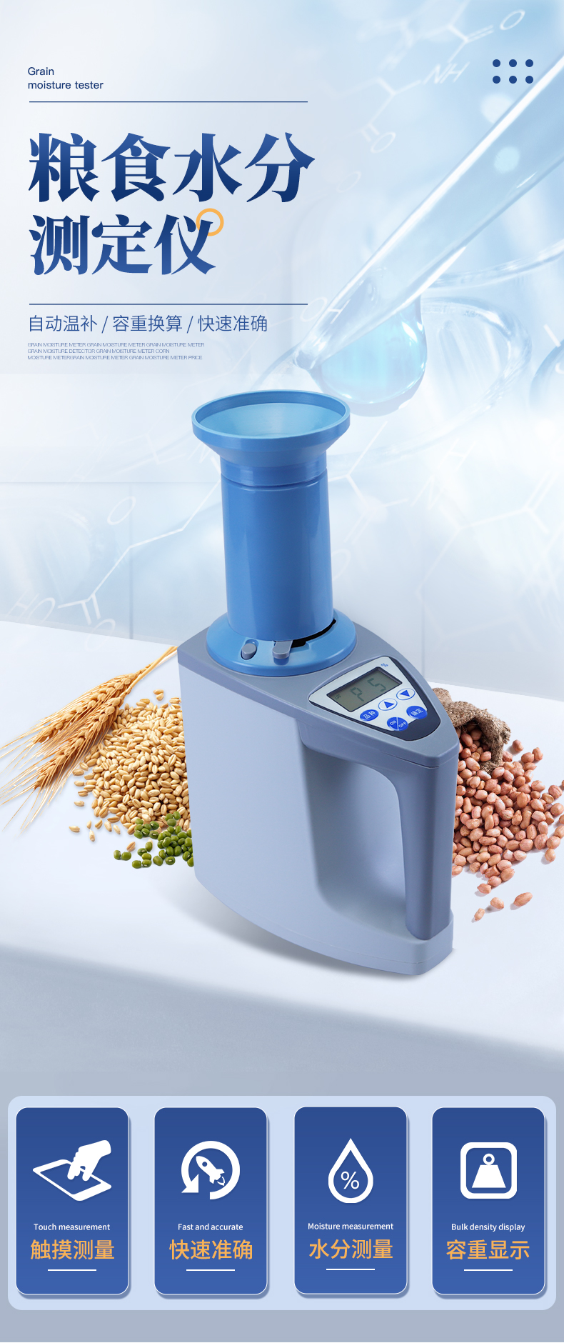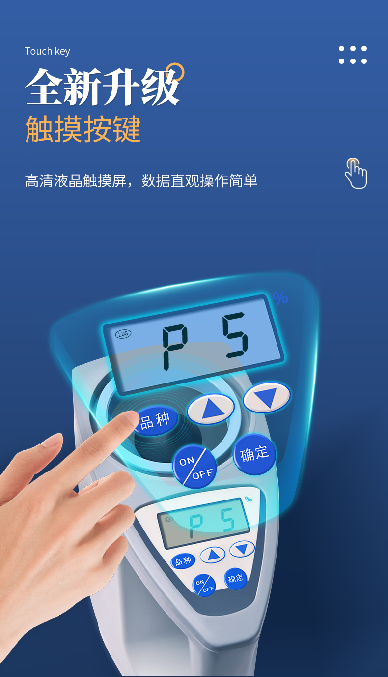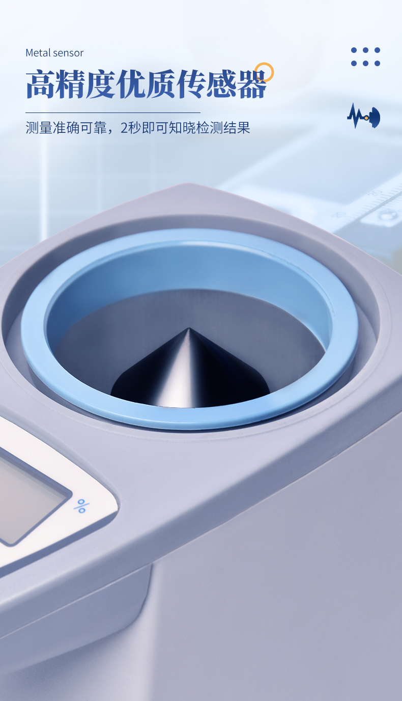 容重换算:独特的专利容重取样装置在**测量小麦的同时,可以直接换算出小麦容重指标。 | 测量范围:可测量谷类、玉米、东北玉米、大麦、小麦、白小麦、大米、豆粕、花生仁、菜粕、高粱、黑芝麻、棉籽、棉粕、籼谷、大豆、油菜籽、饲料、蔬菜种子等非金属颗粒状物质。 | 快速准确:数秒内即可显示结果,测量误差≤±0.5℅ | 操作简单:20个常见品种已预先定标,不需秤样、用料简取样后可立即测量水分 | 水分测量范围:3-35℅ | 使用环境温度:0~40℃ | 温度补偿:自动 | 定 标:浮动四点定标,品种不限(常见品种20个已预先定标,可直接测量) | 工作电源,直流6V(5号干电池四节) | 自动关机:超过三分钟无操作自动关机。 | 便携方便:重约1千克、外型小巧、电源交直流二用,适合各种工作场合 | 适合国情:用户可对本地特殊品种采用本机独创的四点定标法自行定标,自行修正水分值 | 高性价比:技术含量高,性能**而价格相比同类产品较低。 |