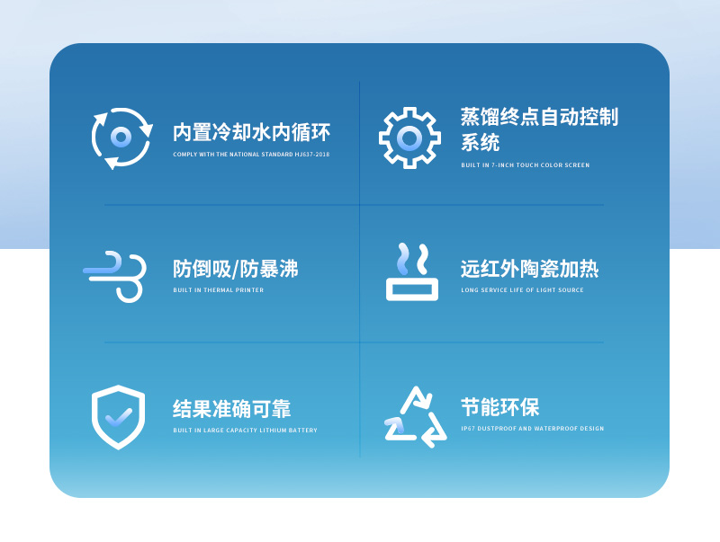 该仪器实验了控温、自动防倒吸、加热均匀、防止暴沸、智能终点控制等功能。使用方便,节能环保。经过实验室蒸馏回收率比对验证,结果准确,回收率达95%以上。该仪器可广泛适用于环保、疾控、水产、供排水、高校、科研院所、厂矿企业等各类化学实验室需要蒸馏处理的场所,如挥发酚、氨氮、凯氏氮油中水分等项目的蒸馏处理。