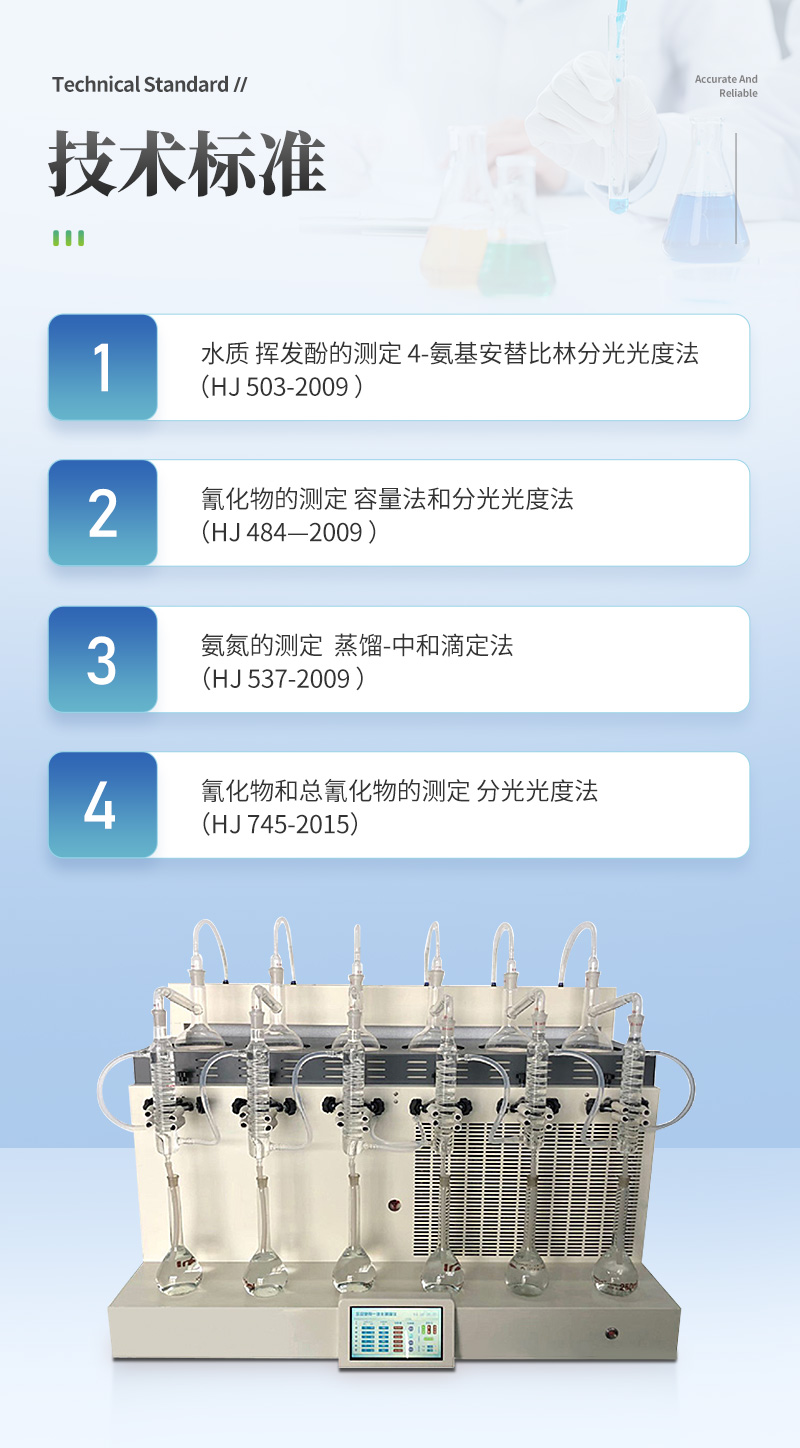 食品中二氧化硫残留量、酒精度的蒸馏前处理项目 | 1.水质 挥发酚的测定 4-氨基安替比林分光光度法(HJ 503-2009 ) | 2.水质 青化物的测定 容量法和分光光度法(HJ 484—2009 ) | 3.水质 氨氮的测定 蒸馏-中和滴定法(HJ 537-2009 ) | 4.土壤 青化物和总青化物的测定 分光光度法(HJ 745-2015) |