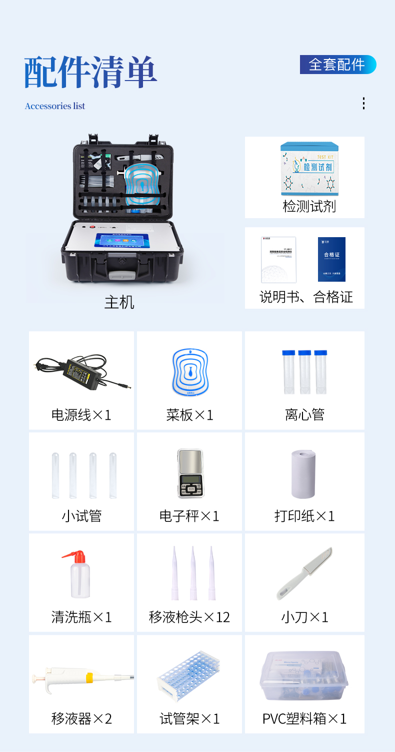 主控芯片采用ARM Cortex-A7,RK3288/4核处理器,主频1.88Ghz,运转速度更快速,稳定性更强。 | 显示方式:7英寸液晶触摸屏显示,人性化中文操作界面,读数直观、简单。 | 交直流两用,直流12V供电,可连接车载电源,可配6ah大容量充电锂电池,方便户外流动测试。 | 四波长冷光源,每个通道均配置410、520、590、630nm波长光源,标配**的光路切换装置,专利光路切换功能可实现*多64波长,并且所有检测项目可实现所有通道同时检测。 | 光源亮度自动调节与校准 | 智能恒流稳压,光强自动校准,长时间连续工作光源无温漂现象。 | 内置新国家限量标准,与所测结果进行现场比对,并持续更新标准。 | 不间断进样,连续检测 | 样本编号自动累加。 | 数据无线上传平台,并可从平台导出为Excel表格。 | 检测结果存储容量20万条 | 同时支持U盘拷贝,标准USB接口,免驱动插拔。 | 检测项目可扩充,固件可升级 | 仪器尺寸:43×35×20cm, 主机净重:5.2kg |