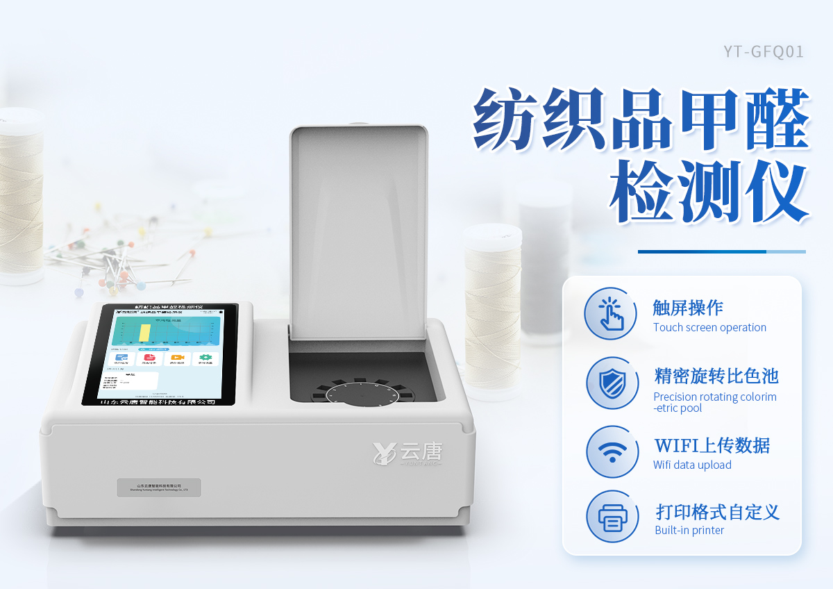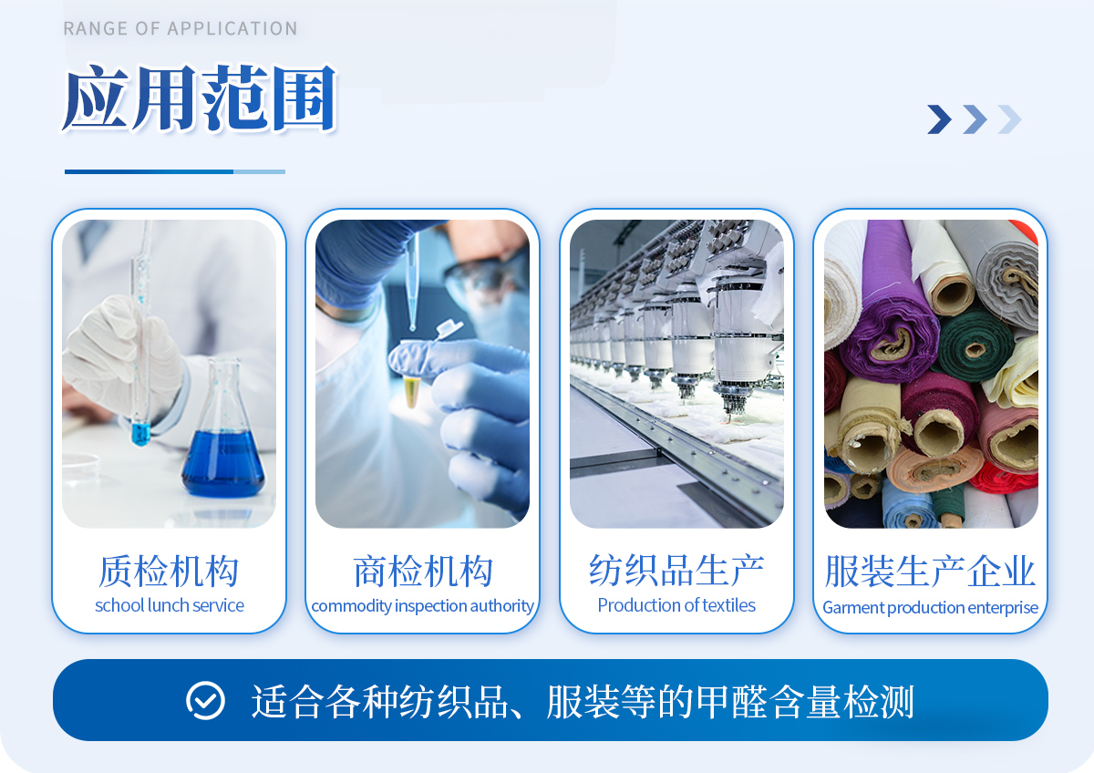 本套纺织品甲醛检测设备满足纺织品甲醛含量检测的中国标准《国家纺织产品基本安全技术规范》(GB 18401-2010)、《纺织品·甲醛的测定·第1部分:游离和水解的甲醛(水萃取法)》(GB/T 2912.1-2009), 适合各种纺织品、服装等的甲醛含量检测。