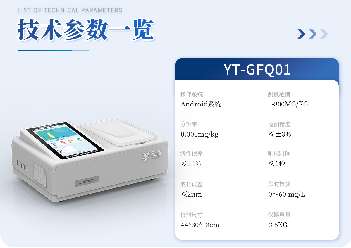 1、智能**且方便 | ①智能芯片:主控芯片采用ARM Cortex-A7,RK3288/4核处理器,搭配安卓智能操作系统,集实验操作,分析结果,打印报告等功能于一体,使用方便,性能更强。 | ②大屏显示:采用10.1英寸液晶触摸屏,单机即可操作,无需连接外部显示或控制器。 | ③多样同检:仪器具有12个检测通道,可同时一次性检测11个样品,效率更高。 | ④工作预设:具有任务预设模块,一键提前预设样品所有信息内容。来样时可直接检测,同时可多次调取。 | ⑤数据分析:设备首页自动汇总分析数据,并绘制柱形分析图,各项检测数据一目了然,快捷直观。 | ⑥高度集成:模块高度集合,将分光光度模块、数字化管理模块、无线通讯模块集成于一体。可将检测结果进行分析,直接上传至数据平台,实现数据共享,方便后期进行数据分析与统计。 | ⑦远程升级:仪器具备远程升级功能,可远程升级程序,无需返厂,并可持续性免费更新系统版本,降低成本及运输损耗风险。 | 2、检测精准且直观 | ①专利技术:精密旋转比色池,使用同芯片同光源校准精度,解决不同光源之间存在波长误差的问题,更加准确**。 | ②结果直观:仪器自动对检测结果与国标限量值进行对比,自动判定结果是否合格,结果更直观。 | 3、功能强大且实用 | ①存储功能:设备可以存储数据100000组,可在屏幕上直观查看历史数据,可导出数据。 | ②打印功能:设备自带打印功能,可对样品信息及检测结果无限次随意打印。 | ③全新方式:新创自定义打印方式,可按需灵活勾选控制:二维码,抽样信息、检测信息,受检信息、复核信息、抽样日期、检测日期等信息的打印 | ④多重编辑:样品信息可多重编辑,可以对每个通道属性和样品信息单独进行编辑,例如样品信息、抽样信息、检测信息,受检信息、复核信息、抽样日期、检测日期等信息等。 | ⑤双语设计:全中文/英文操作菜单,简单实用,适用于不同用户的需求。 |