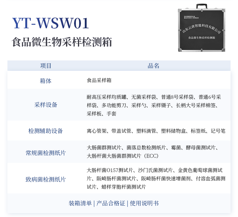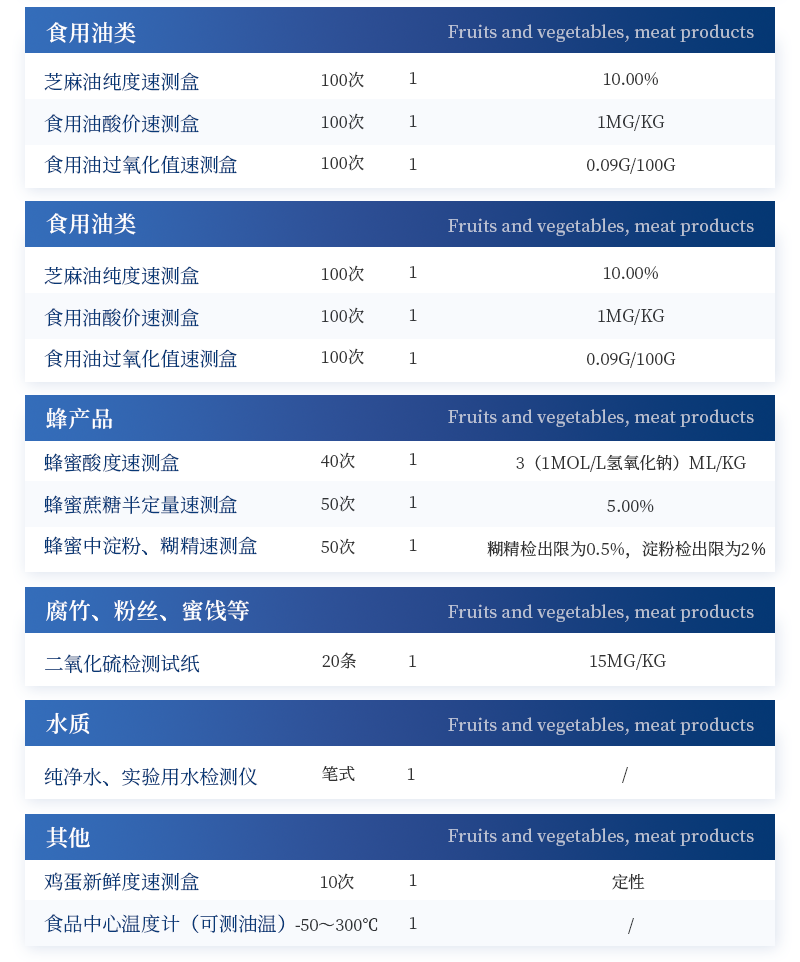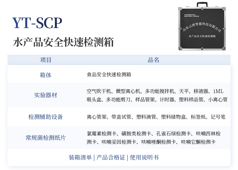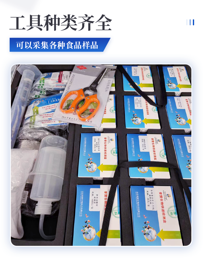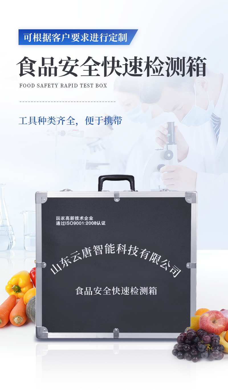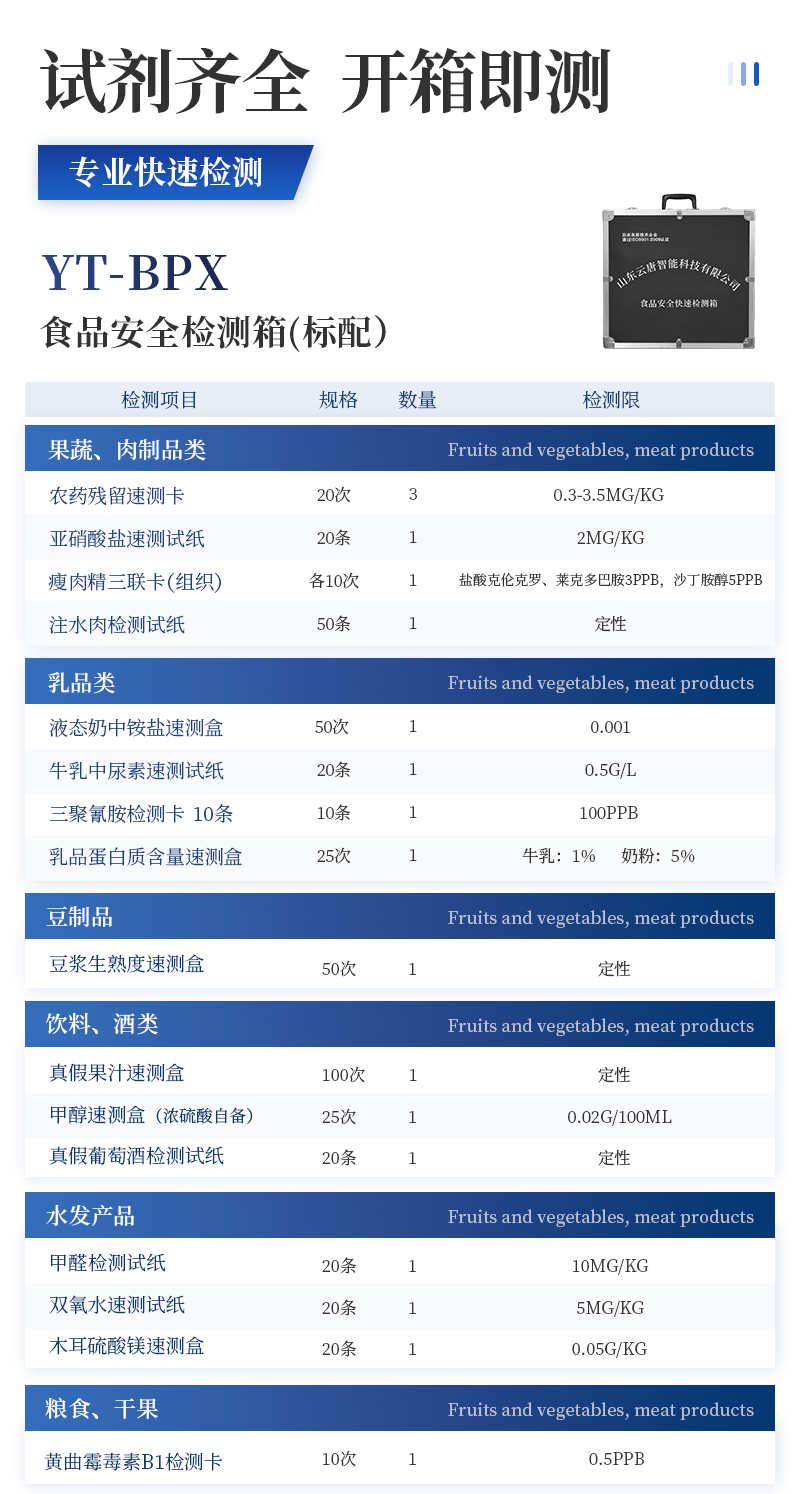 急性中毒快速检测箱标配箱 序号 适用范围 检测项目 规格 单位 数量 检测限 检测范围 1 果蔬、肉制品类 便携式农药残留快速检测仪 12通道 台 1 / / 农药残留速测卡 20次 盒 3 0.3-3.5mg/kg / 亚硝酸盐速测试纸 20条 套 1 2mg/kg 0-40mg/kg 砷速测盒 30次 盒 1 砷:2mg/kg / 汞速测盒 30次 盒 1 汞:20mg/kg / 瘦肉精三联卡(组织) 各10次 包 2 盐酸克伦克罗、莱克多巴胺3ppb,沙丁胺醇5ppb / 2 豆制品 奶制品 液态奶新鲜度速测盒 20次 盒 1 0.60T / 豆浆生熟度速测盒 50次 盒 1 定性 / 3 饮料、酒类 甲醇速测盒(浓硫酸自备) 25次 盒 1 0.02g/100mL 0-0.32g/100mL 4 粮食、干果 黄曲霉毒素B1检测卡 10次 包 1 0.5ppb / 5 食用油类 食用油酸价速测盒 100次 盒 1 1mg/kg 0-8mg/kg 食用油过氧化值速测盒 100次 盒 1 0.09g/100g 0.09-0.45g/100g 6 食物及水 中毒物残留 毒鼠强速测盒(乙酸乙酯自备) 10次 盒 1 2mg/kg / 敌鼠钠盐速测盒 100次 盒 1 100mg/kg / 氰化物检测试纸 20条 套 1 1mg/L 0-10mg/L 氟乙酰胺速测盒 30次 盒 1 50mg/kg / 硼酸和硼砂速测盒 100次 盒 1 25mg/kg 定性 鼠药安妥检测试纸 40次 包 1 0.02mg/g,mL / 鼠药磷化锌速测盒 10次 包 1 20mg/kg / 7 箱体预装辅助设备 急性中毒箱箱体 便携式 个 1 / / 便携水浴锅 功率300W 个 1 多功能剪刀 - 把 1 计算器 - 个 1 洗瓶 250ml 个 1 塑料滴管 3ml 根 10 塑料滴管 0.2ml 根 50 样品管架 10ml 个 1 天平 0.1-200g 个 1 移液器 1mL 支 1 玻璃三角瓶 100ml 个 2 玻璃样品管 10ml 个 2 小离心管 1.5ml 个 24 塑料样品管 10ml 个 10 样品瓶 50ml 个 2 离心管架 1.5ml 个 1 烧杯 250ml 个 1 量筒 100ml 个 1 手套 - 包 1 计时器 - 个 1 枪头 1ml 个 20 组织提取器 便携式 个 1 锡箔纸 10张/包 包 1 装箱清单 - 份 1 产品合格证 - 份 1 使用说明书 - 份 1 |