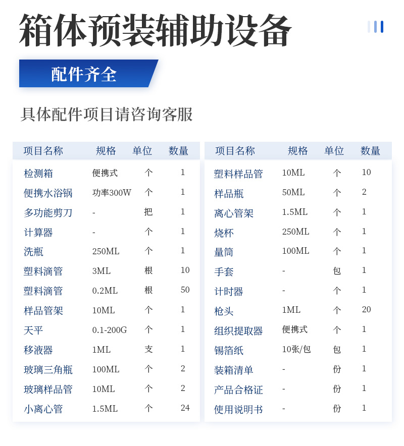 水产品安全快速检测箱 序号 适用范围 检测项目 规格 单位 数量 检测限 检测范围 1 果蔬、肉制品类 农药残留速测卡 20次 盒 5 0.3-3.5mg/kg / 亚硝酸盐速测试纸 20条 套 1 2mg/kg 0-40mg/kg 硝酸盐速测管 20次 盒 1 0.5mg/kg 0.5-10mg/kg(以N计) 瘦肉精三联卡(组织) 各10次 包 1 盐酸克伦克罗、莱克多巴胺3ppb,沙丁胺醇5ppb / 注水肉检测试纸 50条 袋 1 定性 / 2 乳品类 三聚氰胺检测卡 10条 包 1 100ppb / 乳品蛋白质含量速测盒 25次 盒 1 牛乳:1% 奶粉:5% 牛乳0-5%; 乳粉0-25% 3 豆制品 豆浆生熟度速测盒 50次 盒 1 定性 / 4 水发产品 甲醛检测试纸 20条 套 1 10mg/kg / 双氧水速测试纸 20条 套 1 5mg/kg 0-30mg/kg 水发食品中工业碱速测试纸 20条 套 1 0.4g/L / 5 粮食、坚果 硼酸和硼砂速测盒 100次 盒 1 25mg/kg 定性 吊白块半定量速测盒 100次 盒 1 2.5mg/kg 0-100mg/L 大米新陈度检测喷剂 50次 盒 1 定性 / 大米中石蜡/矿物油速测盒 100次 盒 1 1.00% / 黄曲霉毒素B1检测卡 10次 包 1 0.5ppb / 6 食用油类 食用油酸价速测盒 100次 盒 1 1mg/kg 0-8mg/kg 食用油过氧化值速测盒 100次 盒 1 0.09g/100g 0.09-0.45g/100g 7 调味品 食醋总酸速测盒 20次 盒 1 0.26g/100mL / 工业乙酸速测盒 100次 盒 1 定性 / 食醋游离矿酸速测试纸(浅色醋) 20条 套 1 0.50% / 食醋游离矿酸速测试纸(深色醋) 20条 套 1 0.50% / 食盐含碘量速测试纸 20条 套 1 15mg/kg 0-40mg/kg 味精谷氨酸钠速测盒 15次 盒 1 2.60% / 酱油总酸与氨基酸态氮速测盒 20次 盒 1 总酸: 0.45g/100mL氨基酸态氮:0.078g/100mL / 8 腐竹、粉丝、蜜饯等 二氧化硫检测试纸 20条 套 1 15mg/kg 0-150mg/kg 9 其他 鸡蛋新鲜度速测盒 10次 盒 1 定性 / 食品中心温度计(可测油温) -50~300℃ 支 1 / / 10 箱体预装辅助设备 食品安全快速检测箱I 便携式 个 1 / / 便携水浴锅 功率300W 个 1 多功能剪刀 - 把 1 计算器 - 个 1 洗瓶 250ml 个 1 塑料滴管 3ml 根 10 塑料滴管 0.2ml 根 50 样品管架 10ml 个 1 天平 0.1-200g 个 1 移液器 1mL 支 1 玻璃三角瓶 100ml 个 2 玻璃样品管 10ml 个 2 小离心管 1.5ml 个 24 塑料样品管 10ml 个 10 样品瓶 50ml 个 2 离心管架 1.5ml 个 1 烧杯 250ml 个 1 量筒 100ml 个 1 手套 - 包 1 计时器 - 个 1 枪头 1ml 个 20 组织提取器 便携式 个 1 锡箔纸 10张/包 包 1 装箱清单 - 份 1 产品合格证 - 份 1 使用说明书 - 份 1 |