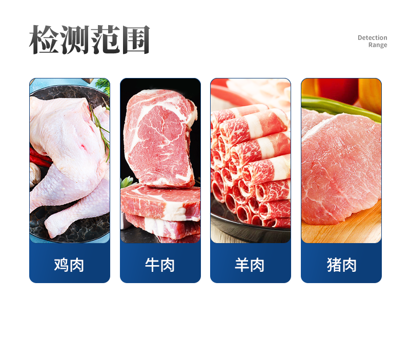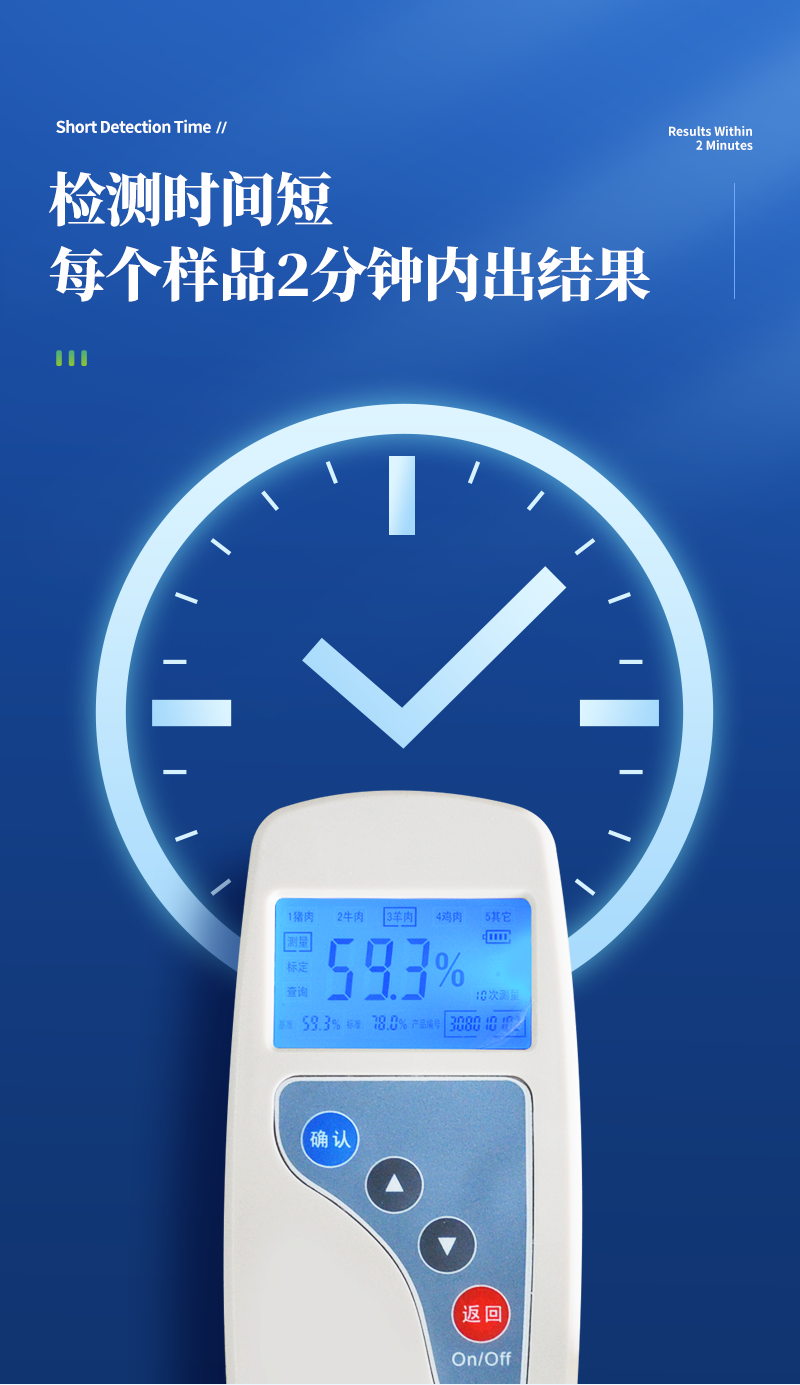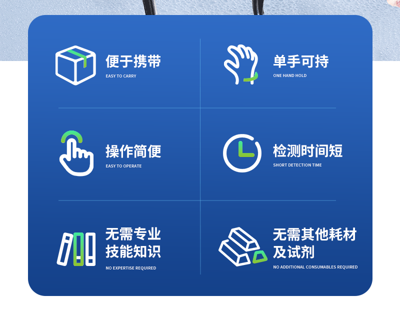便于携带,单手可持 | 可根据测定对象的品种,设定相应的判断标准值 | 操作简便,检测人员无需专业技能知识 | 检测时间短,每个样品2分钟内出结果; | 检测试验无需其他耗材及试剂 |