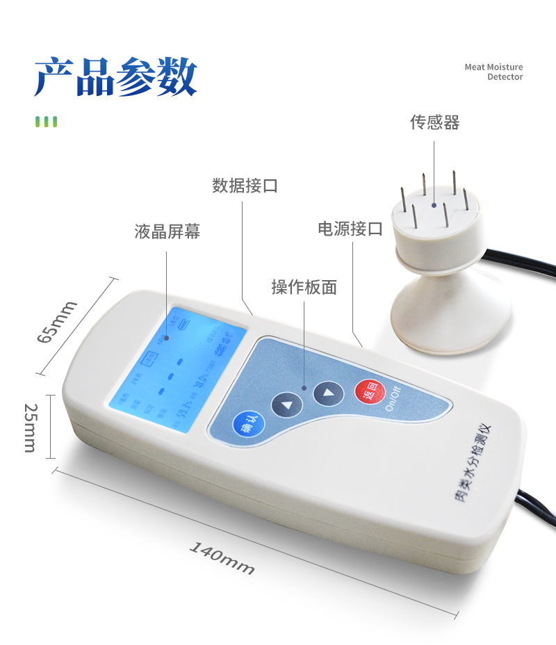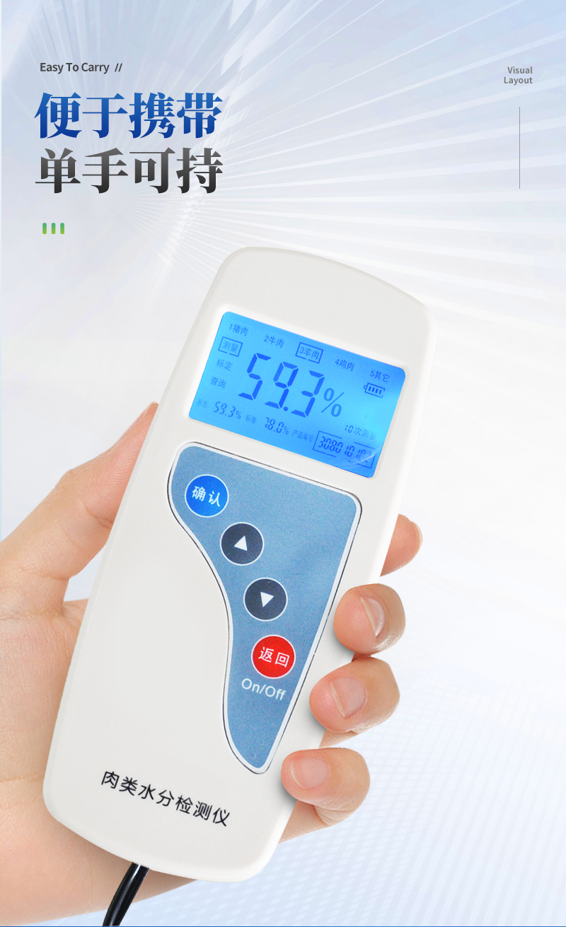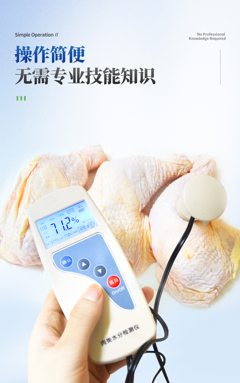 肉类水分检测仪主要用于快速猪肉、牛肉、鸡肉等动物肉类水分含量,从而判断所测样品是否为注水肉,该仪器设计精巧,单手可持,仪器可根据测定对象的品种,设定相应的判断标准值。