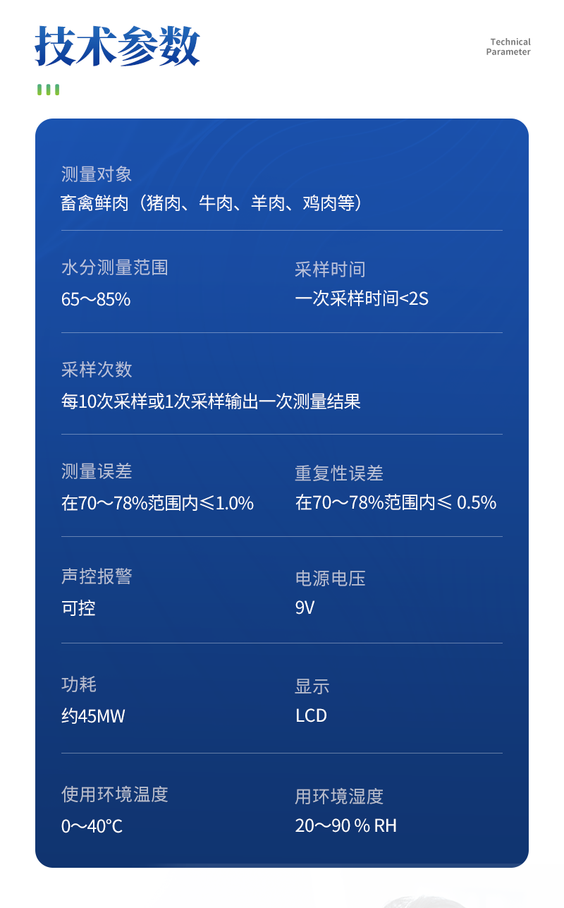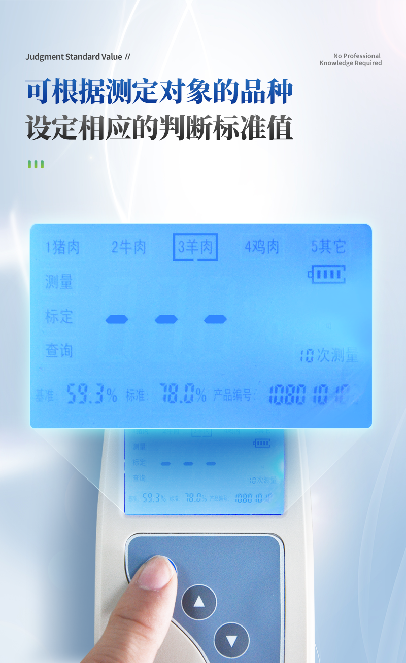 畜禽鲜肉(猪肉、牛肉、羊肉、鸡肉等) | 65~85% | 一次采样时间< 1s | 每10次采样或1次采样输出一次测量结果 | 在70~78%范围内≤1.0% | 在70~78%范围内≤ 0.5% | 超标报警 | 可设定每个品种的判断标准。 | 交直流两用 | 触摸式按键 | 45mW | 167×70×30mm | 蓝色背光LCD | 0~40℃ | 20~90 % RH | USB接口 |