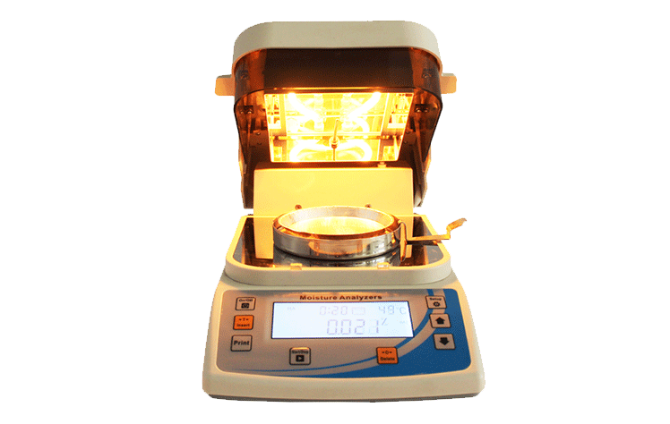 环状的卤素灯确保样品得到均匀加热,操作简便、测量准确。水分测定仪在测量样品重量的同时,仪器采用环形管卤素加热方式,快速干燥样品,在干燥过程中,水分仪持续测量并即时显示样品丢失的水分含量%,干燥程序完成后,*终测定的水分含量值被锁定显示。与国际烘箱加热法相比,卤素加热可以在高温下将样品均匀地快速干燥,样品表面不易受损,其检测结果与国标烘箱法具有良好的一致性,具有可替代性,且检测效率远远高于烘箱法。智能化操作,一般样品只需几分钟即可完成测定。该仪器操作简单,测试准确,显示部分采用液晶显示屏-使屏幕更加清晰明亮,示值清晰可见,分别可显示水分值,样品初值,终值,测定时间,温度初值,*终值等数据,并具有与计算机,打印机连接功能、符合GLP规范的打印数据输出。