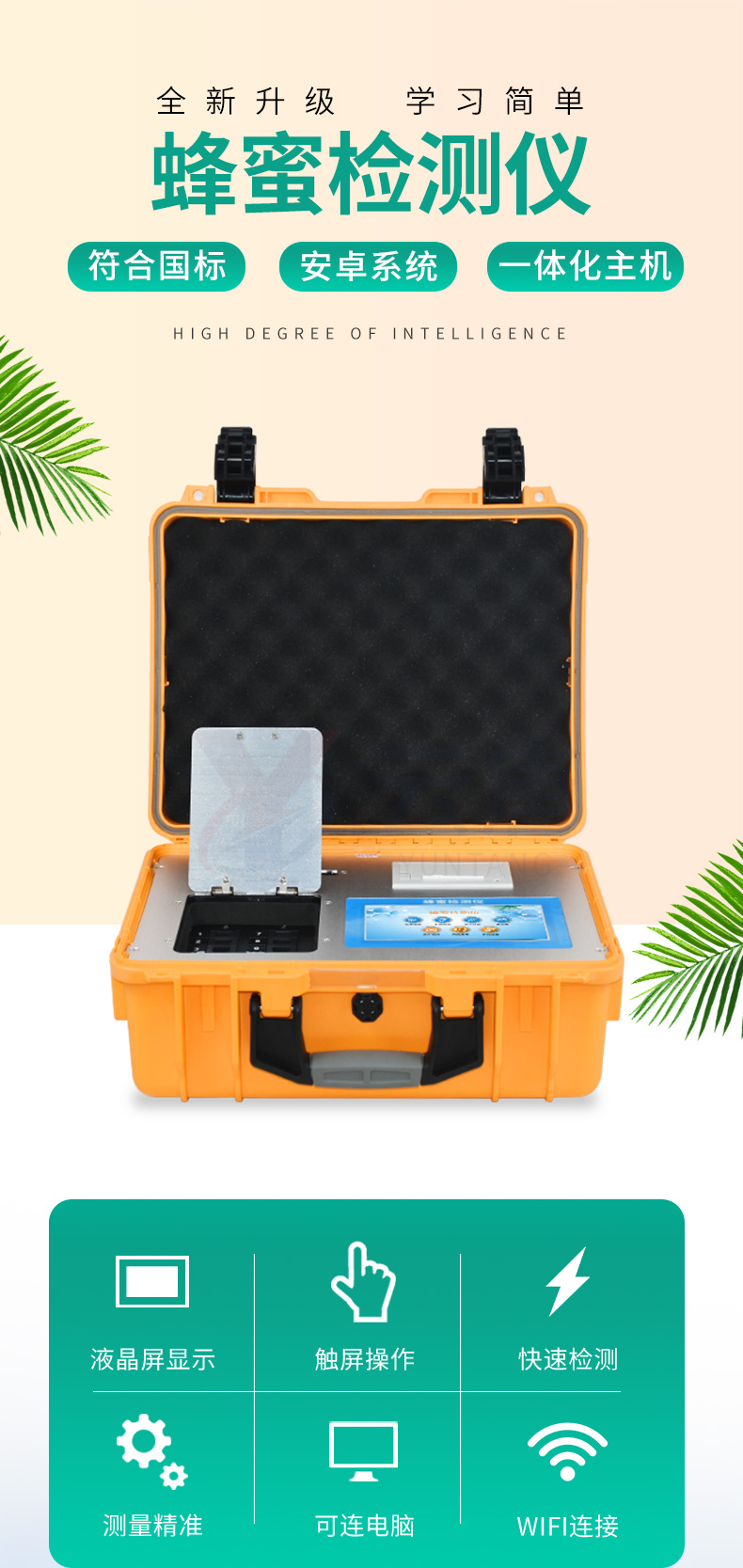 检测项目:蜂蜜蔗糖、蜂蜜还原糖(葡萄糖和果糖)、蜂蜜羟甲基糠醛、蜂蜜酸度、蜂蜜中农药残留、蜂蜜淀粉酶值、蜂蜜中脯氨酸、蜂蜜水分、蜂蜜糖分、蜂蜜中重金属(铅、镉、汞)、蜂蜜中抗生素(氯霉素、四环素、磺胺类、呋喃类、喹诺酮类)、蜂蜜中灰分,应用范围:应用于现场检测蜂蜜蔗糖、葡萄糖和果糖、羟甲基糠醛、酸度、农残、淀粉酶、脯氨酸、水分、糖分、重金属、抗生素、灰分含量的蜂蜜快速检测仪,可广泛应用于各类蜂蜜品质的快速定量检测。