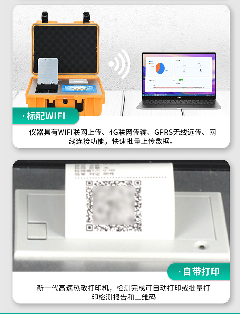 安卓智能操作系统,采用更加**UI交互界面,仪器具有wifi联网上传、4G联网传输、GPRS无线远传、网线连接功能,快速批量上传数据。 | 智能化程度高,仪器具有自检功能:具有开机自检和调零功能,具有自动检测重复性功能。 | 新一代高速热敏打印机,检测完成可自动打印或批量打印检测报告和二维码。 | 仪器带有监管平台,数据可局域网和互联网数据上传,检测结果直接传至食品安全监管平台。进行区域食品安全监管及大数据分析处理与数据统计,检测区域食品安全长短期动态,达到食品安全问题预估、预警 | 一体化主机,包含光电比色检测模块、胶体金免疫层析检测模块。 | 一体化便携式快检设备,满足现场及流动检测使用需求,能够在同一软件下实现所有检测项目的检测,并可通过同一窗口直观显示检测结果。 | 胶体金模块检测方式:轨道式自动传输扫描,检测完成后自动退出检测卡。 | CT线自动识别,无需手动调整。 | 仪器具有多品类多种类样品菜单库,可灵活选择检测样品,不同的检测通道可同时检测不同的样品项目。也可在仪器上直接编辑录入样品名称、检测指标、送检单位等信息并保存进样品数据库。 | 仪器内置操作视频,是您身边的化验指导专家。 | 样品处理简单省力,整体操作快速、安全、便捷。 | 仪器具有自身保护功能,可设置用户名及密码,防止非工作人员操作等。 | 高灵敏度,高检测精度,高重复性精度,扫描式高精度光学传感器。 | 仪器具有重新校准、锁定、恢复出厂设置功能。 | 结果判定线可修改,对照值标定值可保存,断电不丢失数据。 | 兼容市场上所有的胶体金卡,使用耗材不受限制,极大增强用户使用体验。 |