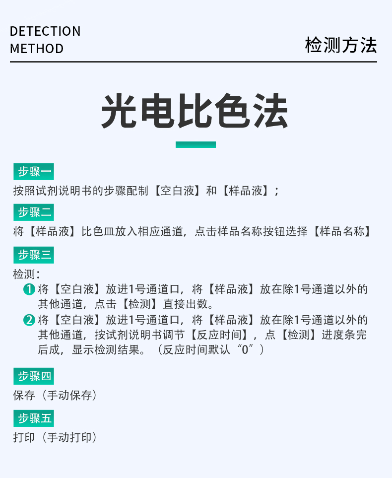 主控芯片采用ARM Cortex-A7,RK3288/4核处理器,主频1.88Ghz,运转速度更快速,稳定性更强。 | 显示方式:7英寸液晶触摸屏显示,人性化中文操作界面,读数直观、简单。 | 交直流两用,直流12V供电,也可连接车载电源,可加配6ah大容量充电锂电池,方便户外流动测试。 | 四波长冷光源,12个检测通道,每个通道均配置410、520、590、630nm波长光源,标配**的光路切换装置,专业光路切换功能可实现*多64波长,并且所有检测项目可实现所有通道同时检测 | 光源亮度自动调节与校准 | 智能恒流稳压,光强自动校准,长时间连续工作光源无温漂现象。 | 内置新国家限量标准,与所测结果进行现场比对,并持续更新标准。 | 不间断进样,连续检测 | 样本编号自动累加。 | 检测结果为Excel表格,连接电脑即可拷贝。 | 检测结果存储容量20万条 | 支持U盘存储,标准USB接口,免驱动安装。 | 检测项目可扩充,固件可升级 | 仪器尺寸:43×35×20cm, 主机净重:5.2g |