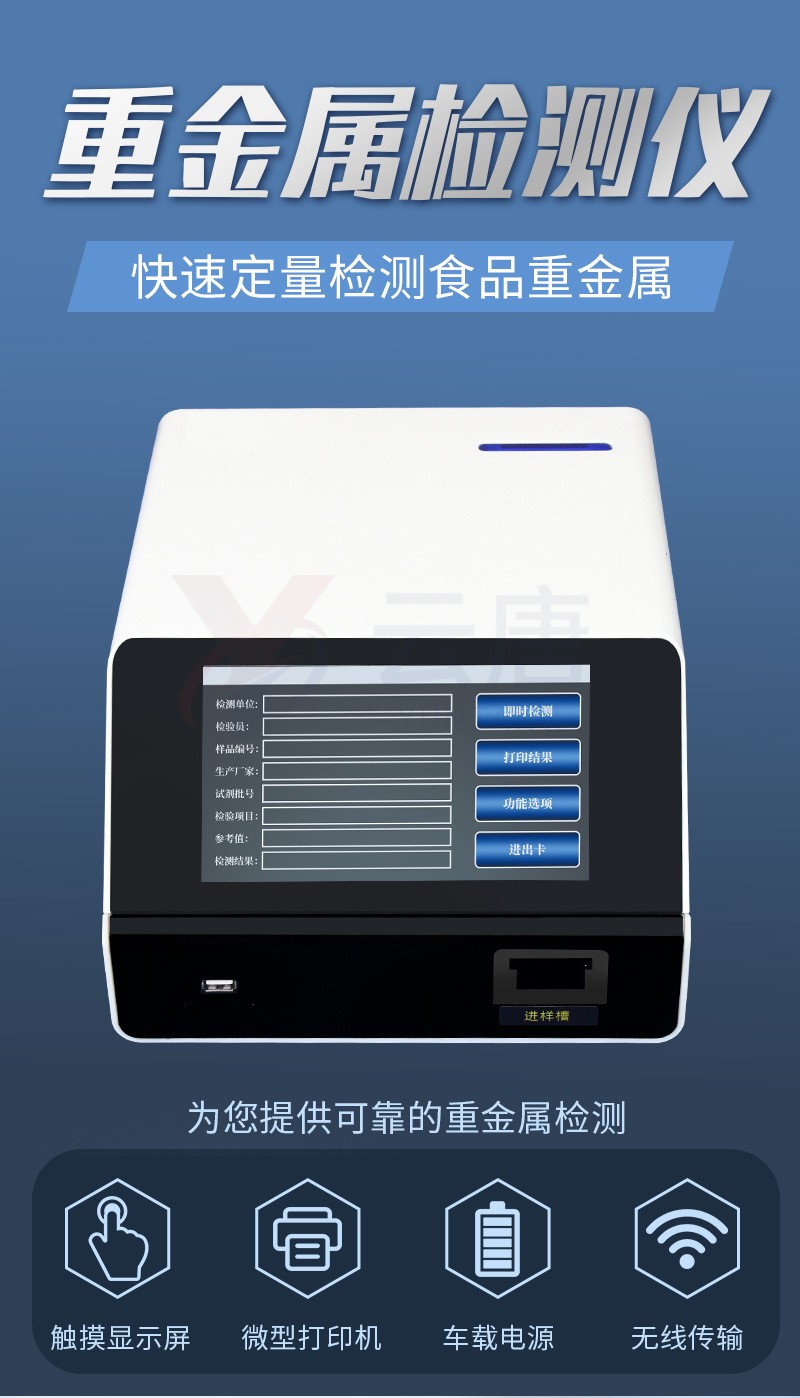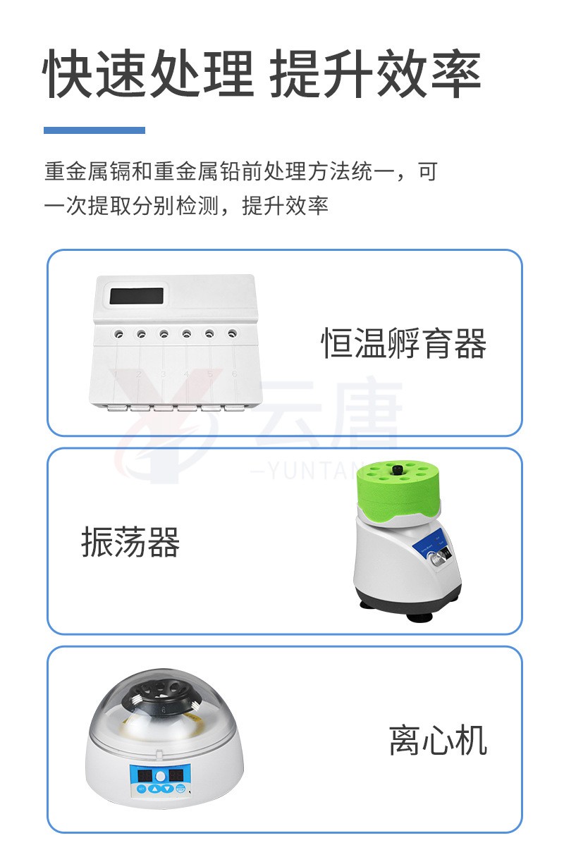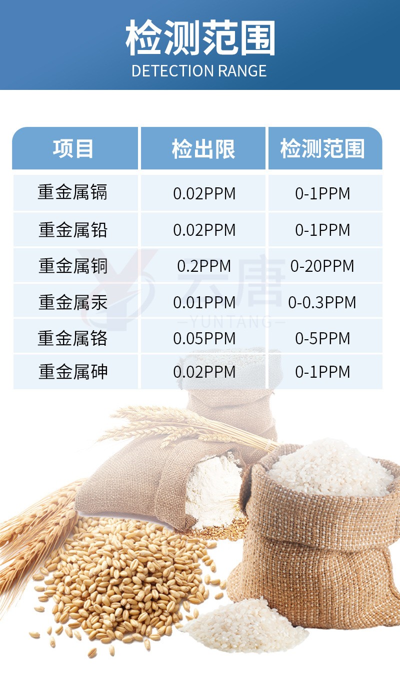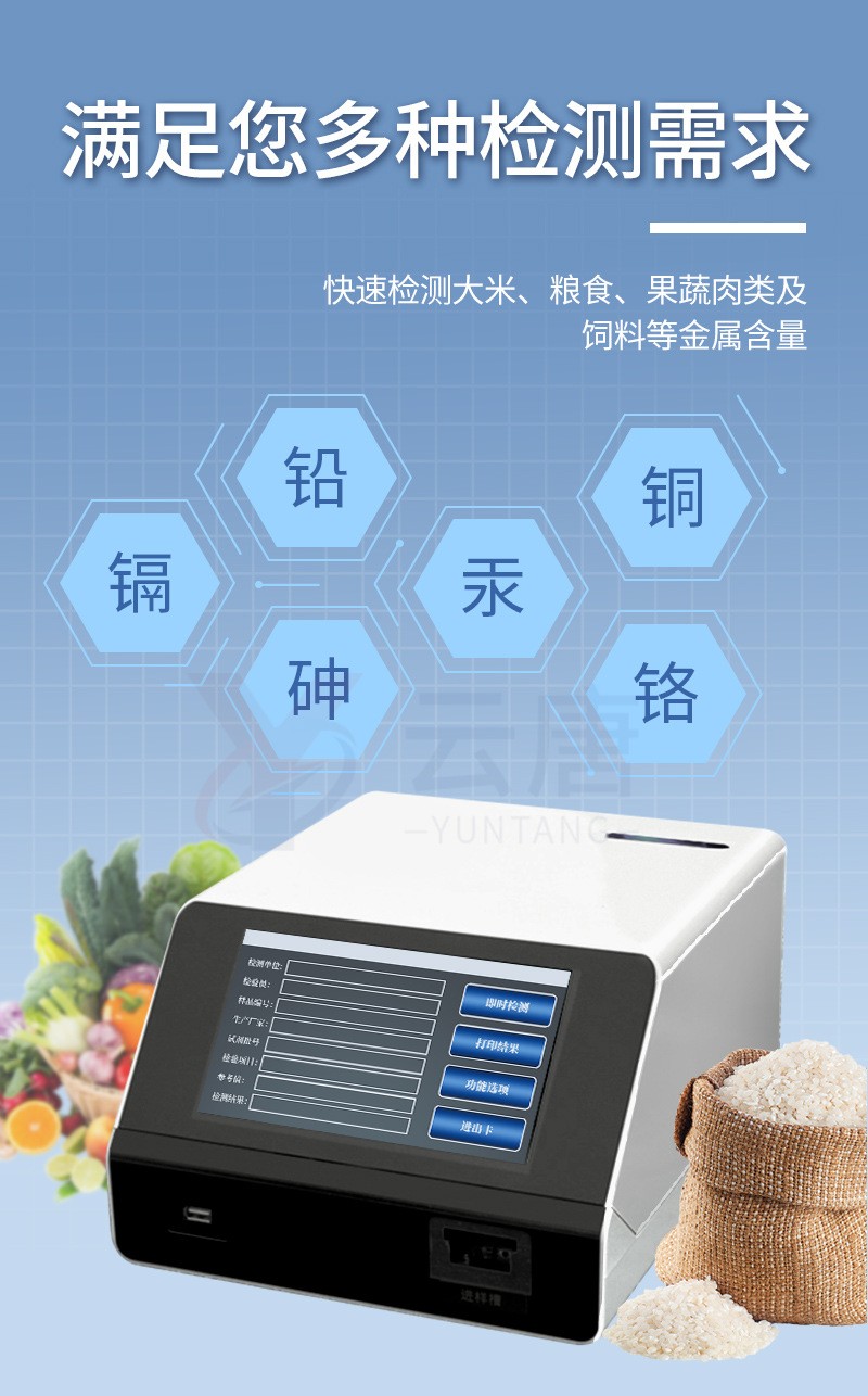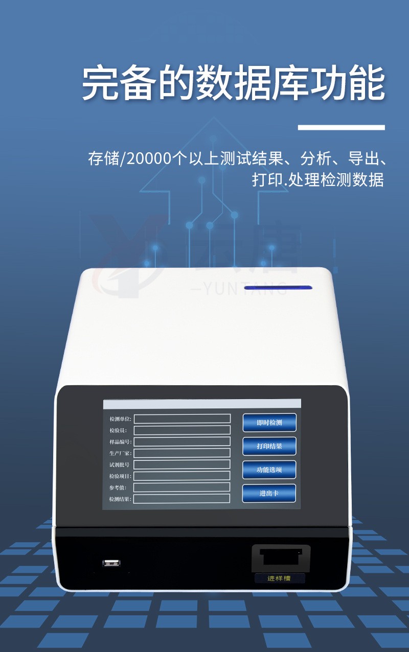 1.仪器能同时检测大米、粮食、粮食制品、饲料、饲料原料中重金属镉、铬、铅、铜等指标。 | 2.具有免疫层析胶体金检测快速检测分析方法,可扩展检测真菌毒素、农药残留,系统采用手提或拉杆设计,满足现场及流动检测的需求。 | 3.内置操作系统,一体式电脑控制,无需外接电脑,能耗≦15W,检测数据和位置信息可发送至网络或数据平台,能够与各类监测信息系统实现无缝对接。配合信息管理平台进行区域安全监管及大数据分析处理,方便食品安全问题预估、预警。 | 4.内置无线传输模块,USB接口,RS232接口,以太网口,数据既可通过无线和有线连接传输,可添加内置GPS定位模块,可实时定位。 | 5.检测仪尺寸:仪器重量3.0kg,7寸彩色电阻触摸显示屏,内存:≥2.05GB,内置微型打印机,无需外接打印设备即可现场打印数据。 | 6.220V电源,车载电源,适合野外现场操作。 | 7.完备的数据库功能(实时显示,存储/20000个以上测试结果、分析、导出、打印、处理检测数据),胶体金检测卡模块储存记录有检测时间、检测单位、检测人员、检测项目、样品编号、检测结果、参考值等。 | 8.免疫层析胶体金检测模块 | (1)采用扫描成像技术及免疫层析胶体金技术,可实现重金属(镉、铅)快速定量检测分析; | (2)检测卡卡槽:≤8×2×0.5cm,检测方式:扫描,扫描精度CV≤1.0%,检测时间≤5秒,测量重复性≤3%,光源:独立稳定恒流光源,探测器:超敏光电传感器。 | (3)标准曲线录入方式:每批检测卡试剂盒配有标准曲线ID卡,标准曲线录入采用自动读取,检测过程无需准备标准品或质控品校准,操作简单; | (4)检测卡采用两线法设计,定量检测精密度(cv):检测卡批内小于15%、批间小于20%,检测卡采用塑料单卡独立包装,防止检测条因暴露于环境而被污染且便于使用和保存,有效期:常温保存6个月有效,2-8℃保存1年有效; | (5)前处理方法统一:重金属镉和重金属铅前处理方法统一,可一次提取分别检测,提升效率; | (6)重金属镉、铅检测产品具有粮食系统国家级检测机构产品评价报告。 | 9.恒温孵育器 | (1)适用于定量胶体金试纸卡和反应液体**控温反应,以提高准确性; | (2)孵育卡槽采用全封闭设计有利于**控温,孵育器卡槽数6个,孵育孔数:6个,控温温度:37℃,控温精度≤0.5℃,升温速度≤10min,温度均匀性≤0.3℃,实时温度显示精度:0.1℃。 | 10.振荡器 | (1)振荡方式:圆周多种模式混匀,可以触发式点动运行、可长时间连续运行,振荡速度范围广,0-2500rpm/min,低速平稳,高速强劲; | (2)能同时振荡提取8个样品,操作时无需操作人员来固定样品进行振荡,减小个人操作差异,提高检测准确性。 | 11.迷你离心机:转速:1000—12000rpm,可自行设定离心转速和时间,体积:20×18×13cm,重量:1.5kg。 | 12.粉碎机:功率≥0.15 千瓦 破碎粒径:小于 0.15mm 破碎样品基本过 20 目筛网。 | 13.电子称:量程:0~200g,分度值:0.01g,不锈钢称台,LCD 显示器,多种称量单位选择。 | 14.移液器:100~1000µL移液器 1支, 20-200µL移液器 1支,轻巧的移液操作按压力,长时间操作不会造成肌肉损伤,移液结果。 | 15.检测项目 | 1.项目:重金属镉;检出限:0.02ppm;检测范围:0-1ppm | 2.项目:重金属铅;检出限:0.02ppm;检测范围:0-1ppm | 3.项目:重金属铜;检出限:0.2ppm;检测范围:0-20ppm | 4.项目:重金属汞;检出限:0.01ppm;检测范围:0-0.3ppm | 5.项目:重金属铬;检出限:0.05ppm;检测范围:0-5ppm | 6.项目:重金属砷;检出限:0.02ppm;检测范围:0-1ppm |