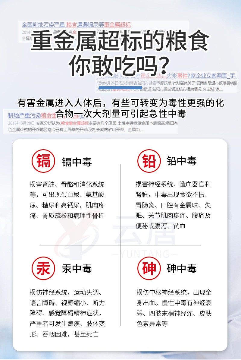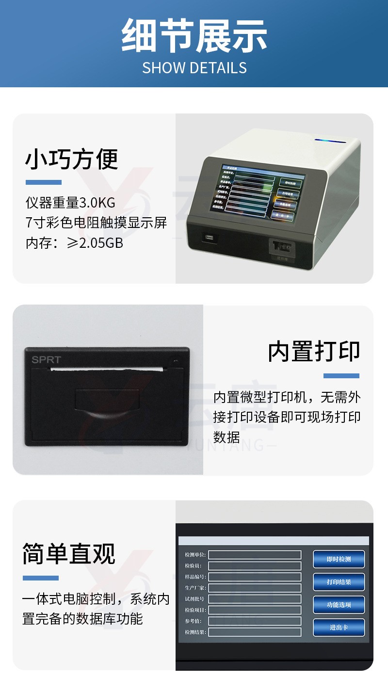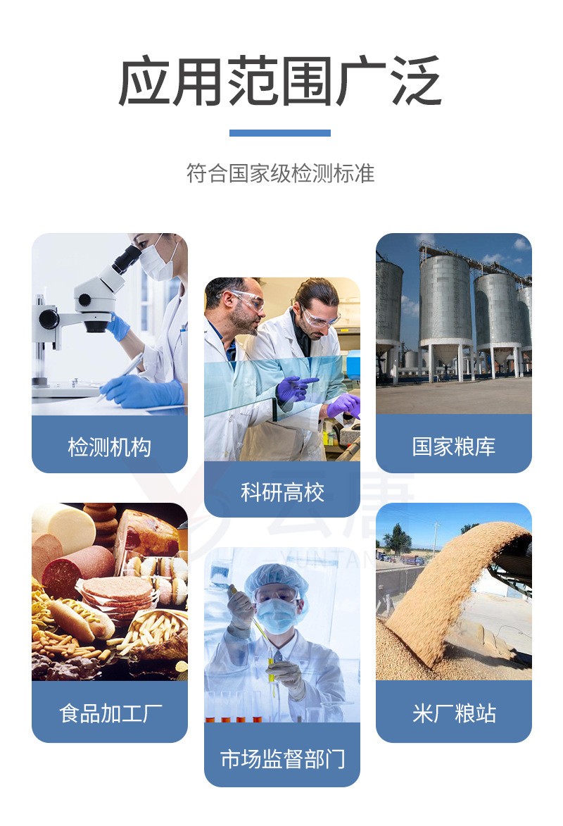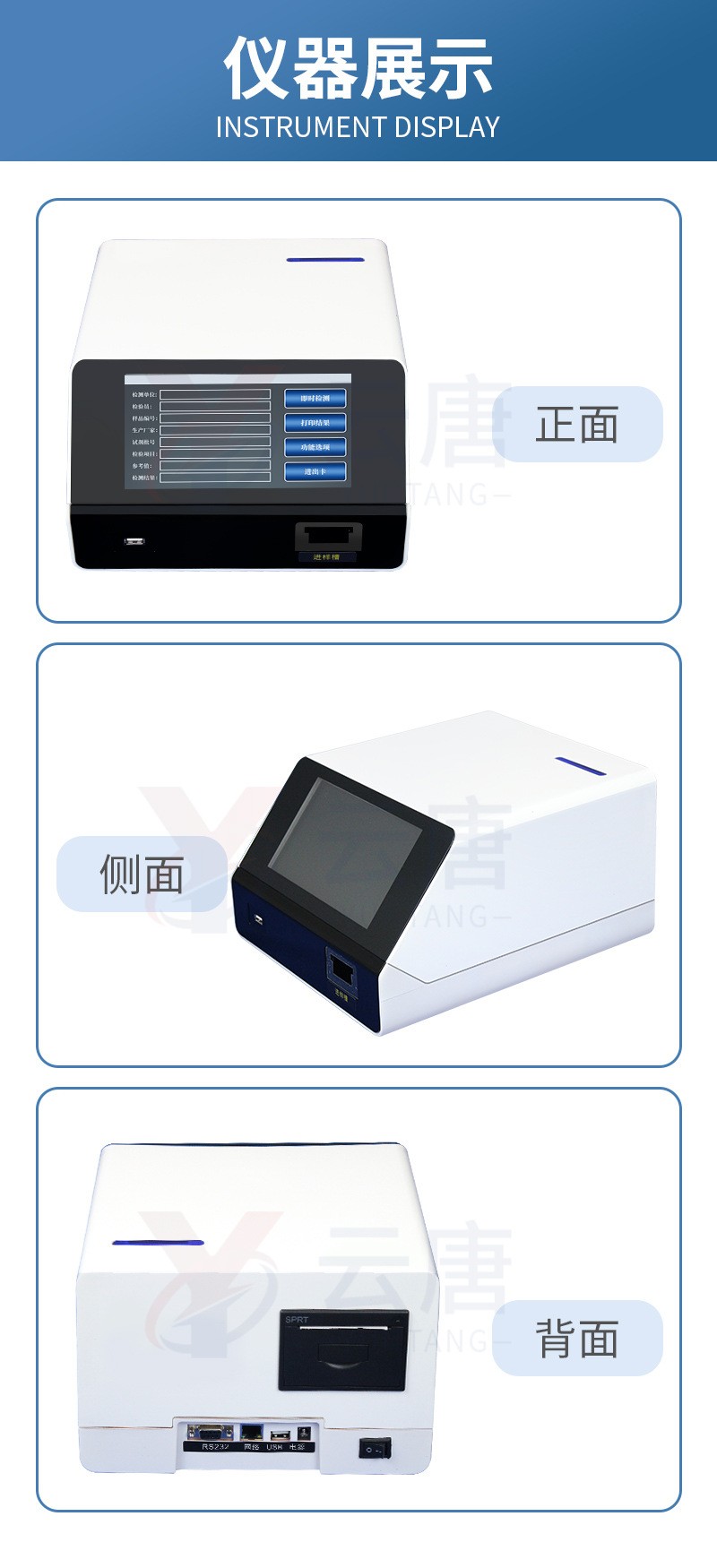 1.仪器能同时检测大米、粮食、粮食制品、饲料、饲料原料中重金属镉、铬、铅、铜等指标。 | 2.具有免疫层析胶体金检测快速检测分析方法,可扩展检测真菌毒素、农药残留,系统采用手提或拉杆设计,满足现场及流动检测的需求。 | 3.内置操作系统,一体式电脑控制,无需外接电脑,能耗≦15W,检测数据和位置信息可发送至网络或数据平台,能够与各类监测信息系统实现无缝对接。配合信息管理平台进行区域安全监管及大数据分析处理,方便食品安全问题预估、预警。 | 4.内置无线传输模块,USB接口,RS232接口,以太网口,数据既可通过无线和有线连接传输,可添加内置GPS定位模块,可实时定位。 | 5.检测仪尺寸:仪器重量3.0kg,7寸彩色电阻触摸显示屏,内存:≥2.05GB,内置微型打印机,无需外接打印设备即可现场打印数据。 | 6.220V电源,车载电源,适合野外现场操作。 | 7.完备的数据库功能(实时显示,存储/20000个以上测试结果、分析、导出、打印、处理检测数据),胶体金检测卡模块储存记录有检测时间、检测单位、检测人员、检测项目、样品编号、检测结果、参考值等。 | 8.免疫层析胶体金检测模块 | (1)采用扫描成像技术及免疫层析胶体金技术,可实现重金属(镉、铅)快速定量检测分析; | (2)检测卡卡槽:≤8×2×0.5cm,检测方式:扫描,扫描精度CV≤1.0%,检测时间≤5秒,测量重复性≤3%,光源:独立稳定恒流光源,探测器:超敏光电传感器。 | (3)标准曲线录入方式:每批检测卡试剂盒配有标准曲线ID卡,标准曲线录入采用自动读取,检测过程无需准备标准品或质控品校准,操作简单; | (4)检测卡采用两线法设计,定量检测精密度(cv):检测卡批内小于15%、批间小于20%,检测卡采用塑料单卡独立包装,防止检测条因暴露于环境而被污染且便于使用和保存,有效期:常温保存6个月有效,2-8℃保存1年有效; | (5)前处理方法统一:重金属镉和重金属铅前处理方法统一,可一次提取分别检测,提升效率; | (6)重金属镉、铅检测产品具有粮食系统国家级检测机构产品评价报告。 | 9.恒温孵育器 | (1)适用于定量胶体金试纸卡和反应液体**控温反应,以提高准确性; | (2)孵育卡槽采用全封闭设计有利于**控温,孵育器卡槽数6个,孵育孔数:6个,控温温度:37℃,控温精度≤0.5℃,升温速度≤10min,温度均匀性≤0.3℃,实时温度显示精度:0.1℃。 | 10.振荡器 | (1)振荡方式:圆周多种模式混匀,可以触发式点动运行、可长时间连续运行,振荡速度范围广,0-2500rpm/min,低速平稳,高速强劲; | (2)能同时振荡提取8个样品,操作时无需操作人员来固定样品进行振荡,减小个人操作差异,提高检测准确性。 | 11.迷你离心机:转速:1000—12000rpm,可自行设定离心转速和时间,体积:20×18×13cm,重量:1.5kg。 | 12.粉碎机:功率≥0.15 千瓦 破碎粒径:小于 0.15mm 破碎样品基本过 20 目筛网。 | 13.电子称:量程:0~200g,分度值:0.01g,不锈钢称台,LCD 显示器,多种称量单位选择。 | 14.移液器:100~1000µL移液器 1支, 20-200µL移液器 1支,轻巧的移液操作按压力,长时间操作不会造成肌肉损伤,移液结果。 | 15.检测项目 | 1.项目:重金属镉;检出限:0.02ppm;检测范围:0-1ppm | 2.项目:重金属铅;检出限:0.02ppm;检测范围:0-1ppm | 3.项目:重金属铜;检出限:0.2ppm;检测范围:0-20ppm | 4.项目:重金属汞;检出限:0.01ppm;检测范围:0-0.3ppm | 5.项目:重金属铬;检出限:0.05ppm;检测范围:0-5ppm | 6.项目:重金属砷;检出限:0.02ppm;检测范围:0-1ppm |