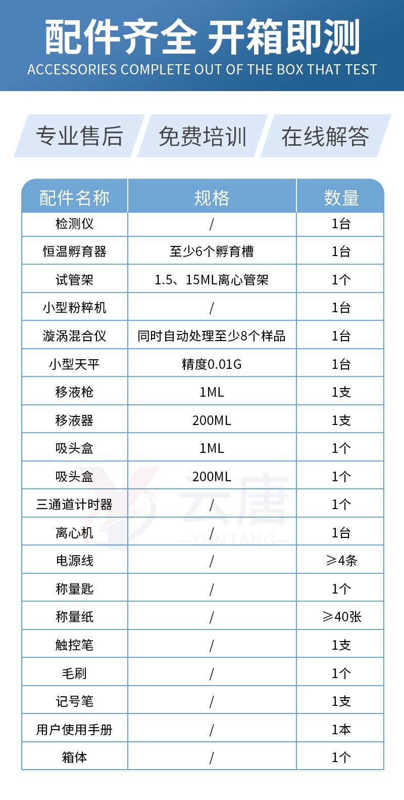 配件名称 | 检测仪 | 恒温孵育器 | 试管架 | 小型粉粹机 | 漩涡混合仪 | 小型天平 | 移液枪 | 移液器 | 吸头盒 | 吸头盒 | 三通道计时器 | 离心机 | 电源线 | 称量匙 | 称量纸 | 触控笔 | 毛刷 | 记号笔 | 用户使用手册 | 箱体 |
