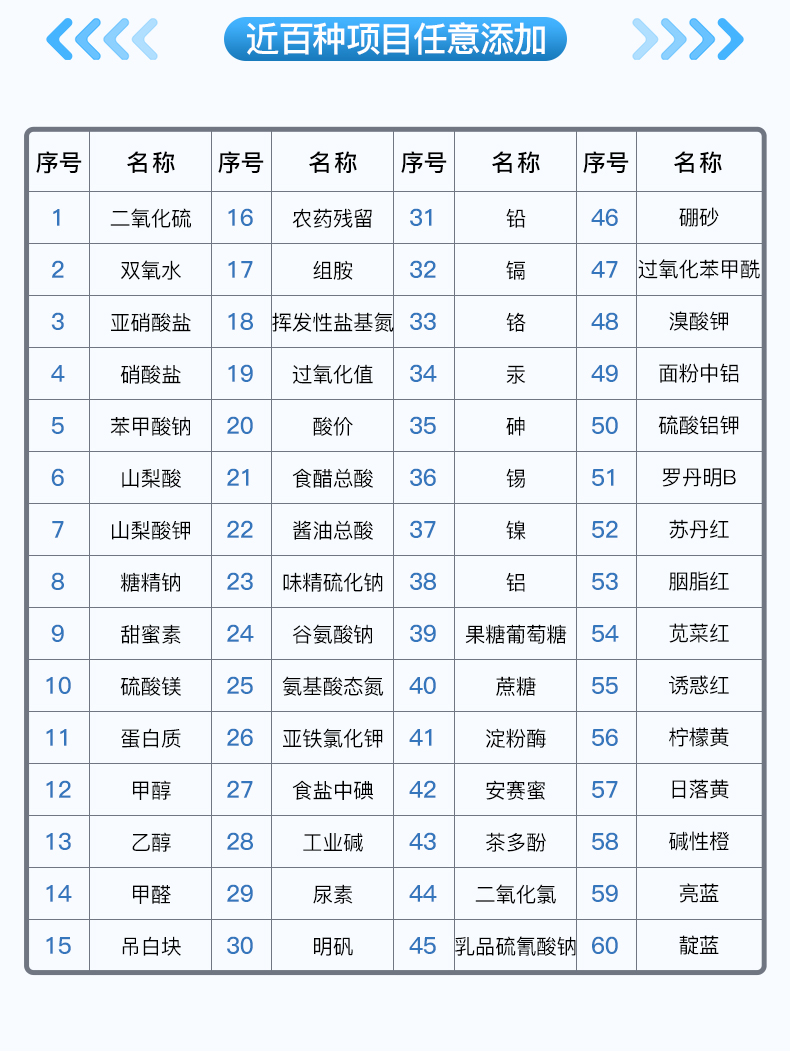 | 主控芯片采用ARM Cortex-A7,RK3288/4核处理器,主频1.88Ghz,运转速度更快速,稳定性更强。 | 直流12V供电,可连接车载电源,可配6ah大容量充电锂电池,方便户外流动测试。 | 四波长冷光源,每个通道均配置410、520、590、630nm波长光源,标配**的光路切换装置,专利光路切换功能可实现*多64波长,并且所有检测项目可实现所有通道同时检测。 | 光源亮度自动调节与校准 | 智能恒流稳压,光强自动校准,长时间连续工作光源无温漂现象 | 内置新国家限量标准,与所测结果进行现场比对,并持续更新标准 | 不间断进样,连续检测 | 样本编号自动累加。 | 检测项目可扩充。 | 检测结果可批量打印,批量上传。 | 数据无线上传平台,并可从平台导出为Excel表格。 | 检测结果存储容量20万条 | 同时支持U盘拷贝,标准USB接口,免驱动插拔。 | 可配置大容量锂电池,固件可升级。 | 仪器尺寸;42×31×20。 | 仪器净重:3.6kg。 |