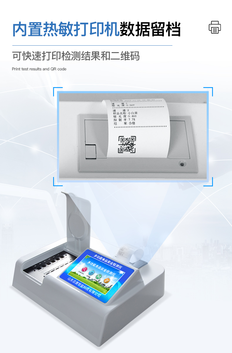 | 安卓智能操作系统,采用更加**和人性化操作,仪器具有网线连接、wifi联网上传、GPRS无线远传功能,快速上传数据。 | 能够在同一软件下实现所有检测项目的检测,并可通过同一窗口直观显示检测结果。 | 智能化程度高,仪器具有自检功能:具有开机自检和调零功能,具有自动检测重复性功能。 | 检测通道:≥12个检测通道,可以同时测试多个样品,每个样品由程序控制分别独立工作,不会互相干扰。 | 显示方式:≥7英寸液晶触摸屏显示,人性化中文操作界面,读数直观、简单。 | 配备新一代嵌入式热敏打印机,可选择手动打印或者自动打印,检测完成可自动打印检测报告和二维码。 | 光源采用进口超高亮发光二极管,高精度、稳定性强、光源可控、可以关掉不使用的光源,功耗更低。 | 采用USB2.0接口设计,方便数据的存贮和移动,并可随时与计算机直接相连,并且可用计算机控制仪器。实现数据查询、浏览、分析、统计、打印 |