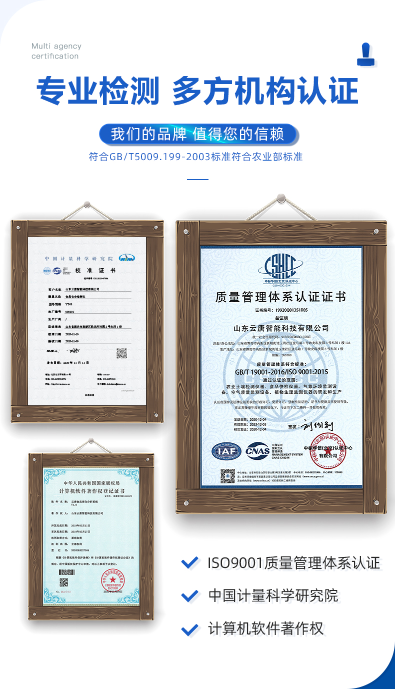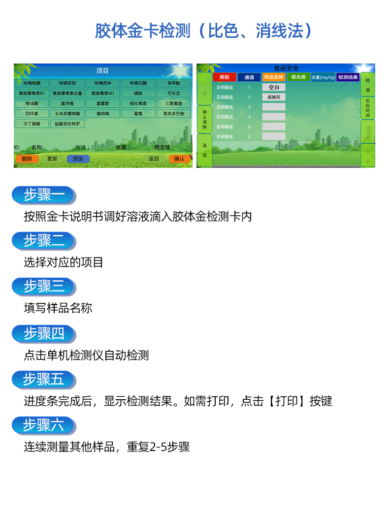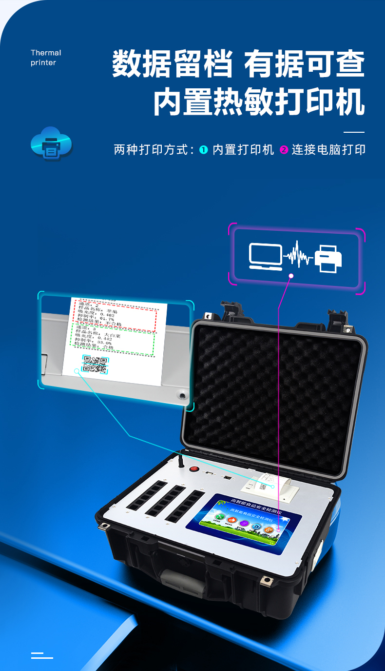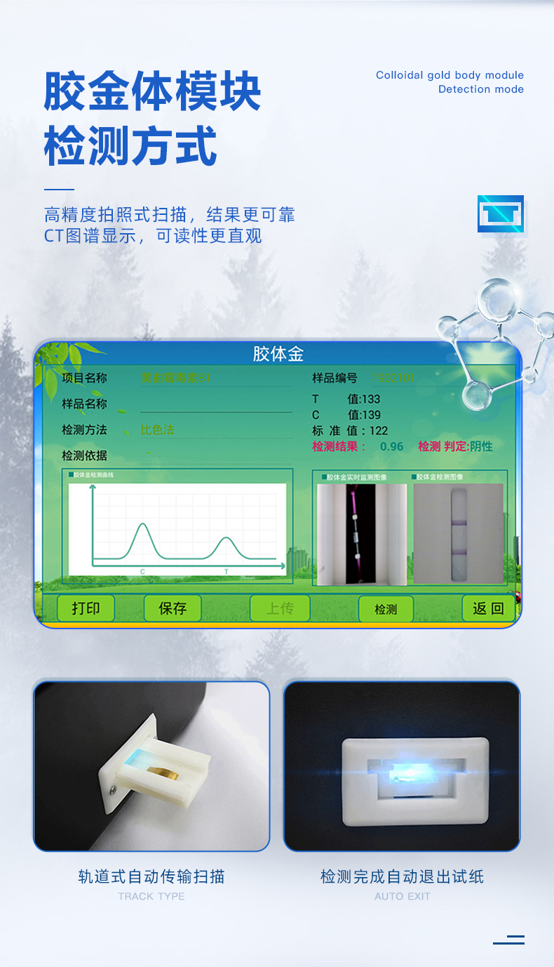 安卓智能操作系统,采用更加**的UI交互界面,仪器具有wifi联网上传、4G联网传输、GPRS无线远传、网线连接功能,快速批量上传数据。 | 智能化程度高,仪器具有自检功能:具有开机自检和调零功能,具有自动检测重复功能。 | 新一代高速热敏打印机,检测完成可自动打印和批量打印检测报告和二维码。 | 仪器带有监管平台,数据可局域网和互联网数据上传,检测结果直接传至食品安全监管平台。进行区域食品安全监管及大数据分析处理与数据统计,检测区域食品安全长短期动态,达到食品安全问题预估、预警 | 一体化主机,包含光电比色测模块、胶体金免疫层析检测模块。 | 一体化便携式快检设备,满足现场及流动检测使用需求,能够在同一软件下实现所有检测项目的检测,并可通过同一窗口直观显示检测结果。 | 胶体金模块检测方式:轨道式自动传输扫描,检测完成后自动退出检测卡。 | 食品安全检测仪CT线自动识别,无需手动调整,检测完成自动显示CT坐标曲线。 | 内置强大的数据库,具有多品类多种类样品菜单功能,可灵活选择检测样品,不同的检测通道可同时检测不同的样品项目。也可在仪器上直接编辑录入样品名称、检测指标、检测单位等信息并保存进样品数据库。 | 仪器内置操作演示视频,是您身边的化验指导专家。 | 仪器具有自身保护功能,可设置用户名及密码,防止非工作人员操作等。 | 样品处理简单省力,整体操作快速、安全、便捷。 | 高灵敏度,高检测精度,高重复性精度,扫描式高精度光学传感器。 | 结果判定线可修改,对照值标定值可保存,断电不丢失数据。 | 兼容市场上所有的胶体金卡,使用耗材不受限制,极大增强用户使用体验。 | 仪器具有重新校准、锁定、恢复出厂设置功能。 |
